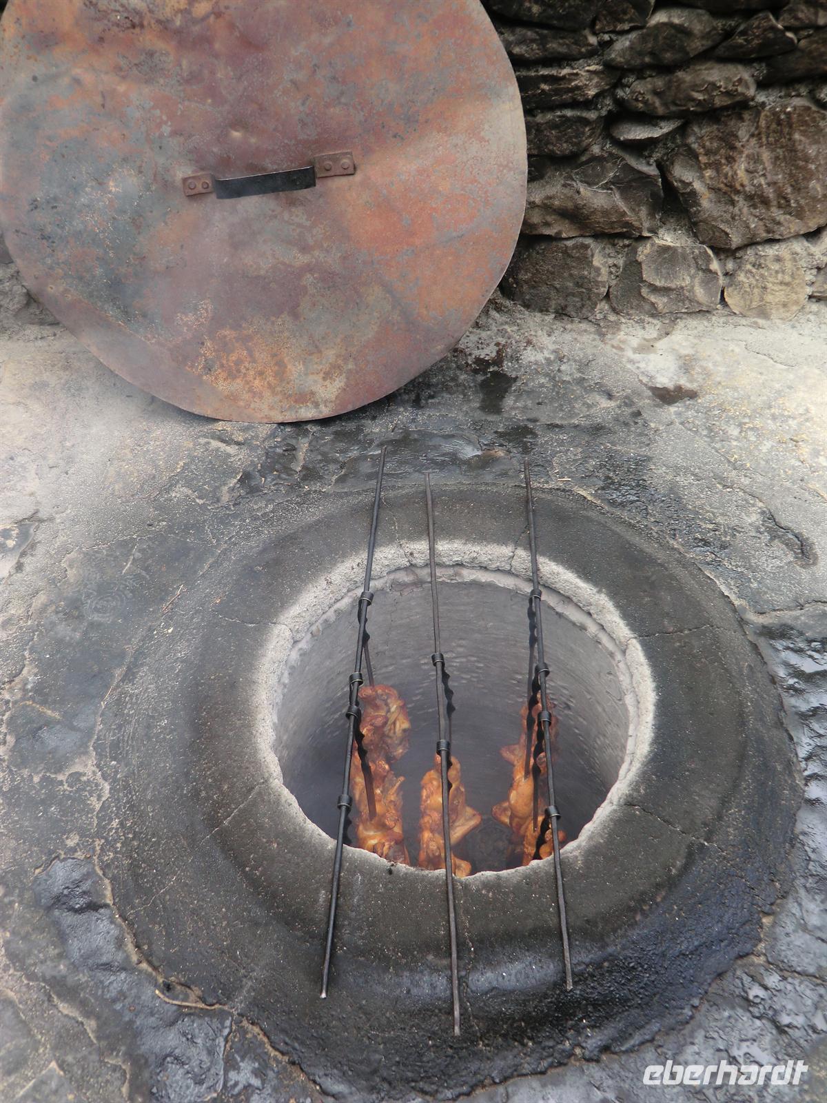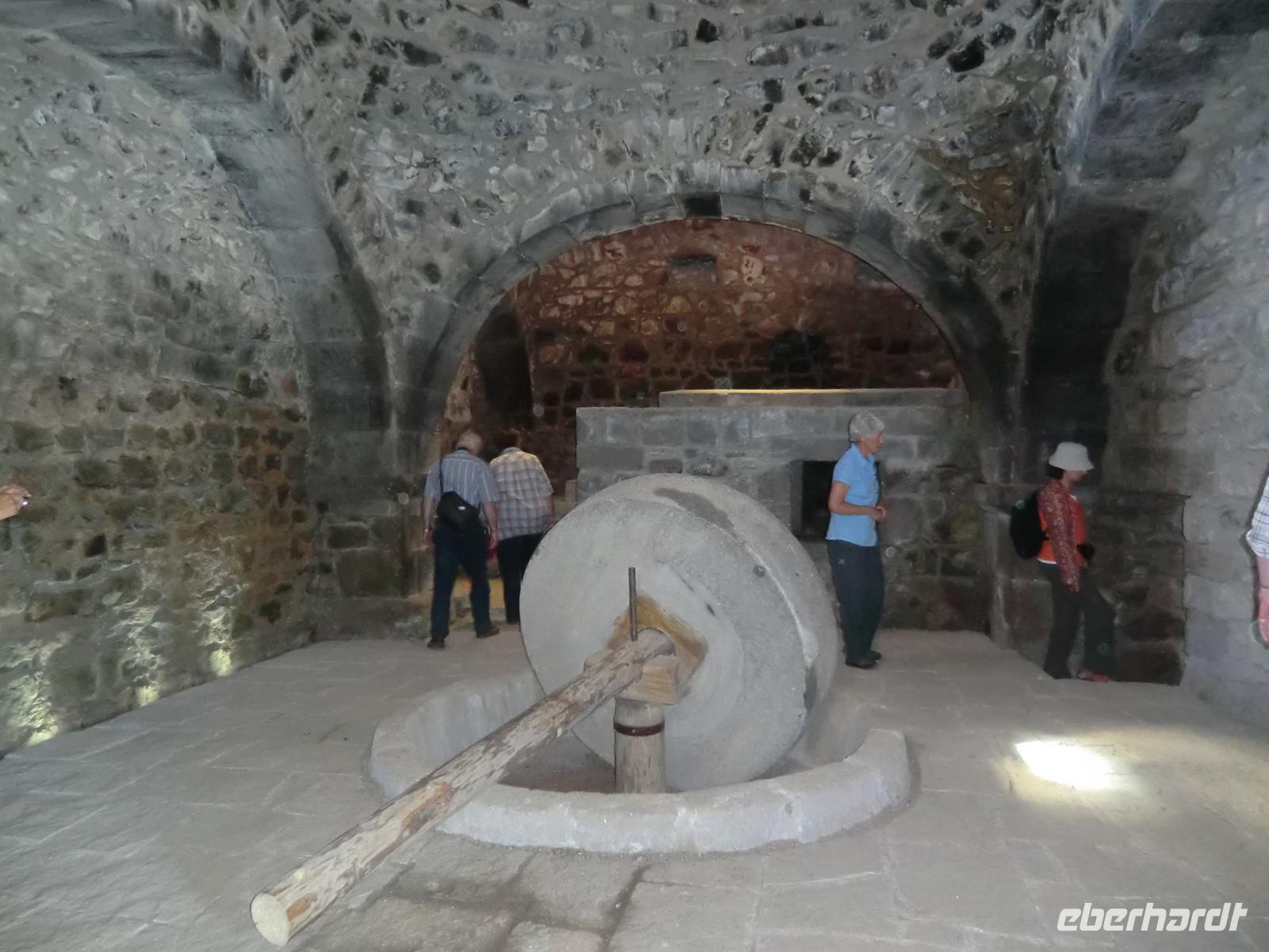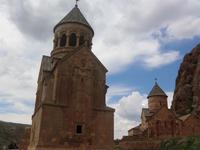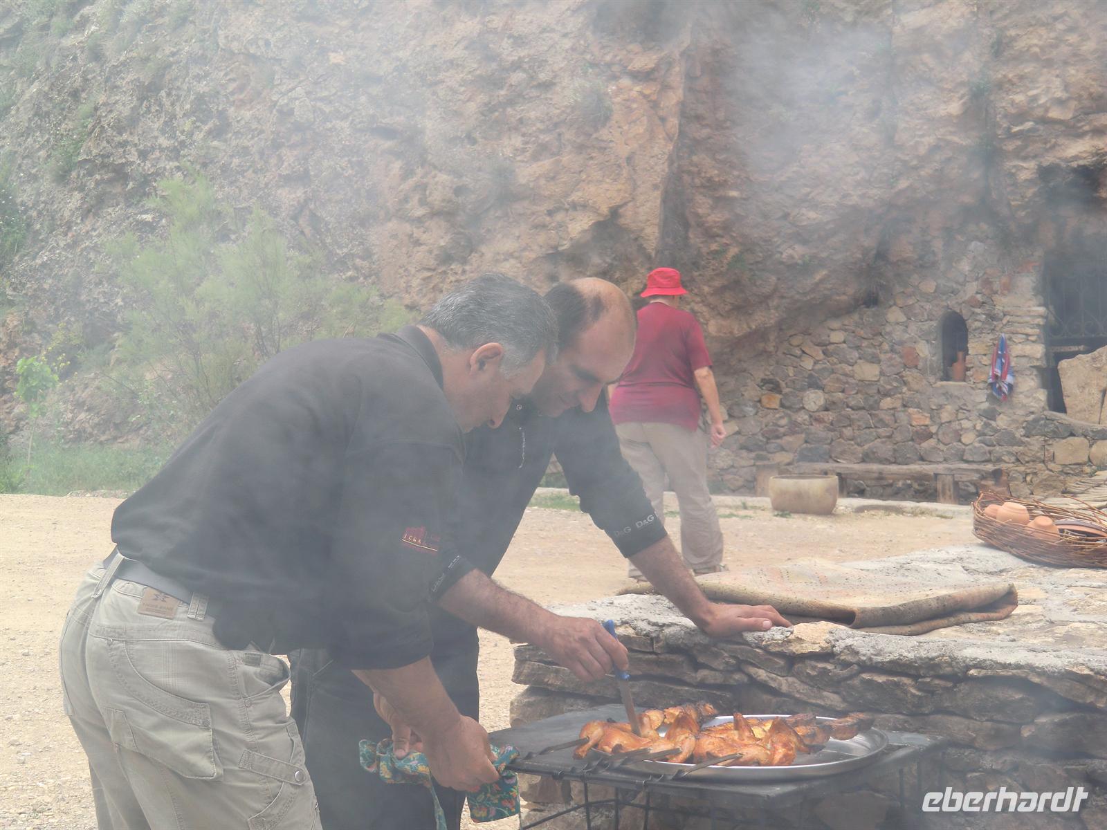 Am heutigen Tag schloss sich der Kreis, da wir wieder in Richtung Hauptstadt fuhren. Auf halbem Weg machten wir einen Abstecher zum Kloster von Noravank. Eingebettet in die schroffe Felsschlucht wirkten die kleinen malerischen Kirchen wie kleine Märchenschlösser. Ein wahrer Höhepunkt dieser wunderbaren Reise! Zum Mittagessen wurden wir bereits am Tonir vor einem kleinen Höhlencafé erwartet. Da Narine unser Eintreffen weitergeleitet hatte, kamen wir gerade pünktlich zur Öffnung des Tonofens, der sich unter der Erde befand. Zum Vorschein kamen köstlich duftende Hähnchenspieße, die wir uns im Anschluss frisch gebackenem Brot, Schafskäse und Tomaten schmecken ließen. Da heute in Deutschland der „Männertag“ anstand gab es für die sieben Herren unserer Runde kleine Kognakfläschen und für die Damen Pfirsichlikör als kleine Aufmerksamkeit von Eberhardt TRAVEL. Ehe wir zum nächsten kulinarischen Ereignis fuhren unternahmen wir noch einen kleinen Verdauungsspaziergang durch die pittoreske Schlucht. In Areni angekommen verkosteten wir in einer Weinkellerei sechs Sorten armenischen Weines. Mein persönlicher Favorit war der fruchtig herbe Granatapfelwein.