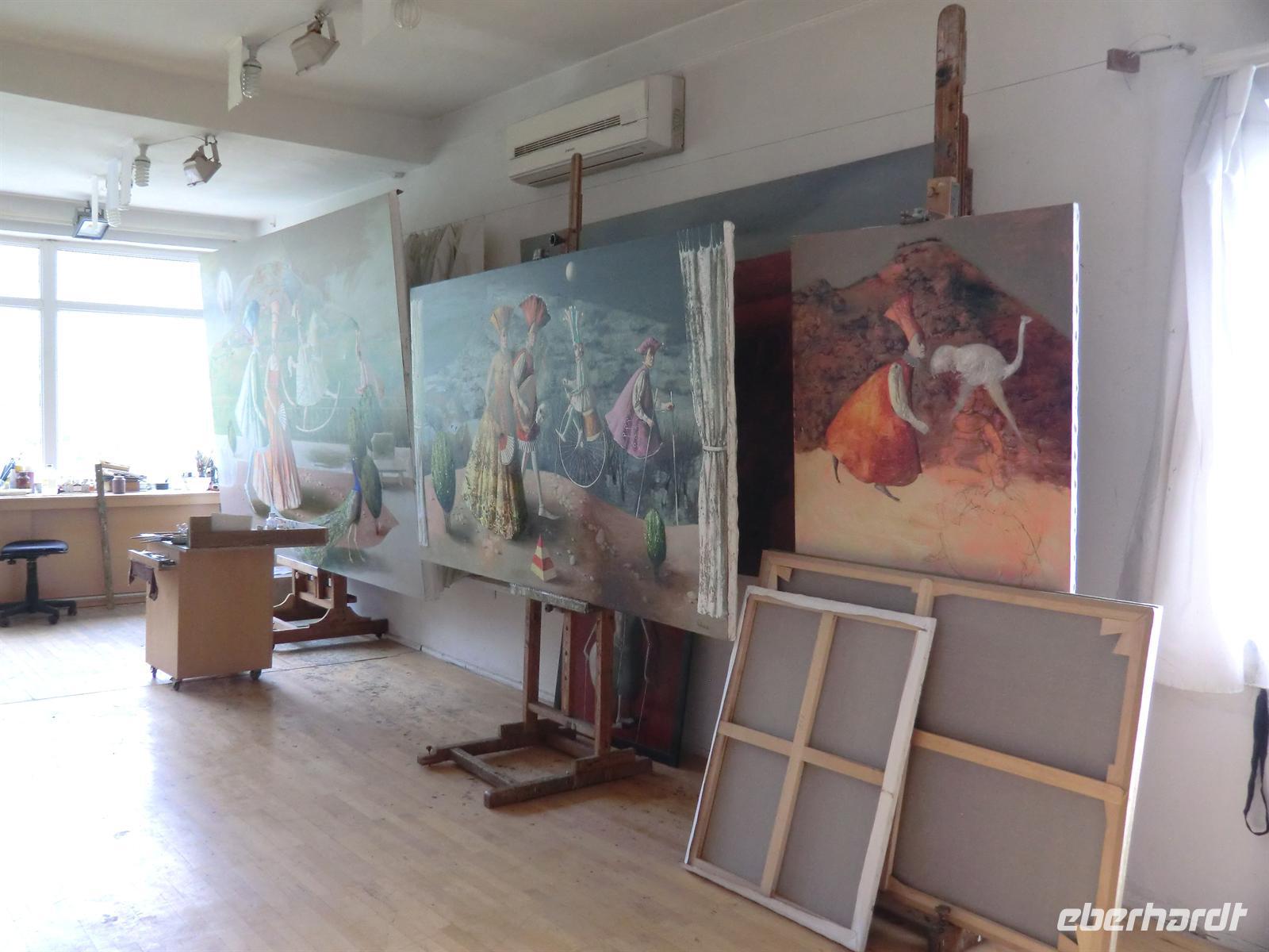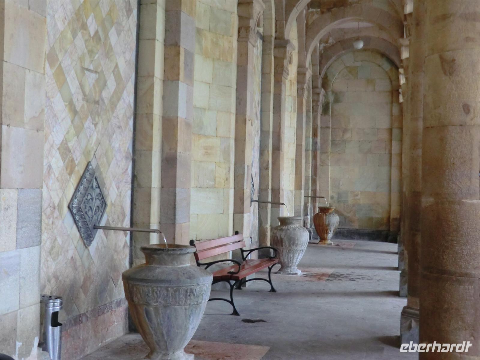 Heute führte uns die Fahrt an die türkische Grenze zum idyllisch am Fuß des Ararat gelegenen Kloster „Khor Virap“. Von einer kleinen Anhöhe aus konnten wir einen herrlichen Blick auf die Berge, die Ebene und den angrenzenden Friedhof der Ortschaft genießen. Während der Weiterfahrt durch die ländliche Gegend wurde uns die Armut des Landes zum ersten Mal augenscheinlich bewusst. Die Arbeitslosenrate liegt realistisch gesehen bei über 50 % und 76 % der Bevölkerung leben trotz einer Erwerbstätigkeit unter dem Existenzminimum. Besonders stolz ist man auf insbesondere auf dem Land auf die nationale Vielfalt an Obst. So gibt es unter anderem 15 Sorten an endemischen Aprikosen, deren Farbe auch in der Flagge Armeniens wiederzuerkennen ist. Uns war zuvor nicht bewusst, dass der lateinische Begriff der Aprikose zu Deutsch mit „armenische Pflaume“ zu übersetzen ist. Weitere Höhepunkt des heutigen Tages waren die Kathedrale von Etschmiatsin, die Kirche St. Hripsime und die Tempelruinen von Zvartnots. Zurück in Yerevan angekommen stiegen wir in einen kleineren Bus um, der uns die engen schwer zu befahrenden Straßen bis zum Anwesen eines Malers vor die Tore der Stadt brachte. Der Künstler führte uns durch seine „heiligen Hallen“ und bot uns einen Einblick in seine künstlerische Schaffenswelt. Auf der Veranda wurden wir nach dem Kunstgenuss noch mit leckerem Granatapfelsaft und armenischem Gebäck verköstigt ehe es zurück zum Hotel ging. Nach dem Abendessen ließen wir den Tag im belebten Zentrum der Stadt am „singenden Brunnen“ ausklingen und genossen das farbenprächtige Musikspektakel der Fontänen.