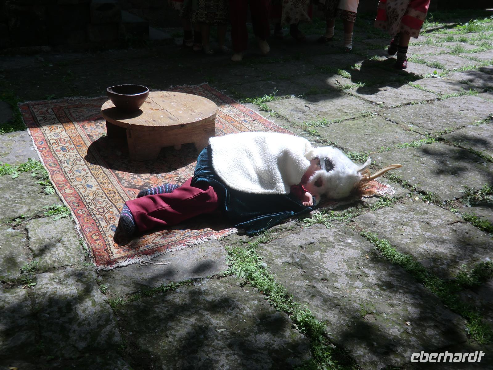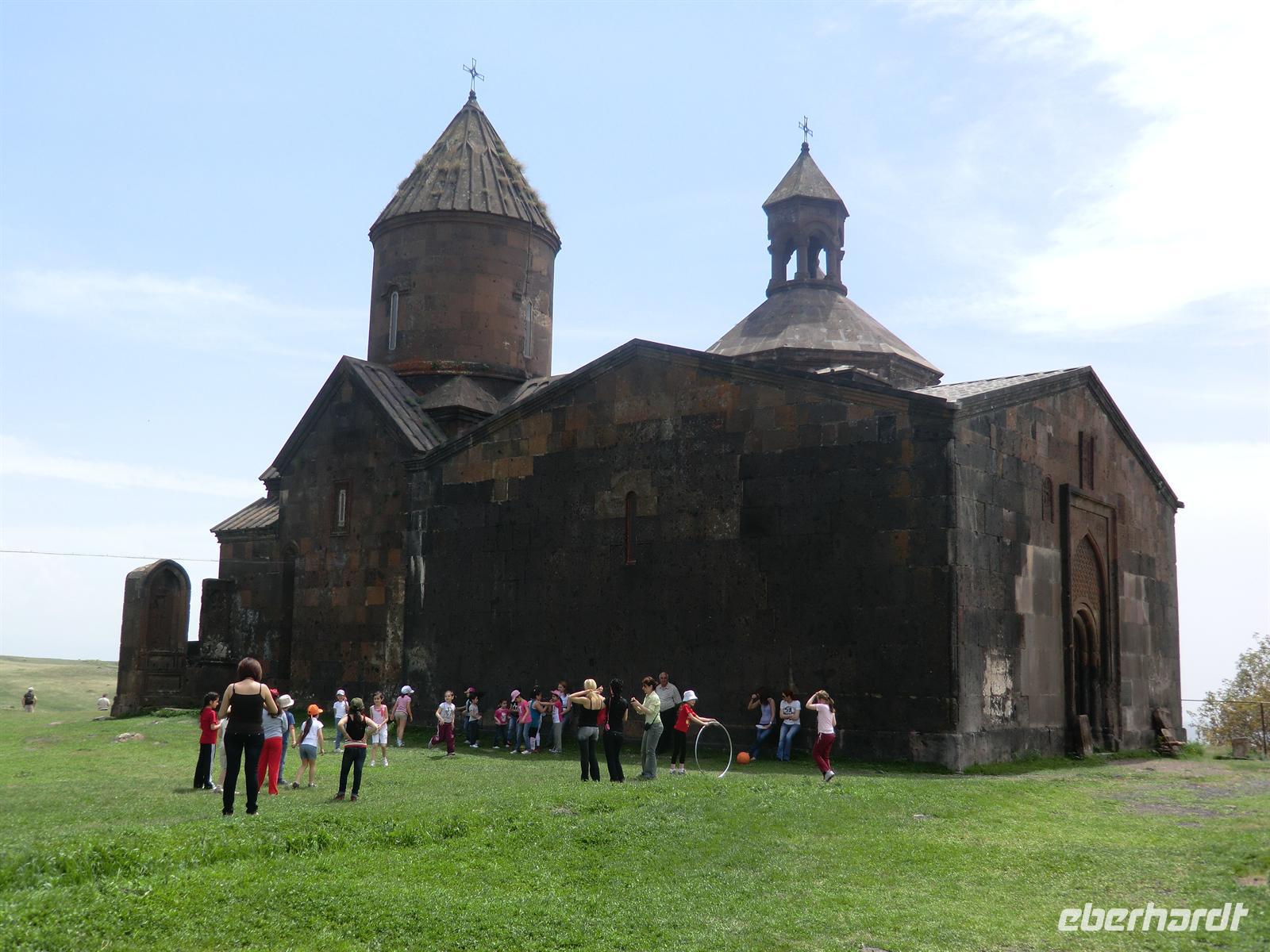 Nach dem Frühstück und einem kurzen Stromausfall im Hotel kehrten wir der Hauptstadt Armeniens den Rücken und fuhren gen Norden, wo wir unseren ersten Stopp in dem kleinen Örtchen Aschtarak machten, um eine der kleinsten Kirchen des Landes zu begutachten. Im Anschluss wurde uns von unserer Reiseleiterin Narine eine kulturelle Überraschung versprochen, die uns alle sehr neugierig machte. Von der kleinen Anhöhe der Kirche aus führte die Dorfstraße hinunter zu einem Gehöft, in dessen Innerem ein regionales ethnografisches Museum beheimatet ist. Empfangen wurden wir von einer Dame in rotem Gewand, die uns herzlich begrüßte und uns eine Darbietung des Tanz- und Theaterensembles ankündigte. Eine kleine Gruppe von Kindern und Jugendlichen brachte uns auf wunderbar unterhaltende Art und Weise die Inhalte und Bedeutungen der Frühlingsfeste Armeniens nahe. Als besondere Leckerei durften wir ein Stück vom Osterkuchen probieren. Im Teig versteckt wurde eine Münze gebacken, dessen Finder im kommenden Jahr besonderes Glück haben sollte.