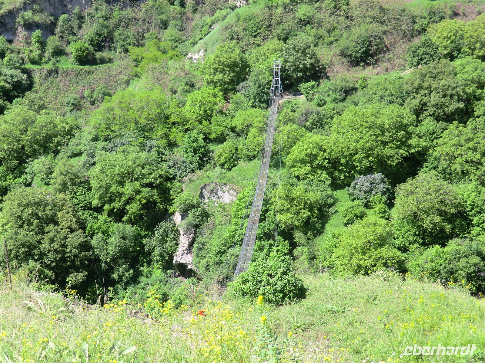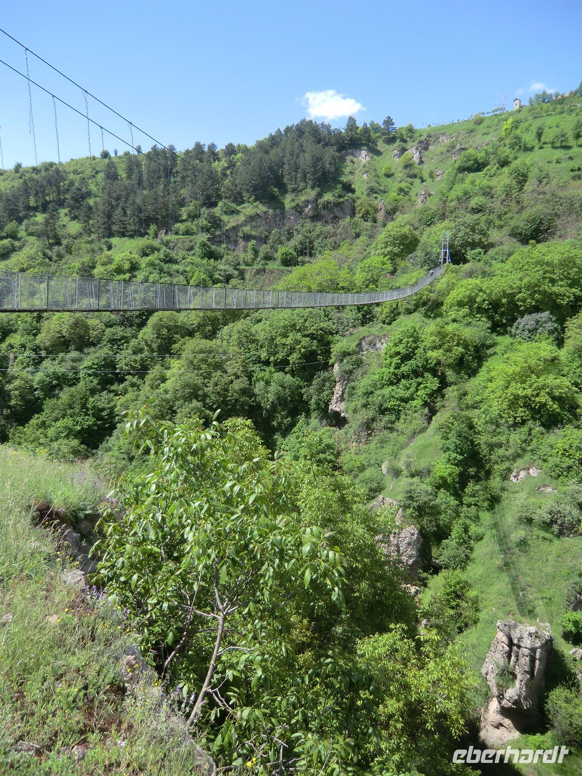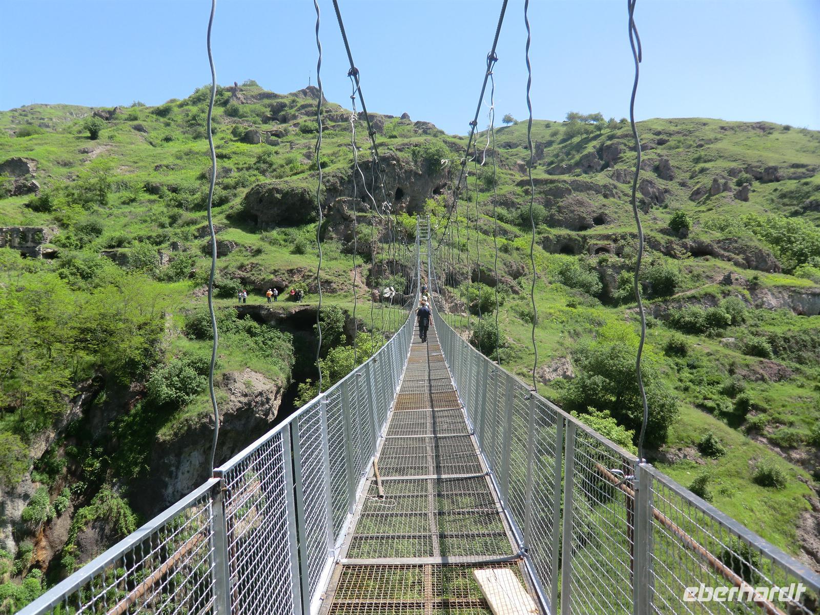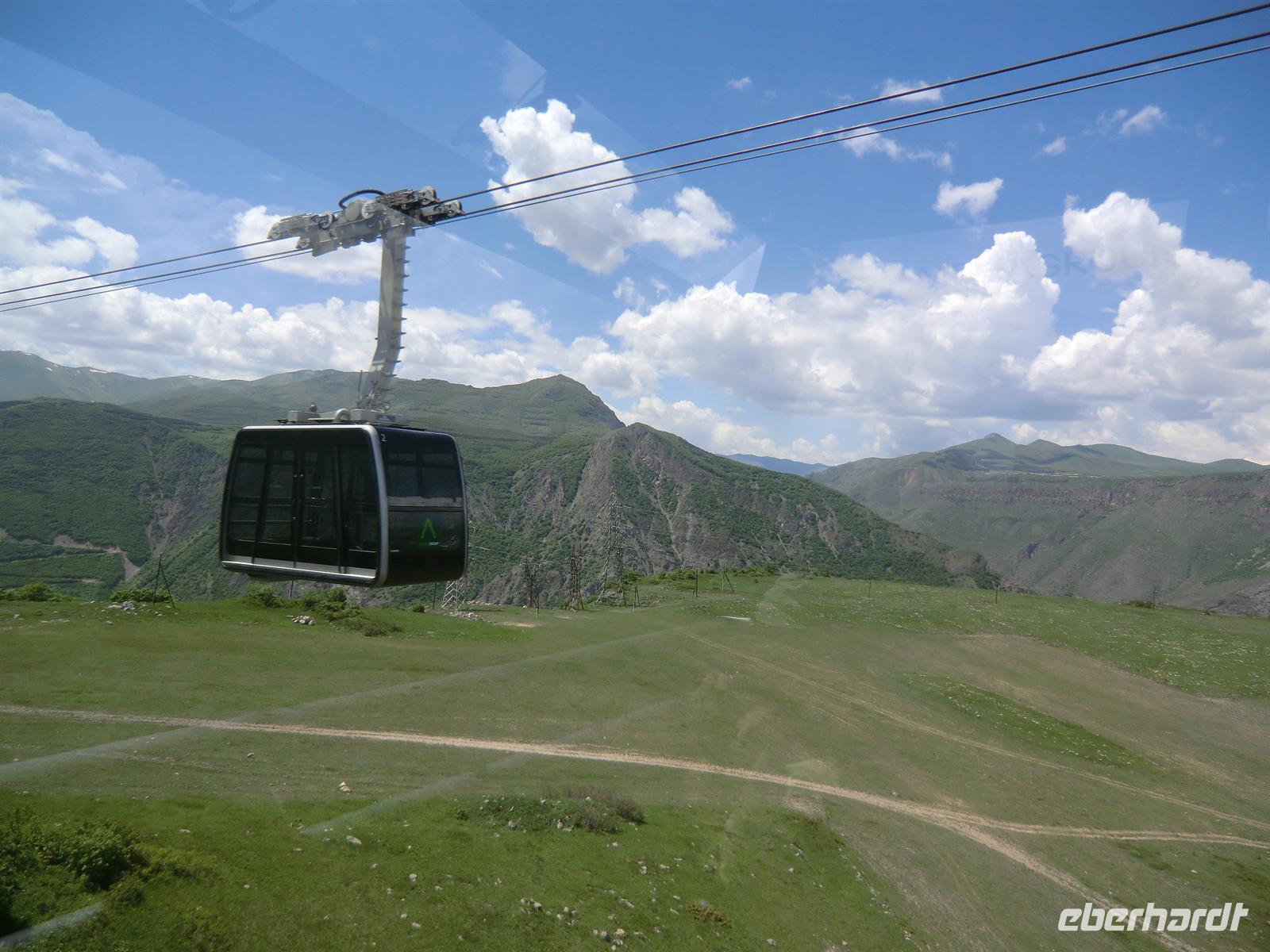 Ich denke ich übertreibe nicht wenn ich gleich vorab sage, dass wir heute einen landschaftlichen Höhepunkt schlechthin erlebt haben. Bei Kaiserwetter durchwanderten wir das ehemalige Höhlendorf von Khndzoresk, das zu Beginn des 20. Jahrhunderts rund 11.000 Einwohner zählte. Über einen gut begehbaren Pfad stiegen wir über satte grüne Wiesen hinab bis zu einer Hängebrücke, die erst vor einigen Tagen für Fußgänger eröffnet wurde. Die 160 Meter lange Brücke schwebt 60 Meter über dem Boden und wurde von unserem Hotelbesitzer in Auftrag gegeben. Dieser wurde vor 70 Jahren in einer dieser Höhlen geboren. Heute ist er ein wohlhabender Mann, der durch aufgrund verschiedener Geschäfte (unter anderem die Etablierung einer Getreidemühle) in der Region zu Geld gekommen ist. Nachdem wir die Stabilität der Hängebrücke getestet hatten, ging es im Sonnenschein zurück zum Bus, wo wir uns an dem kleinen Dorfkiosk mit einem leckeren Eis belohnten. Am Mittag fuhren wir dann mit zwei Kleinbussen in Richtung Halidsor, von aus eine Seilbahn die Worotan-Schlucht überspannt und im Dorf Tatev endet. Nach einer fulminanten dreizehnminütigen Fahrt erreichten wir das Kloster von Tatev. In einem kleinen Restaurant auf dem Gipfel neben dem Kloster wartete bereits ein reich gedeckter Tisch auf uns. In einem kleinen Bierzelt mit Panoramablick auf das Kloster und die umliegenden Berge genossen wir typisch armenische Hausmannskost. Alles stammte aus hauseigener Produktion: frisch gepresster Saft, eingelegter Kürbis, Kräuterteigtaschen und gegrilltes Schweinefleisch. Nach einer Klosterführung und Fotostopps an der Teufelsbrücke und einer kleinen Kapelle fuhren wir entlang der steilen in den Fels gehauenen Serpentinen zurück zu unserem Hotel. Nach dem Abendessen referierte Narine im Festsaal des Hotels zum Thema „Berg Karabach“ und beantwortete sämtliche Fragen unserer Gruppe zu geschichtlichen und gesellschaftskritischen Themen.