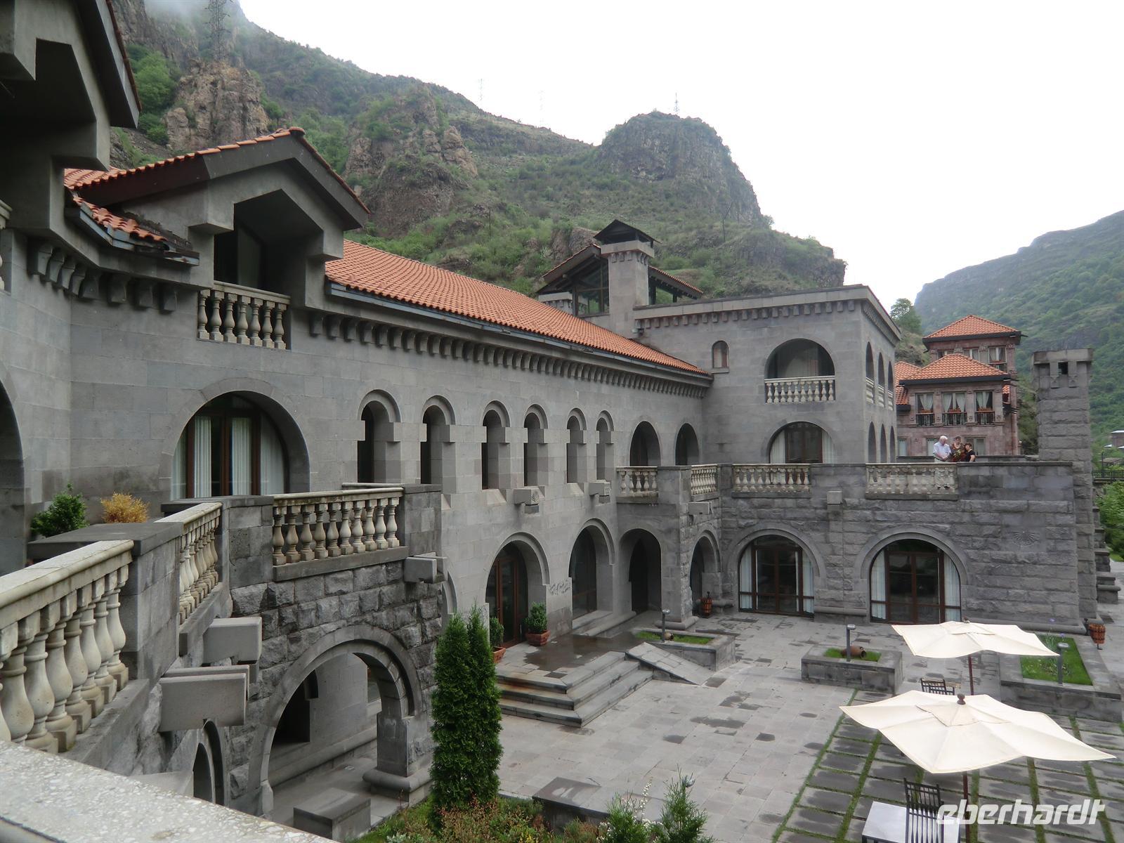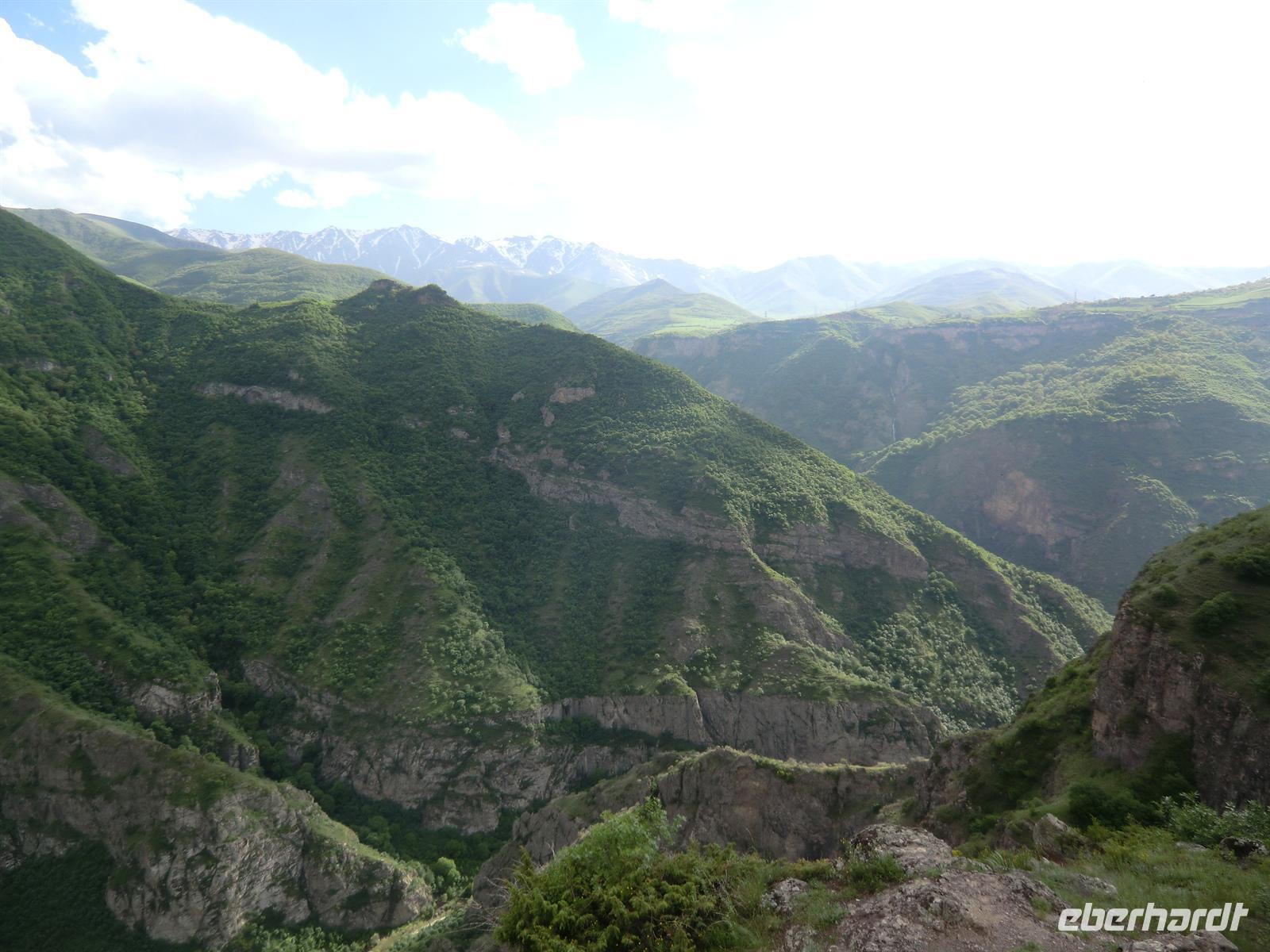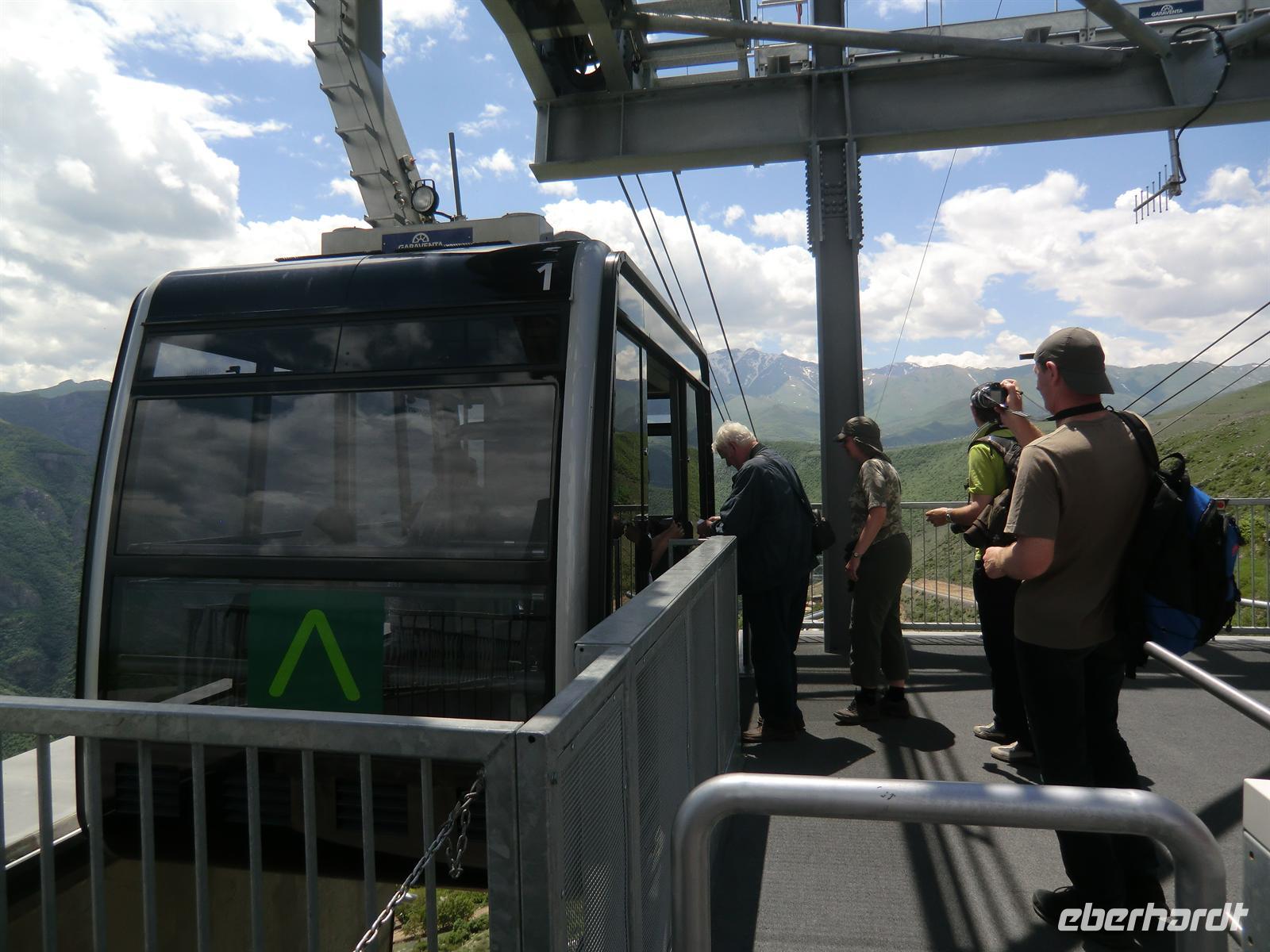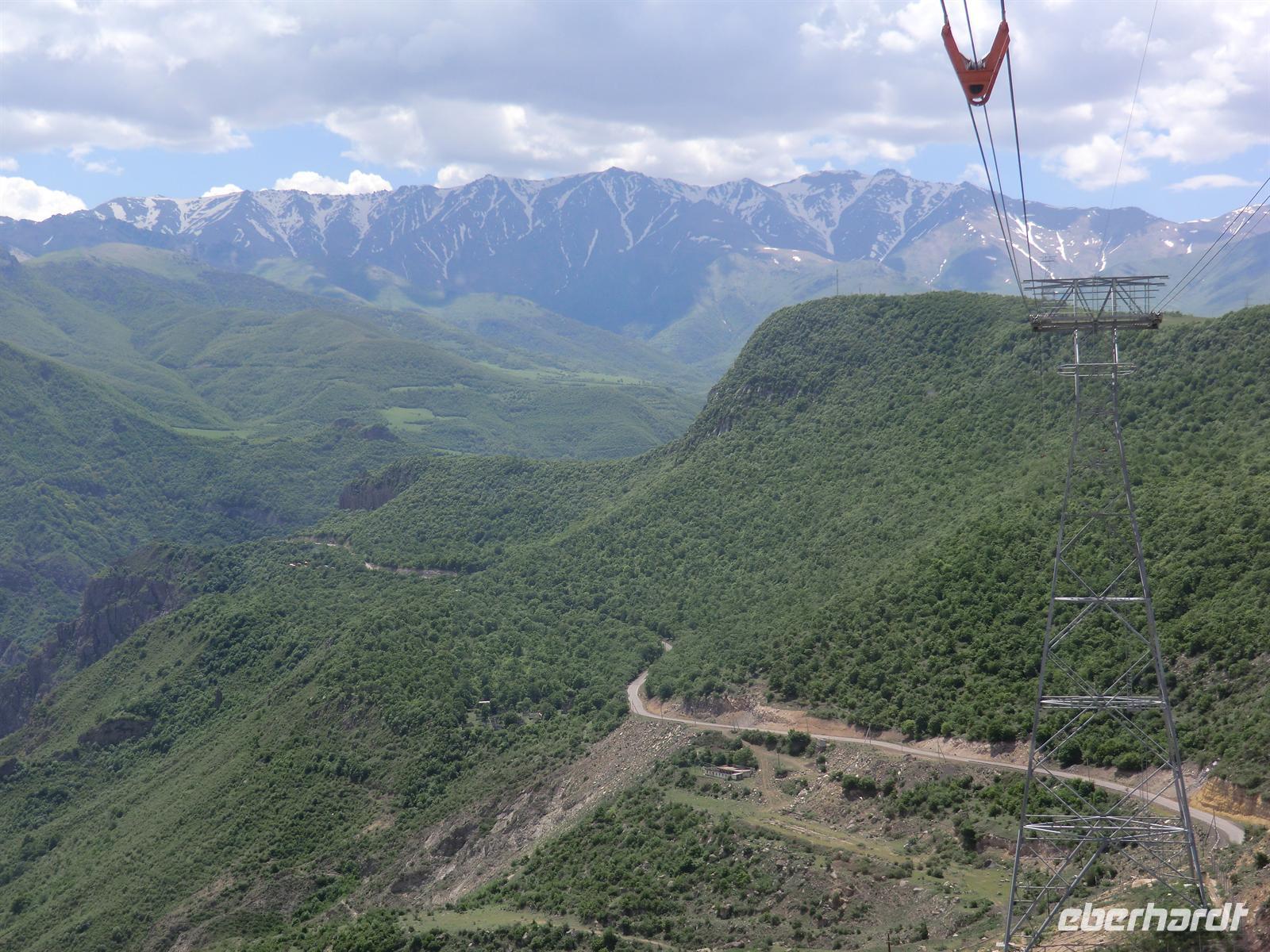 Ich denke ich übertreibe nicht wenn ich gleich vorab sage, dass wir heute einen landschaftlichen Höhepunkt schlechthin erlebt haben. Bei Kaiserwetter durchwanderten wir das ehemalige Höhlendorf von Khndzoresk, das zu Beginn des 20. Jahrhunderts rund 11.000 Einwohner zählte. Über einen gut begehbaren Pfad stiegen wir über satte grüne Wiesen hinab bis zu einer Hängebrücke, die erst vor einigen Tagen für Fußgänger eröffnet wurde. Die 160 Meter lange Brücke schwebt 60 Meter über dem Boden und wurde von unserem Hotelbesitzer in Auftrag gegeben. Dieser wurde vor 70 Jahren in einer dieser Höhlen geboren. Heute ist er ein wohlhabender Mann, der durch aufgrund verschiedener Geschäfte (unter anderem die Etablierung einer Getreidemühle) in der Region zu Geld gekommen ist. Nachdem wir die Stabilität der Hängebrücke getestet hatten, ging es im Sonnenschein zurück zum Bus, wo wir uns an dem kleinen Dorfkiosk mit einem leckeren Eis belohnten. Am Mittag fuhren wir dann mit zwei Kleinbussen in Richtung Halidsor, von aus eine Seilbahn die Worotan-Schlucht überspannt und im Dorf Tatev endet. Nach einer fulminanten dreizehnminütigen Fahrt erreichten wir das Kloster von Tatev. In einem kleinen Restaurant auf dem Gipfel neben dem Kloster wartete bereits ein reich gedeckter Tisch auf uns. In einem kleinen Bierzelt mit Panoramablick auf das Kloster und die umliegenden Berge genossen wir typisch armenische Hausmannskost. Alles stammte aus hauseigener Produktion: frisch gepresster Saft, eingelegter Kürbis, Kräuterteigtaschen und gegrilltes Schweinefleisch. Nach einer Klosterführung und Fotostopps an der Teufelsbrücke und einer kleinen Kapelle fuhren wir entlang der steilen in den Fels gehauenen Serpentinen zurück zu unserem Hotel. Nach dem Abendessen referierte Narine im Festsaal des Hotels zum Thema „Berg Karabach“ und beantwortete sämtliche Fragen unserer Gruppe zu geschichtlichen und gesellschaftskritischen Themen.