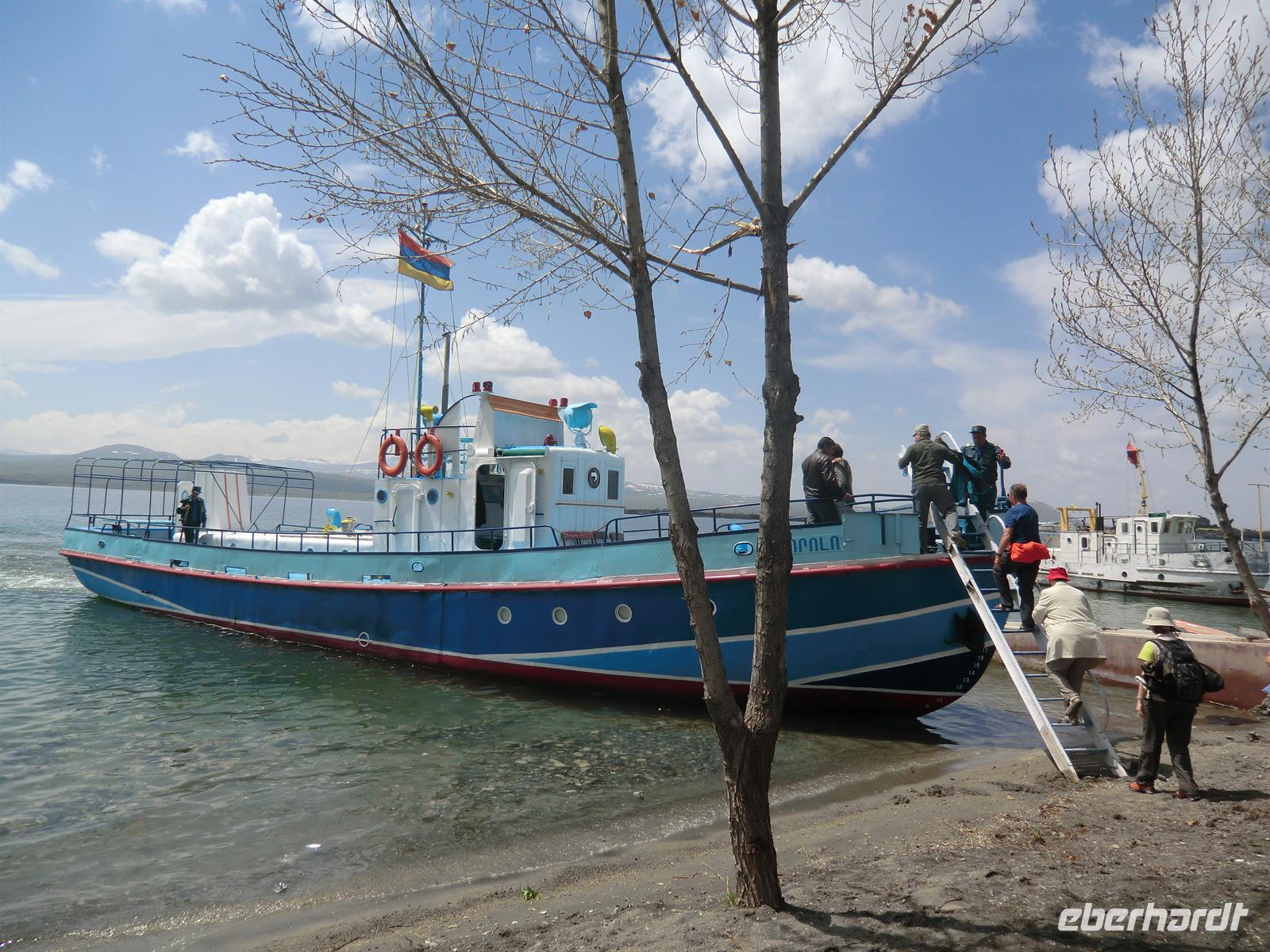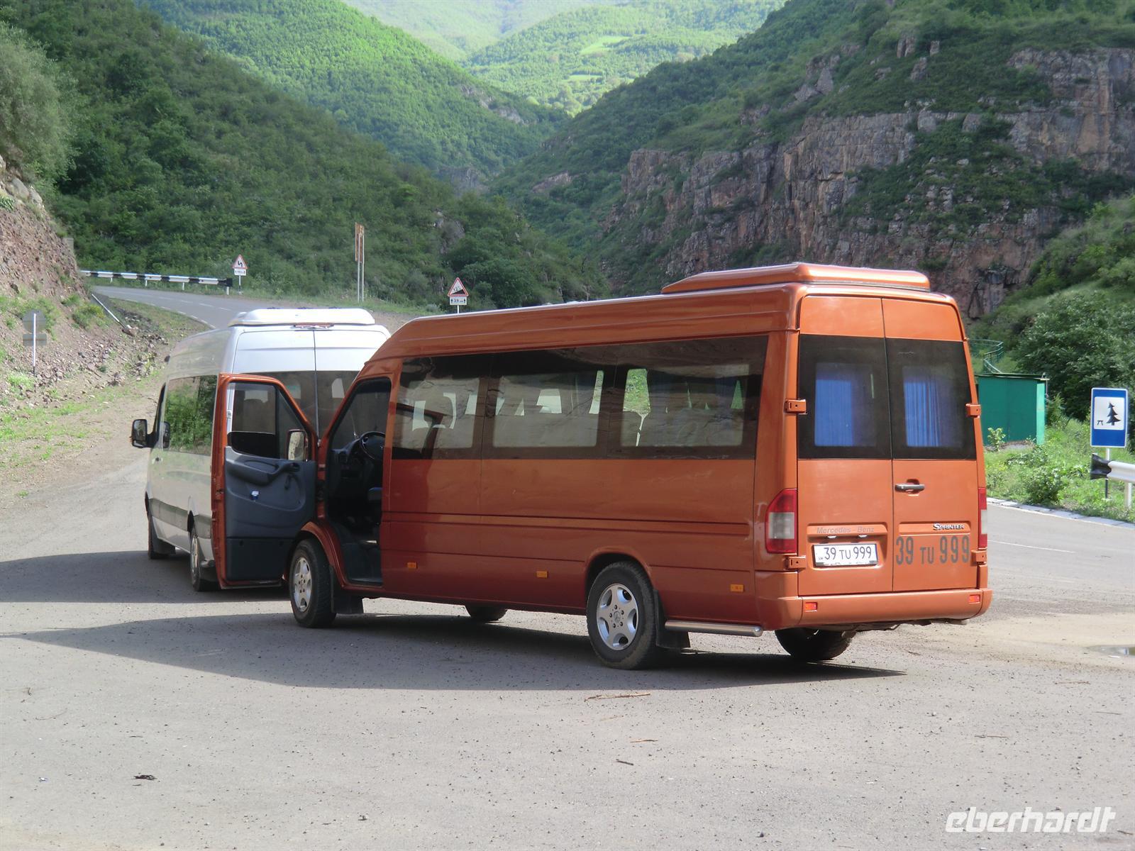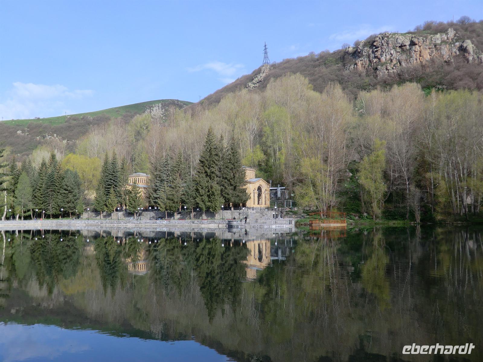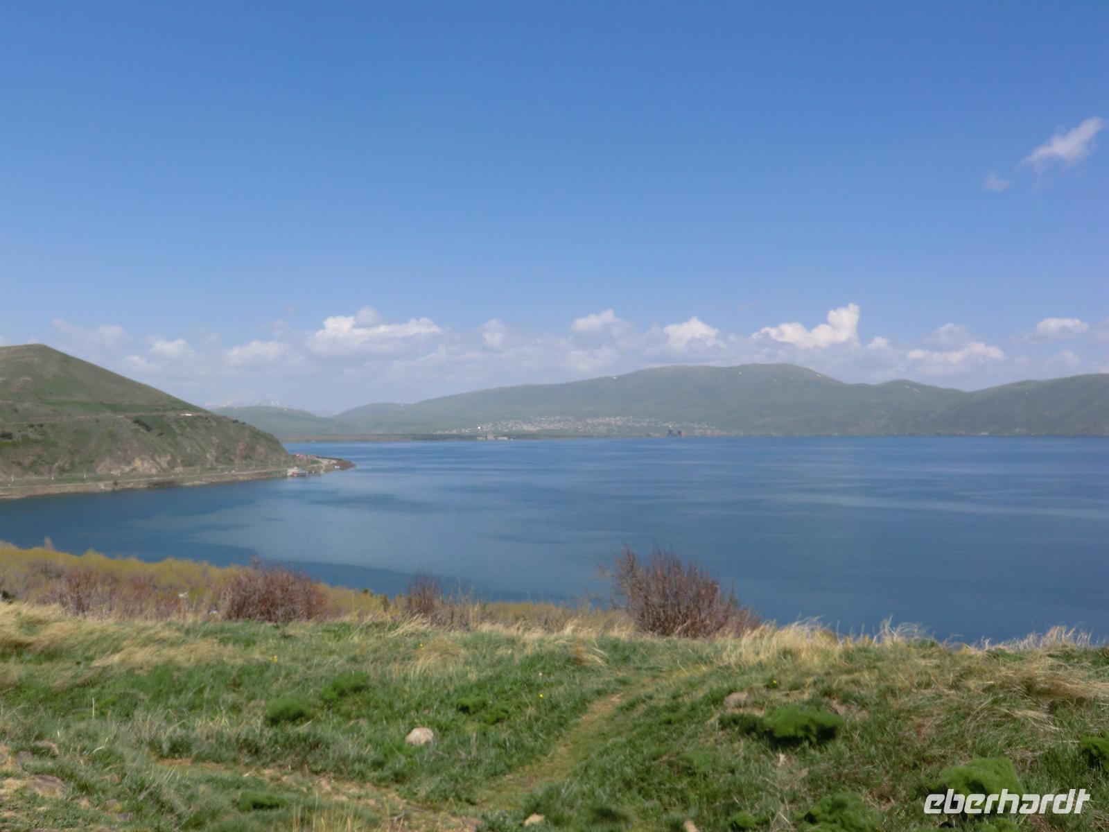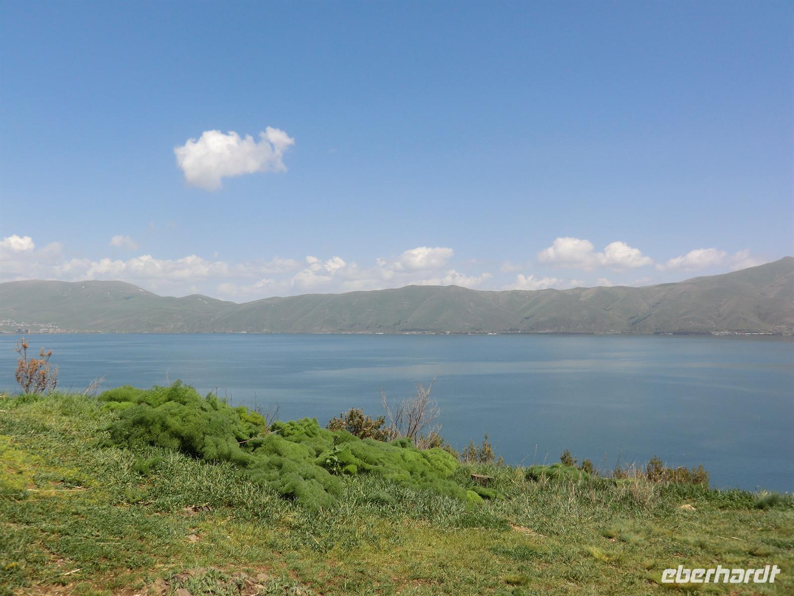 Unsere heutige Fahrt führte uns vom Luftkurort Dilijan zum Thermalkurort Jermuk. Zunächst durchfuhren wir den mit 2,8 Kilometern Länge längsten Tunnel des Landes ehe wir den Sevansee erreichten. Mit seiner Lage in Höhe ist es der drittgrößte Hochgebirgssee der Welt. Auf der Zufahrtsstraße zum See standen rechts und links vom Straßenrand vereinzelt armenische Männer, die mit einer Art geheimen Zeichensprache den vorüberfahrenden Autos anzeigten, dass sie Fisch in verschiedenen Größen zum Verkauf anboten. Diese heimliche Vorgehensweise resultiert zum einen aus dem Verbot der Fischerei am See als auch des Verkaufs dieses Fisches.