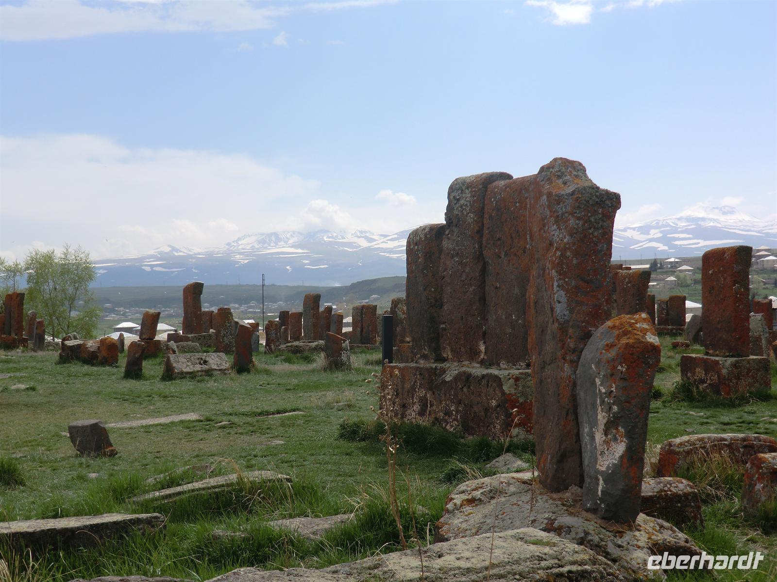 Bei strahlendem Sonnenschein steigen wir die rund 200 Stufen zum malerisch an der Westküste des Sees gelegenen Kloster Sevanavank hinauf, um von oben die Weite des Sees und die mit Schnee bedeckten Gipfel der umliegenden Bergketten zu bestaunen. Das tolle Wetter nutzten wir sogleich für ein nettes Gruppenbild vor dieser wunderschönen Kulisse. Zurück am Ufer angekommen unternahmen wir eine einstündige Bootsfahrt. Nach einem leckeren Fischessen fuhren wir weiter in Richtung Osten. Weitere Besichtigungspunkte waren die einzigartigen Kreuzsteine auf dem Friedhof von Noratus und die ehemalige Karawanserei am Selim Pass. Während der Überquerung des in 2.400 Meter Höhe liegenden Passes konnten wir auf beiden Seiten der gut befahrbaren Straße weitere Überreste der ehemaligen Seidenstraße in Form von zerfallenen Brücken und weiterer Karawansereien sehen. Unser Sanatorium-Hotel „Olympia“ erreichten wir um 18:45 Uhr.