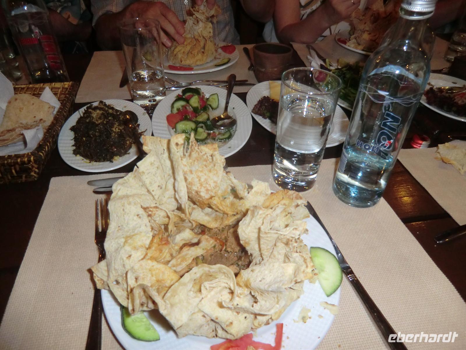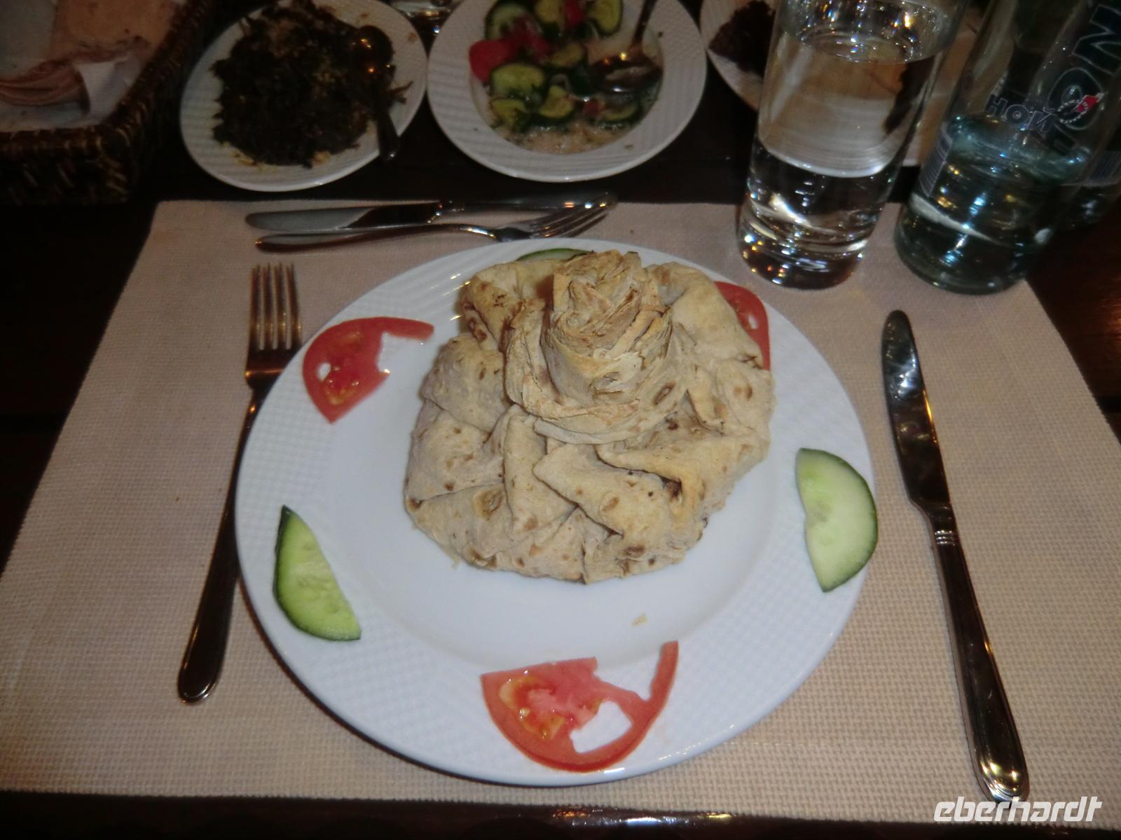 Zu Abend waren wir dann gänzlich in Armeniens kulinarischer Welt angekommen. Zum Essen im Restaurant „Yerevan Pandok“ servierte man uns frische Kräuter, Joghurtsuppe, frisch gebackene mit Lammfleisch gefüllte Teigtaschen und honigsüße Baklava.