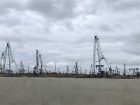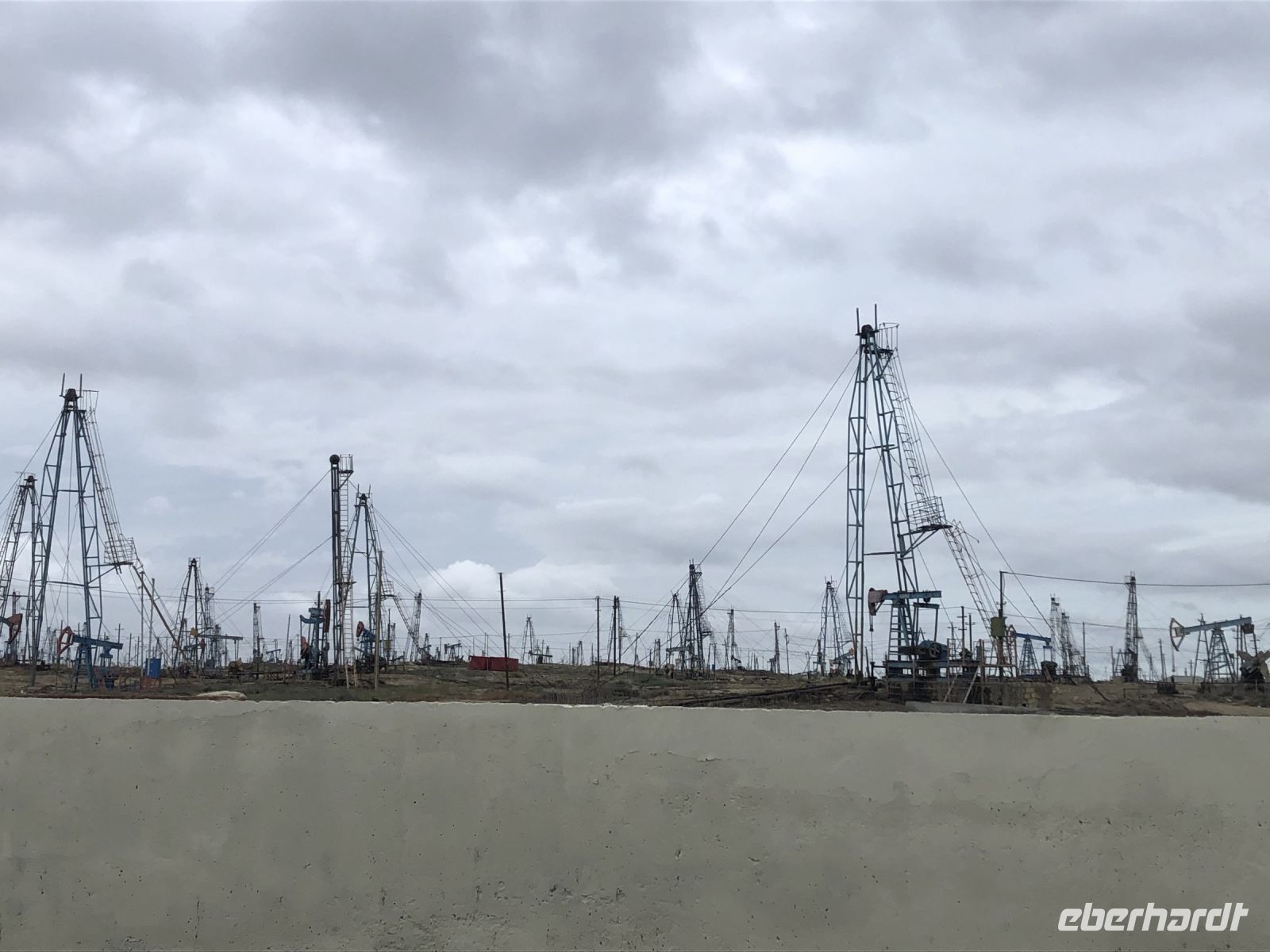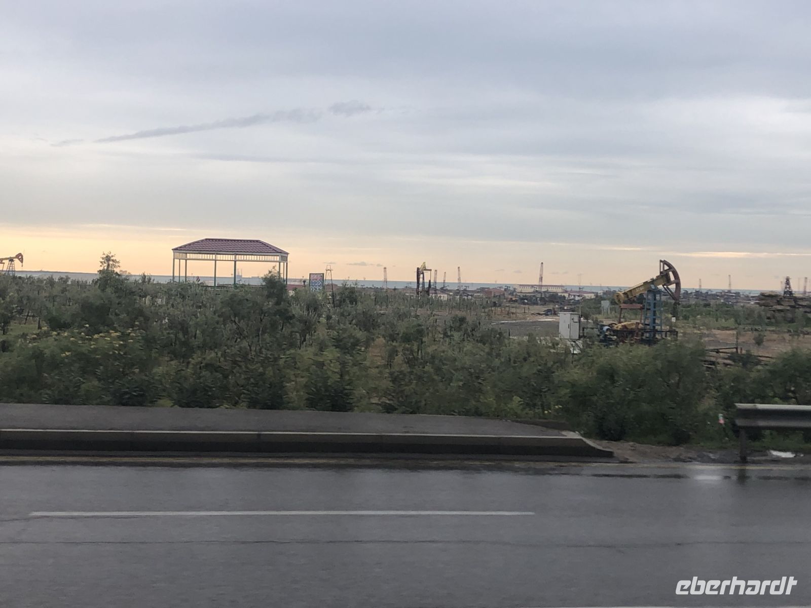 Die nordöstlich von Baku gelegene Halbinsel Apscheron präsentiert sich uns als hässlicher völlig zersiedelter Ballungsraum mit kilometerlangen Kleinbetrieben von Handel und Handwerk. Hinter Mauern sind Areale rostiger Ölbohrtürme erhalten, und auch Müllansammlungen auf den wenigen nicht bebauten Flächen sind keine Seltenheit.