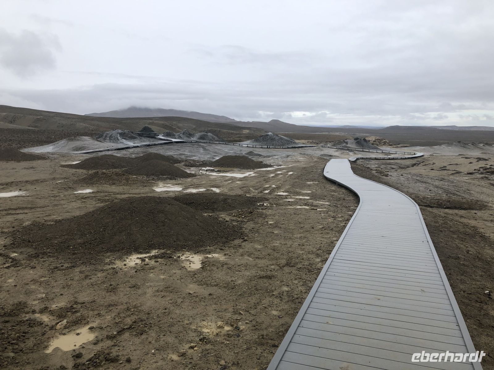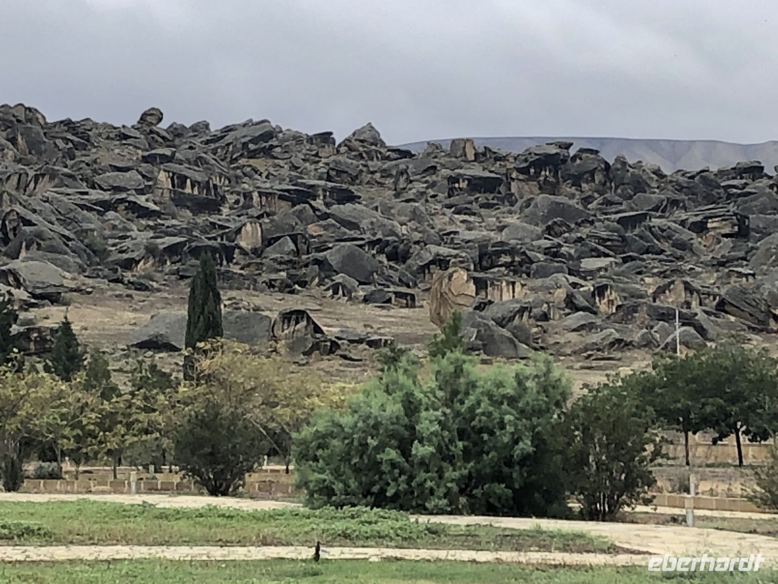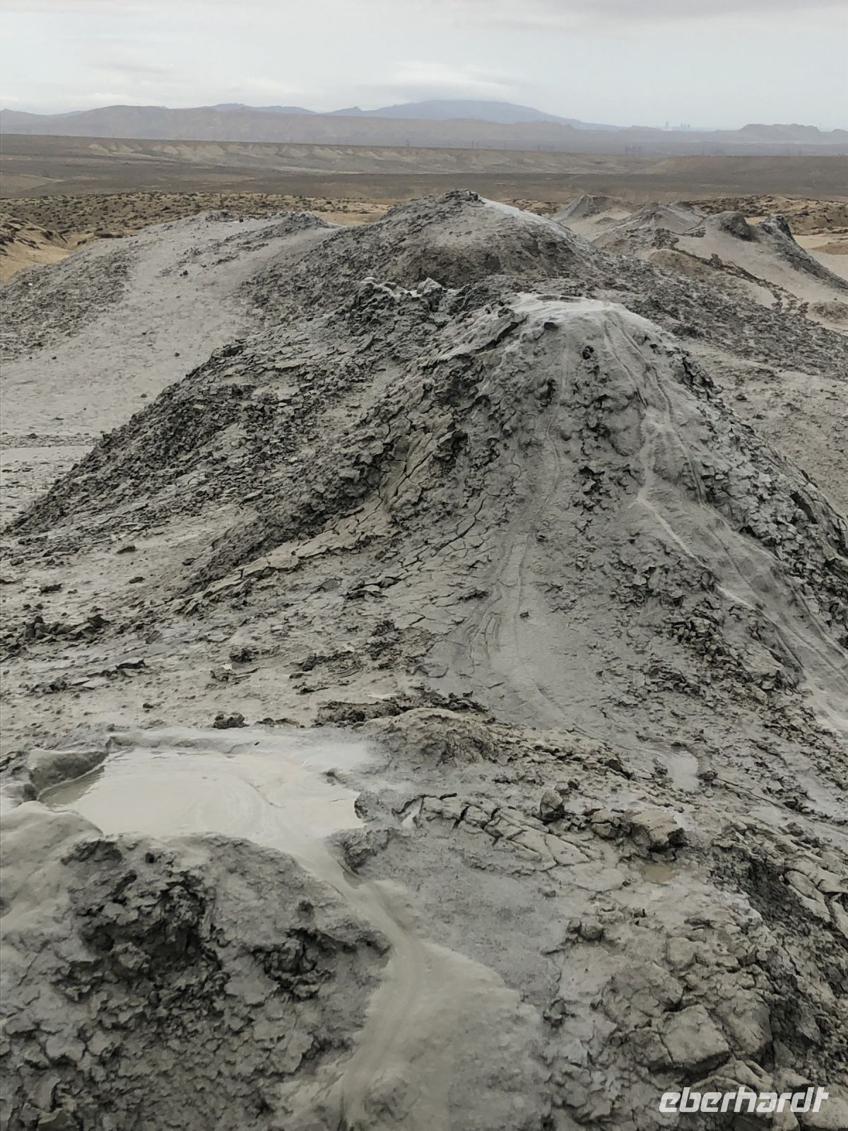 Nach einer Stunde Fahrt nach Süden vorbei an alten Ölförderanlagen und Blick auf das Kaspische Meer erwartet uns gleich ein Naturhöhepunkt unserer Reise im Gobustan-Nationalpark: In einer Mondlandschaft bestaunen wir an der Spitze eines völlig kahlen Hügels eine Vielzahl kleiner Schlammvulkane, aus deren kegelförmigen grauen Mini-Kratern es unaufhörlich blubbert. Und da es in der Nacht davor stark geregnet hatte, findet sich viel Schlamm auch an unseren Schuhen wieder.