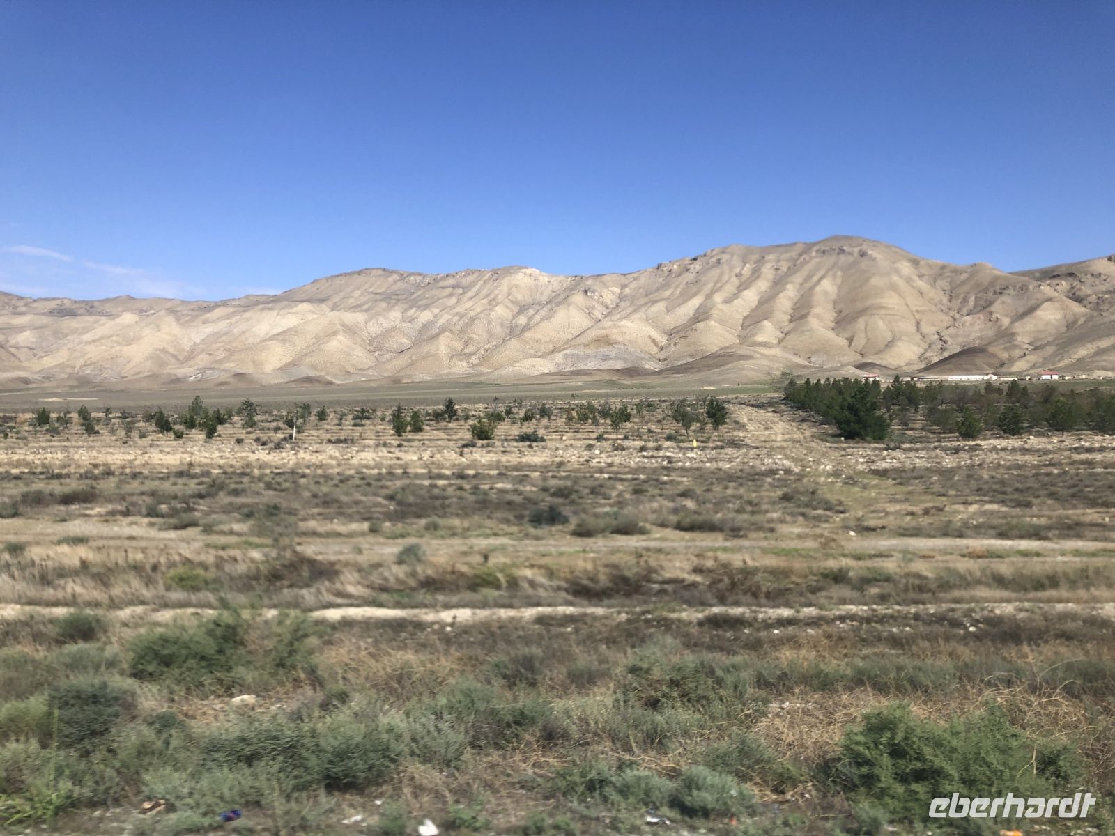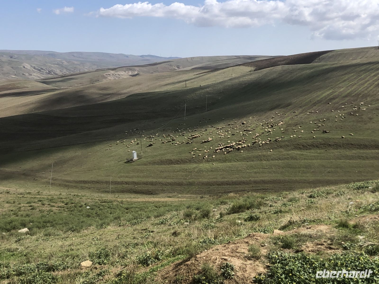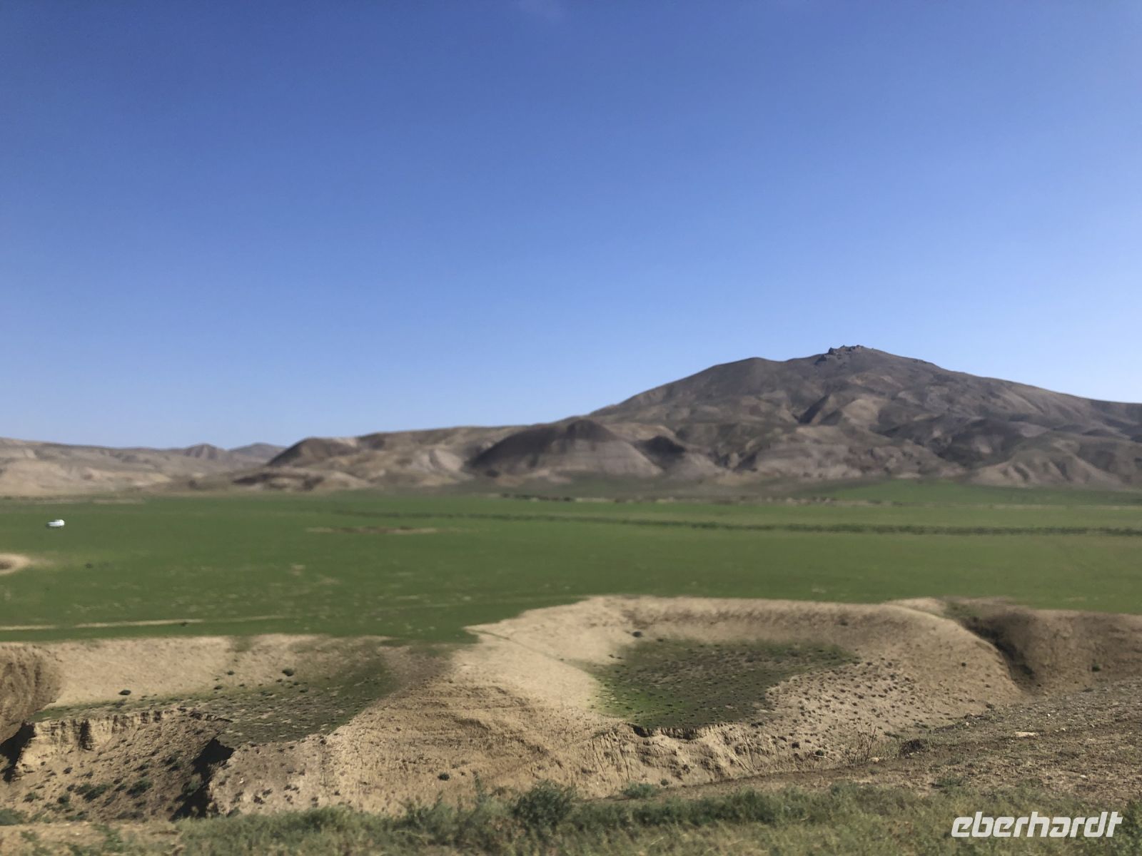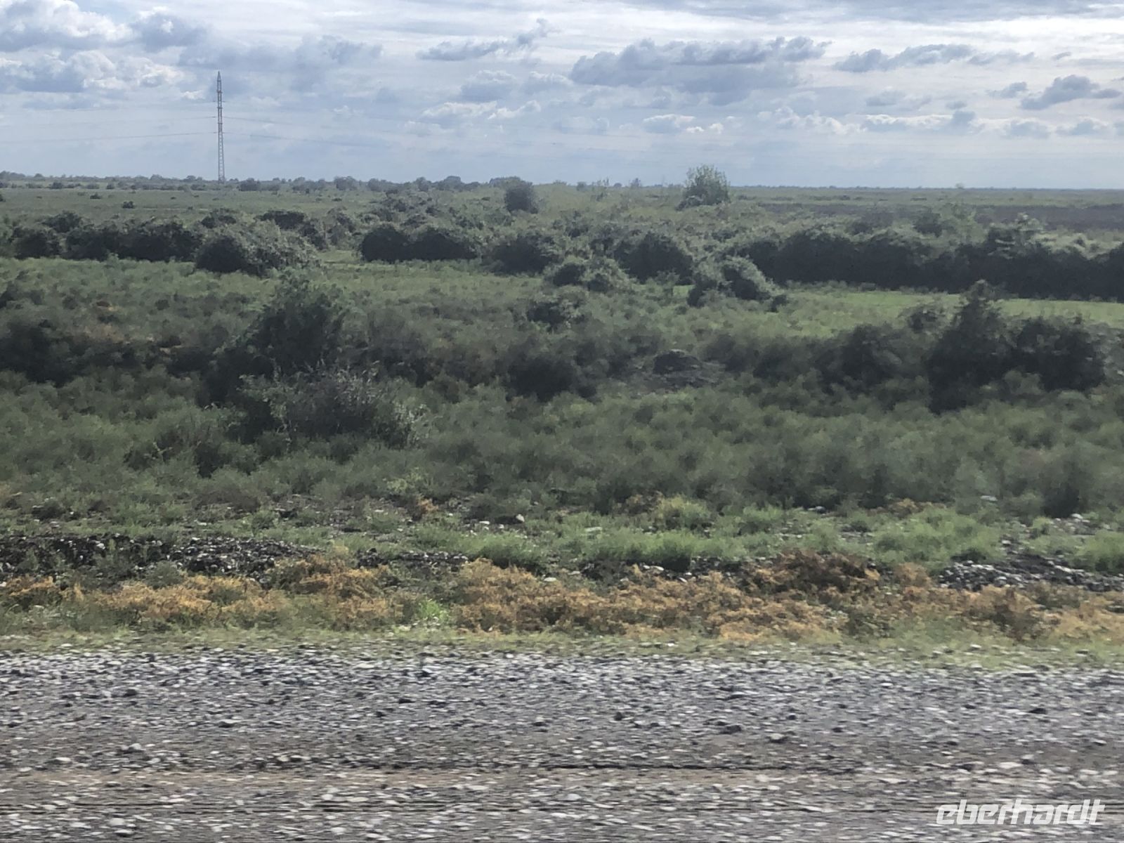 Fruchtbare Landschaften wechseln sich ab mit kargen Steppen, vereinzelt sehen wir Salzausblühungen auf den Böden, auch viel Verlassenes und Müll. Und Kurioses dann bei einer langen Aneinanderreihung von modernen "Mebel"-Geschäften, vor deren Schaufensterfront eine große Schafherde mit Schäfer und Pferdekarren gemächlich vorbeizieht. Hin und wieder steht auch eine Kuh auf der Straße, die unser Fahrer routiniert mit relativ hohem Tempo umfährt.
