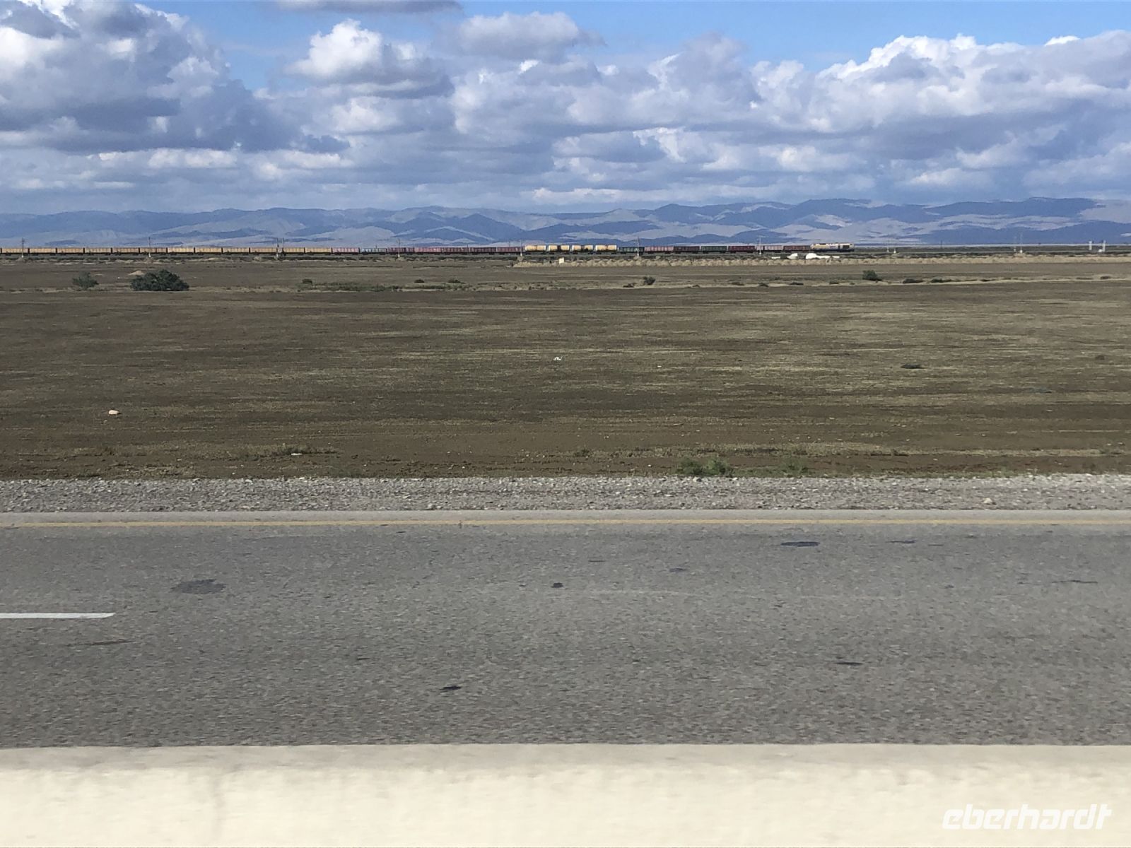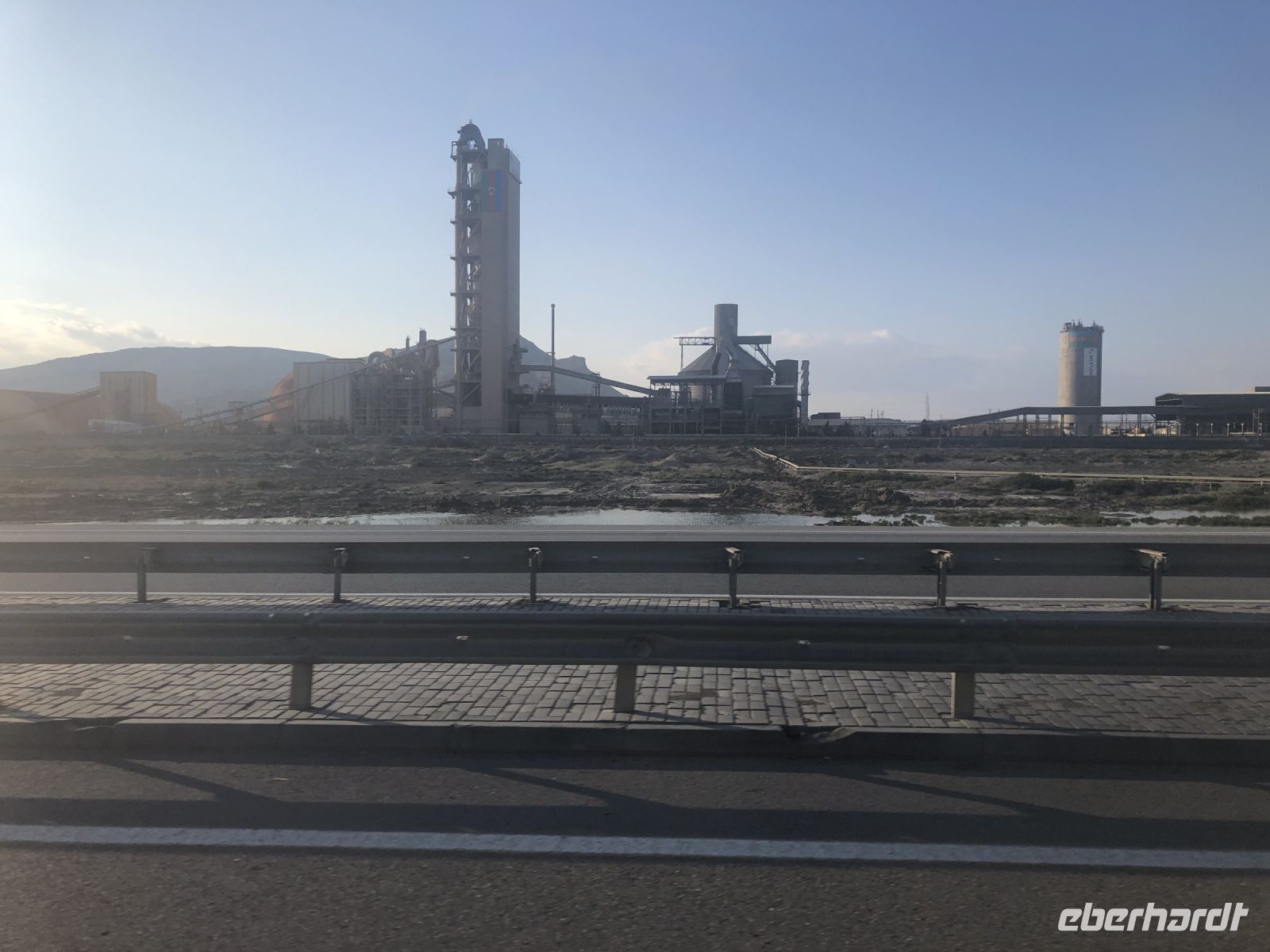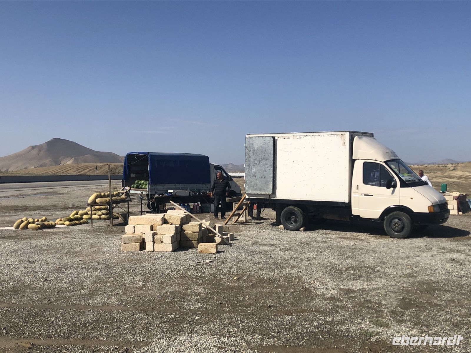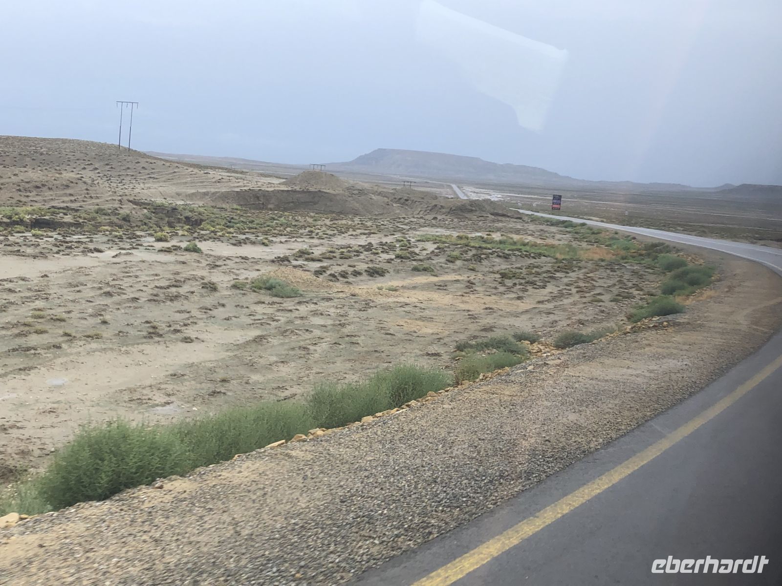 Fruchtbare Landschaften wechseln sich ab mit kargen Steppen, vereinzelt sehen wir Salzausblühungen auf den Böden, auch viel Verlassenes und Müll. Und Kurioses dann bei einer langen Aneinanderreihung von modernen "Mebel"-Geschäften, vor deren Schaufensterfront eine große Schafherde mit Schäfer und Pferdekarren gemächlich vorbeizieht. Hin und wieder steht auch eine Kuh auf der Straße, die unser Fahrer routiniert mit relativ hohem Tempo umfährt.