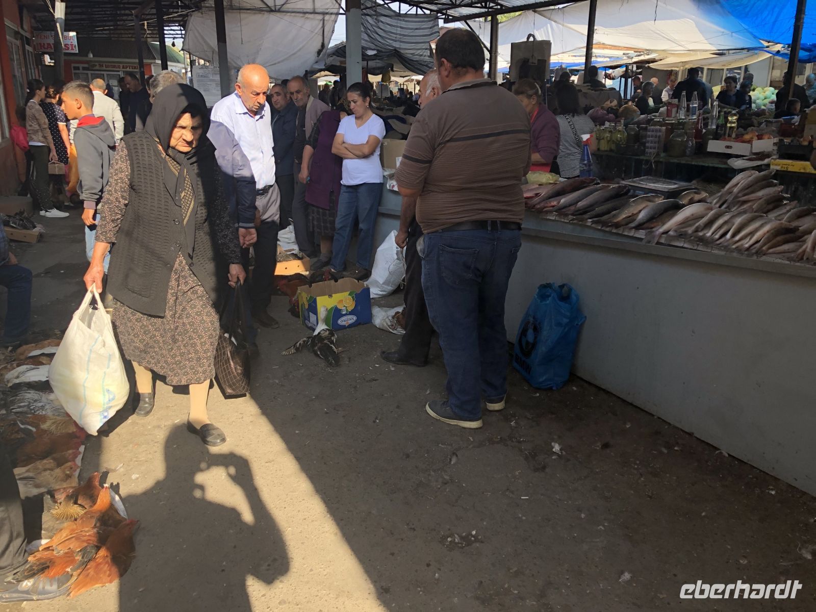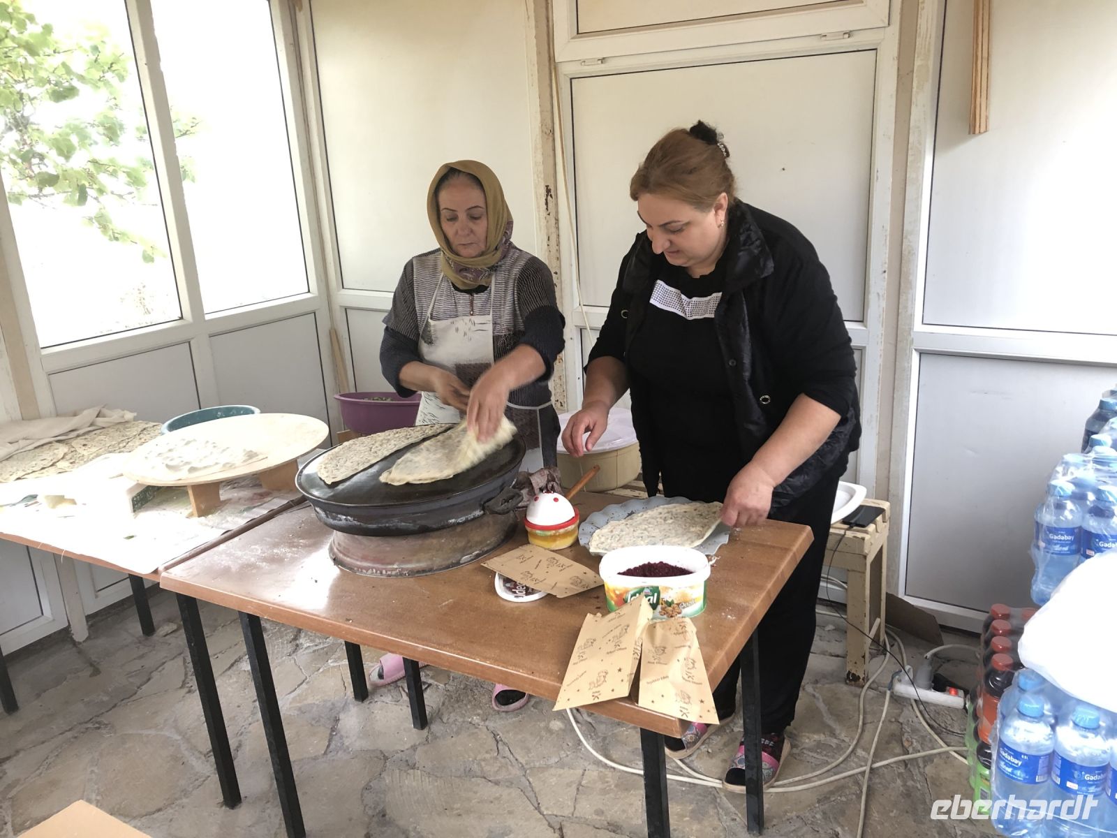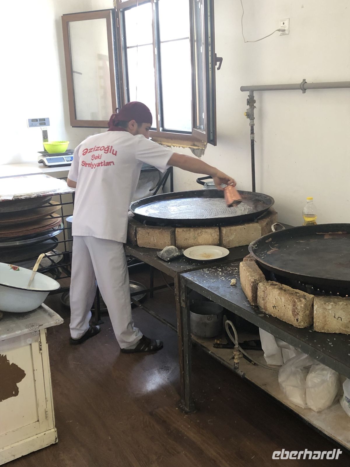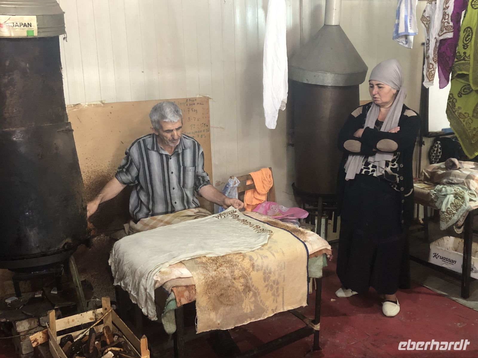 Die ziemlich lange Holperfahrt nach Gabala auf einer nicht enden wollenden Baustelle wird dann zur Tortur, unterbrochen von einem längeren Stopp im Bergdorf Basgal. Dort sehen wir in einer kleinen Manufaktur wie die berühmten Kelaghai-Seidentücher, die zur Nationaltracht gehören, mit Ornamenten versehen werden.