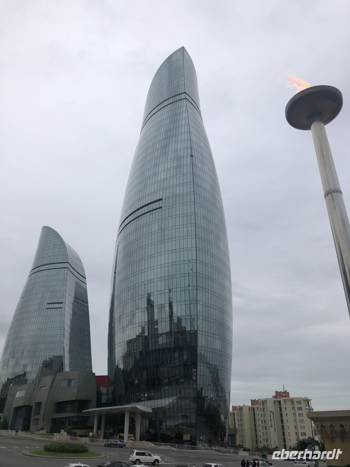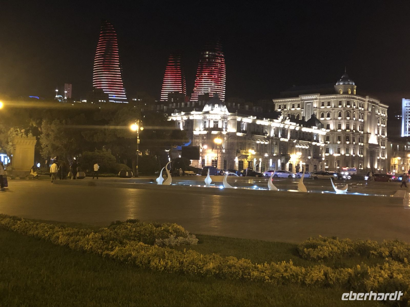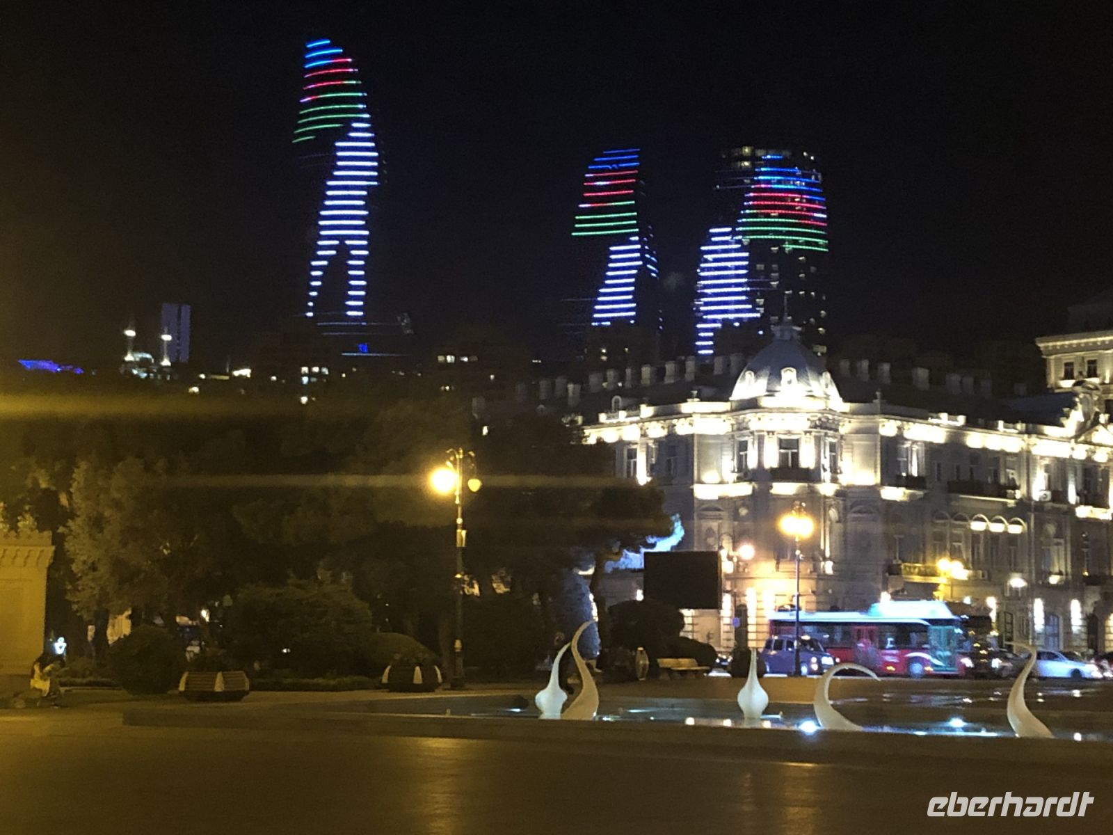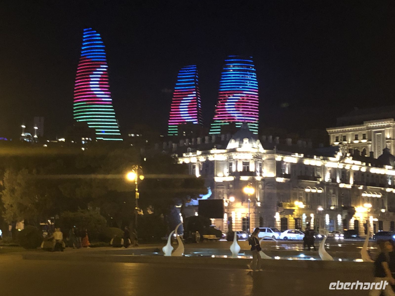 Nach dem guten Abendessen fahren wir noch einmal zur Uferpromenade und verabschieden uns von Baku, dieser faszinierenden Mischung aus reicher Tradition und westlicher Lebensart. Noch einmal halten wir inne bei dem Blick auf die in schillernden Farben beleuchteten Flame Towers.