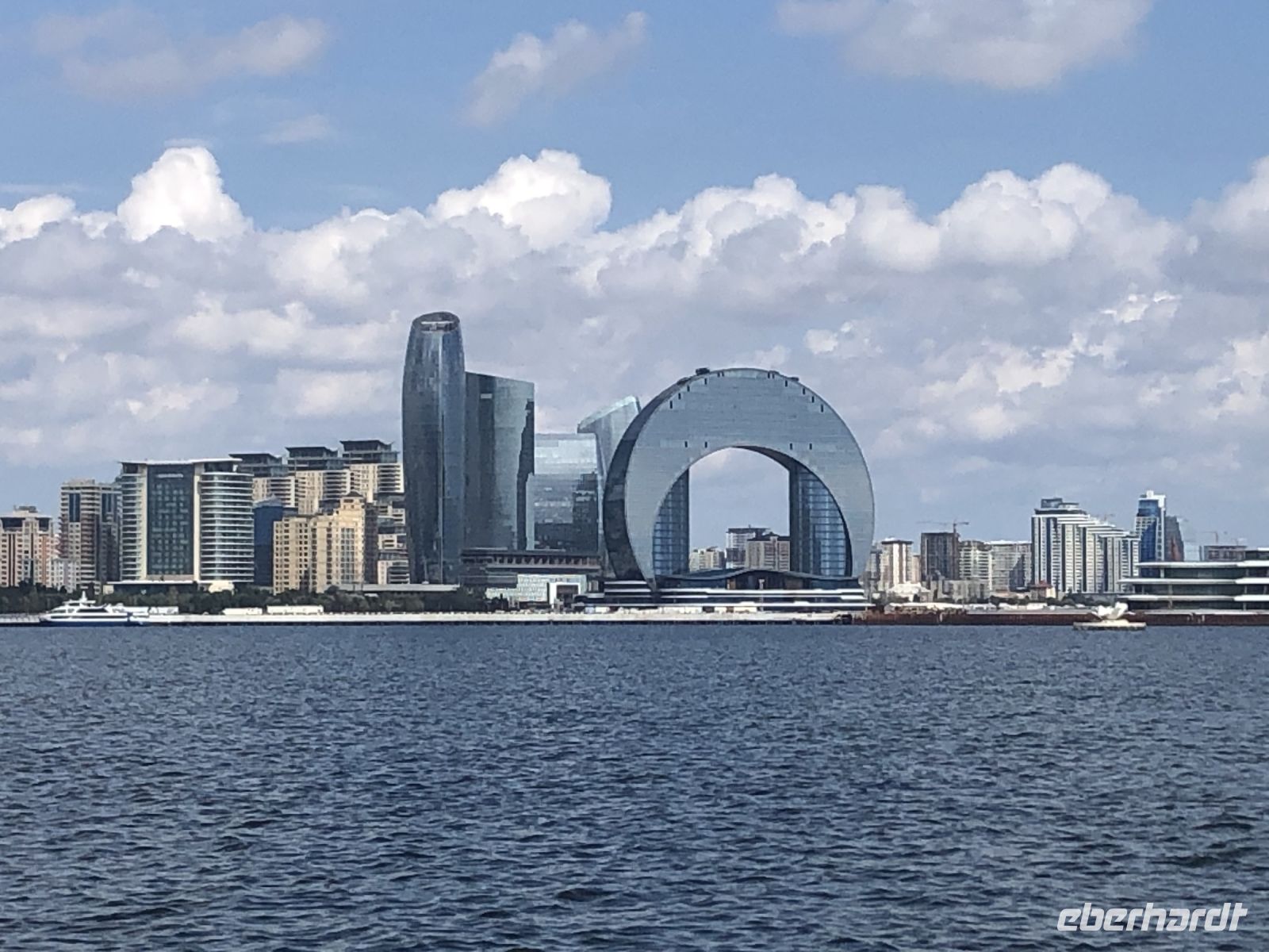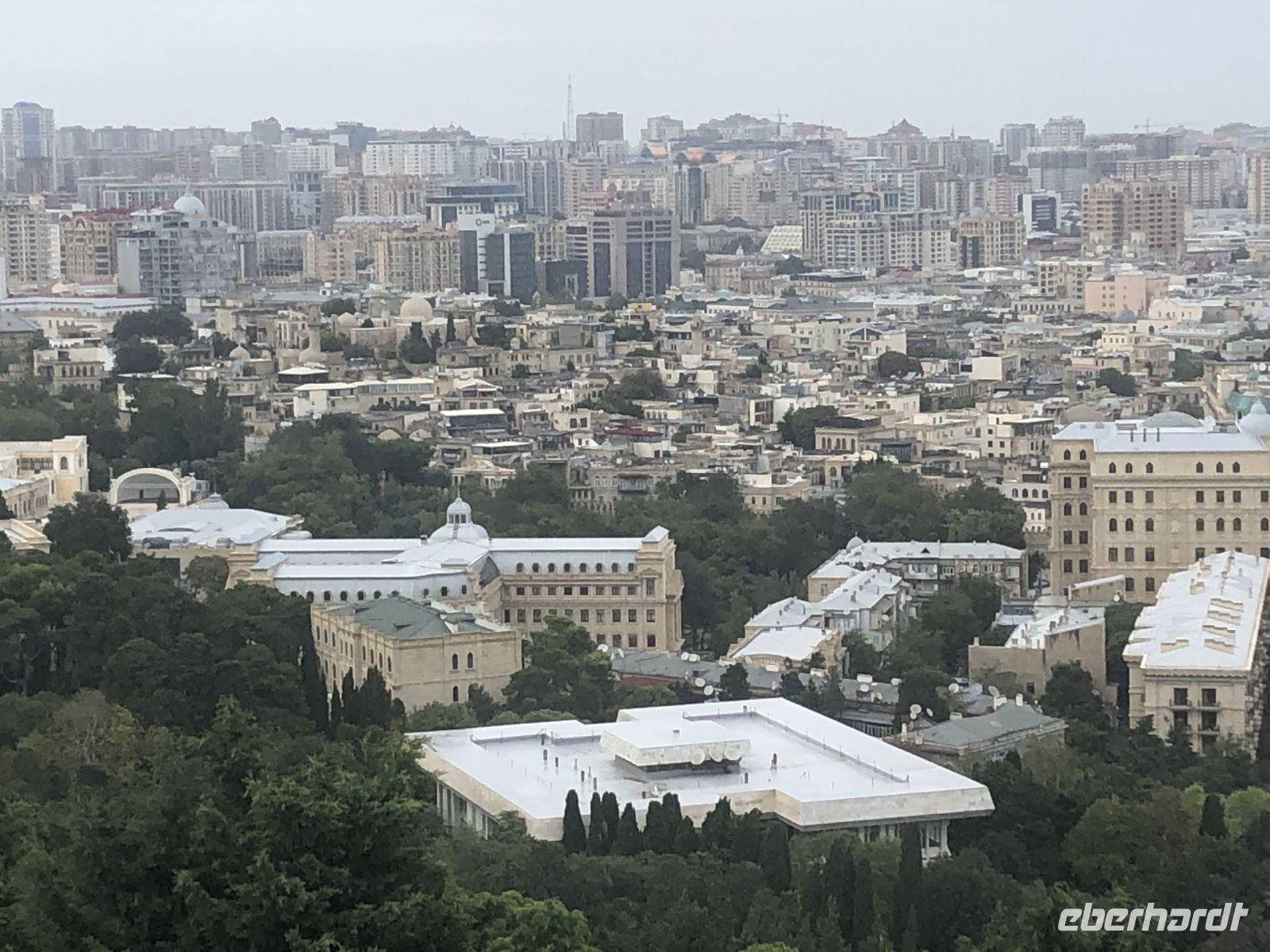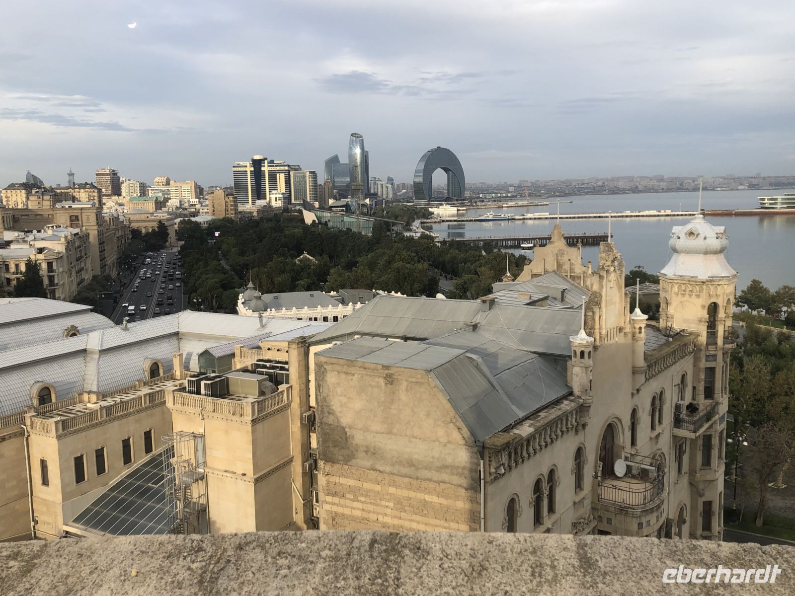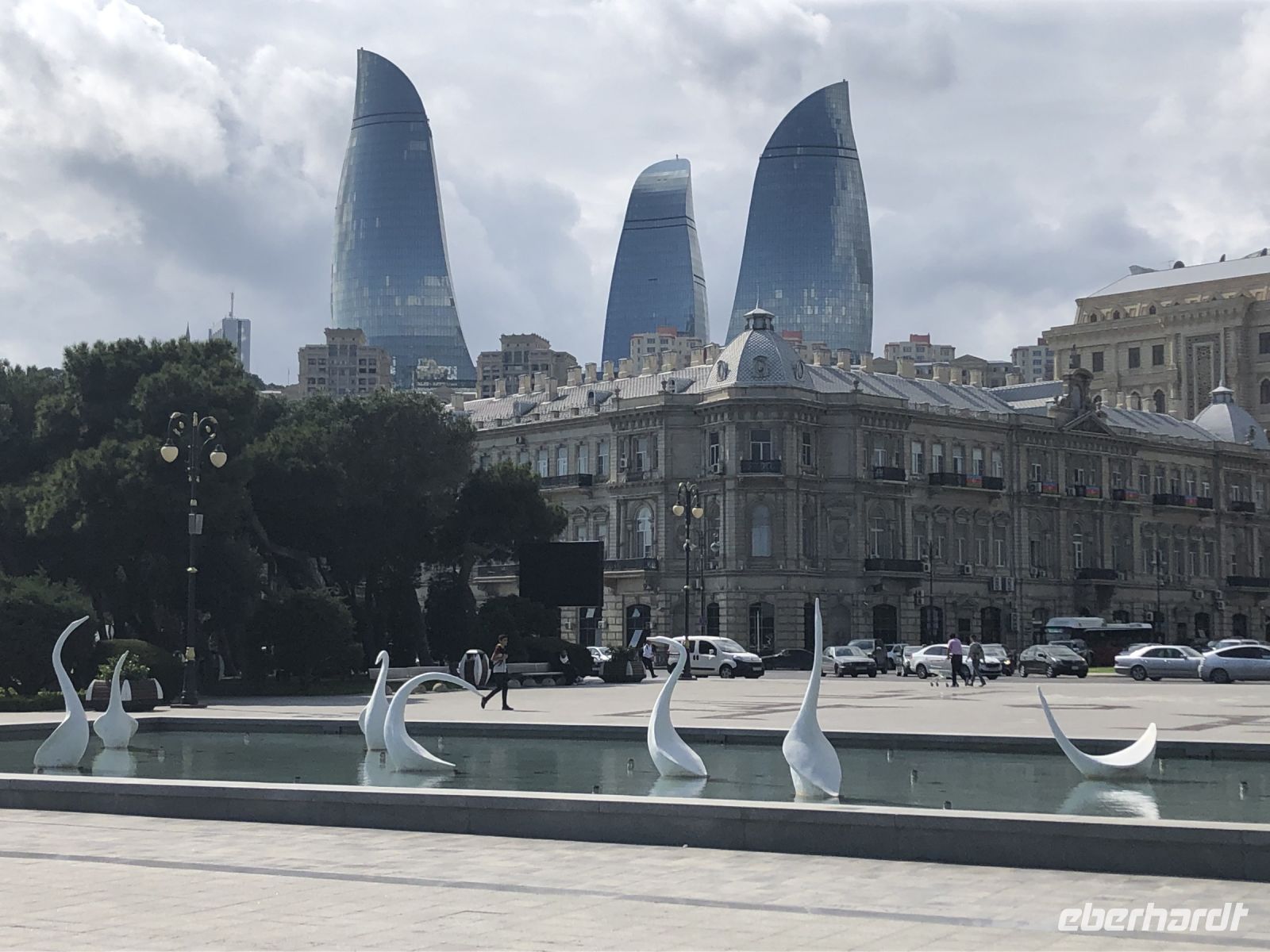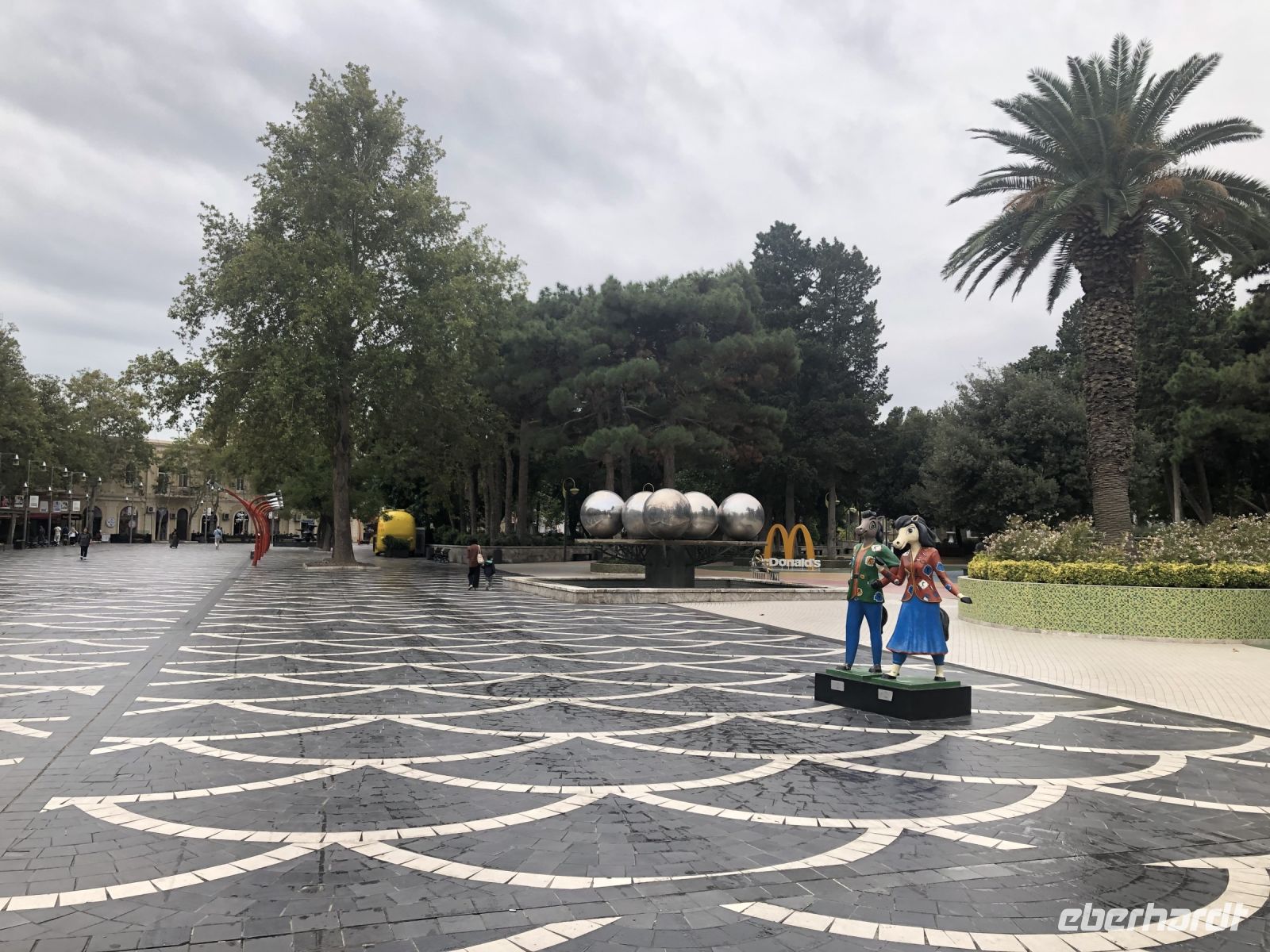 Heute lassen wir den Tag etwas ruhiger angehen. Bei herrlichem Sonnenschein und angenehmen Temperaturen bringt uns unser Bus ins Zentrum Bakus, wo wir durch noch nicht sonderlich belebte breite Fußgängenzonen mit vielen Geschäften schlendern - vorbei am "Berliner? Bär an der Deutschen Botschaft. Durch eine mondäne Unterführung gelangen wir zum Baku Bulvar, einer zum Flanieren einladenden Strandpromenade mit kleinen Parks und Blick auf zahlreiche futuristische Gebäude des "Dubai am Kaspischen Meer".