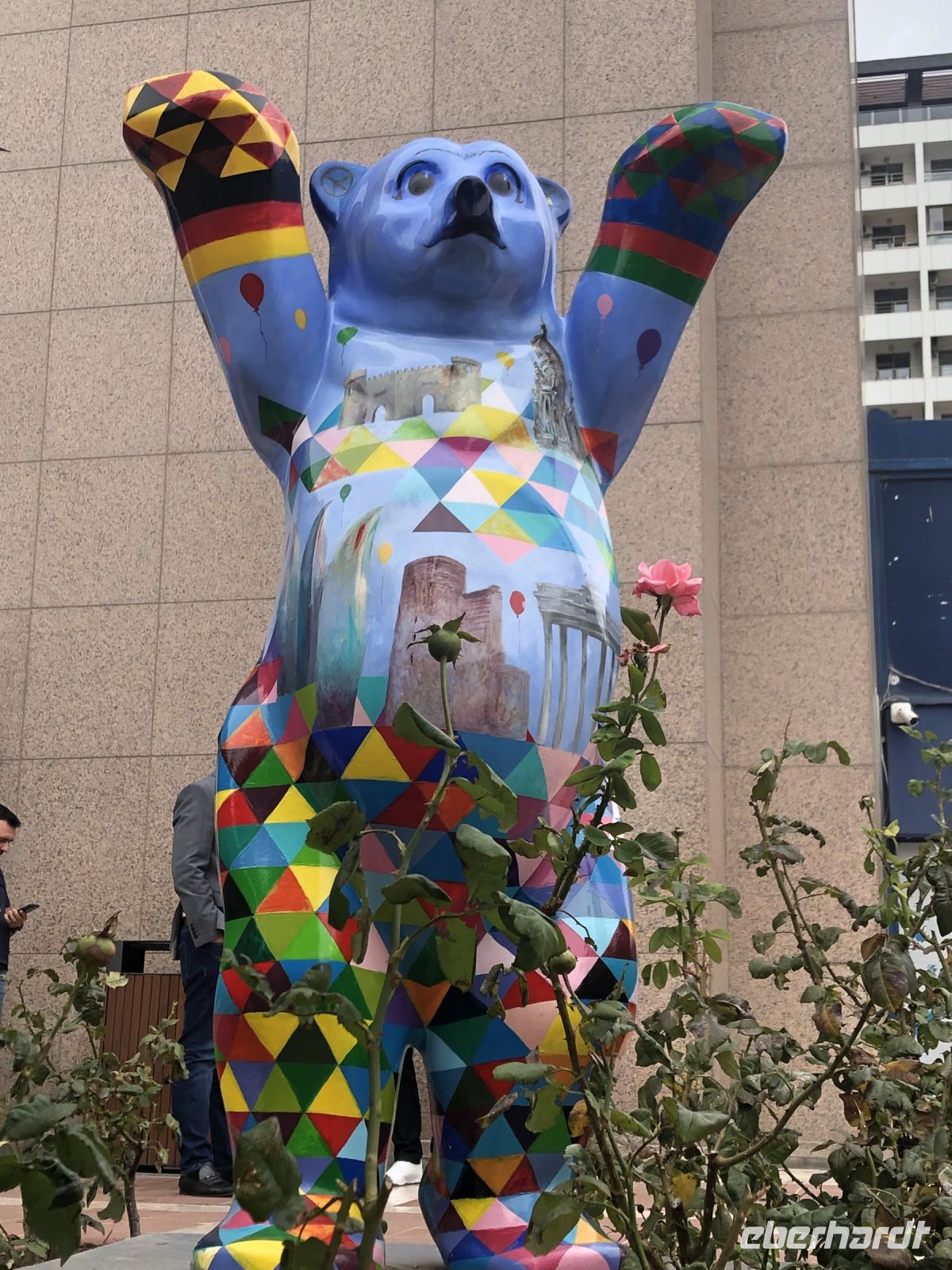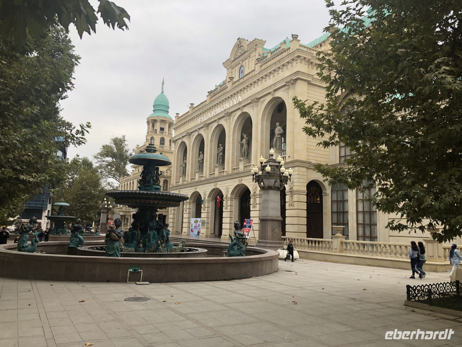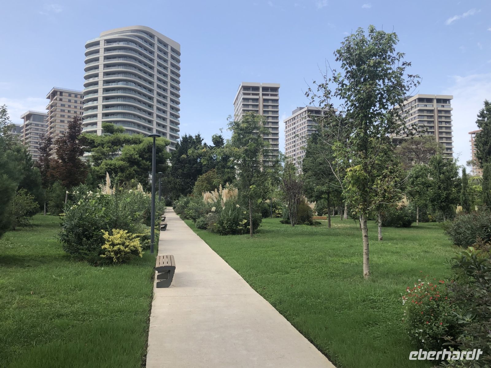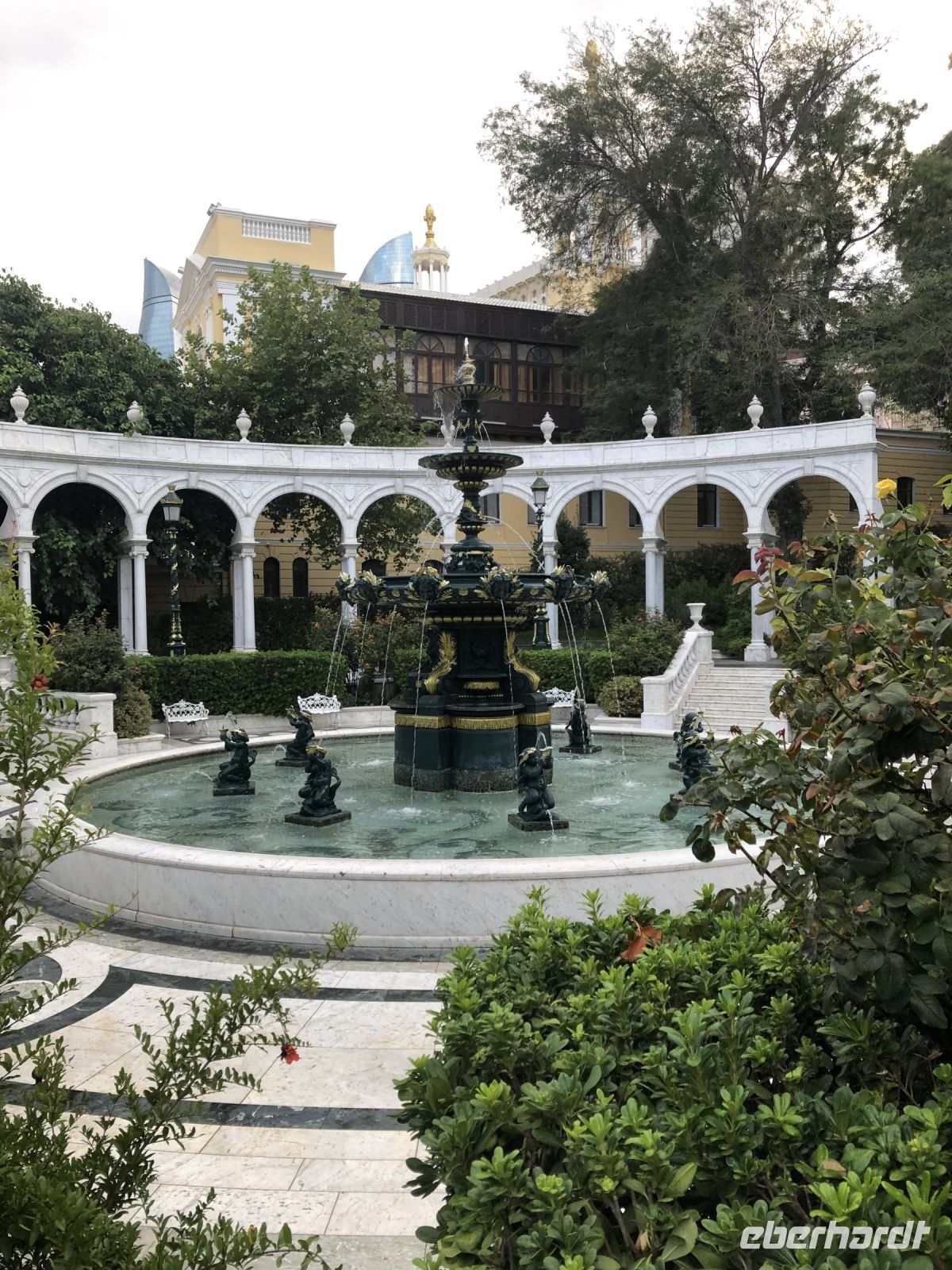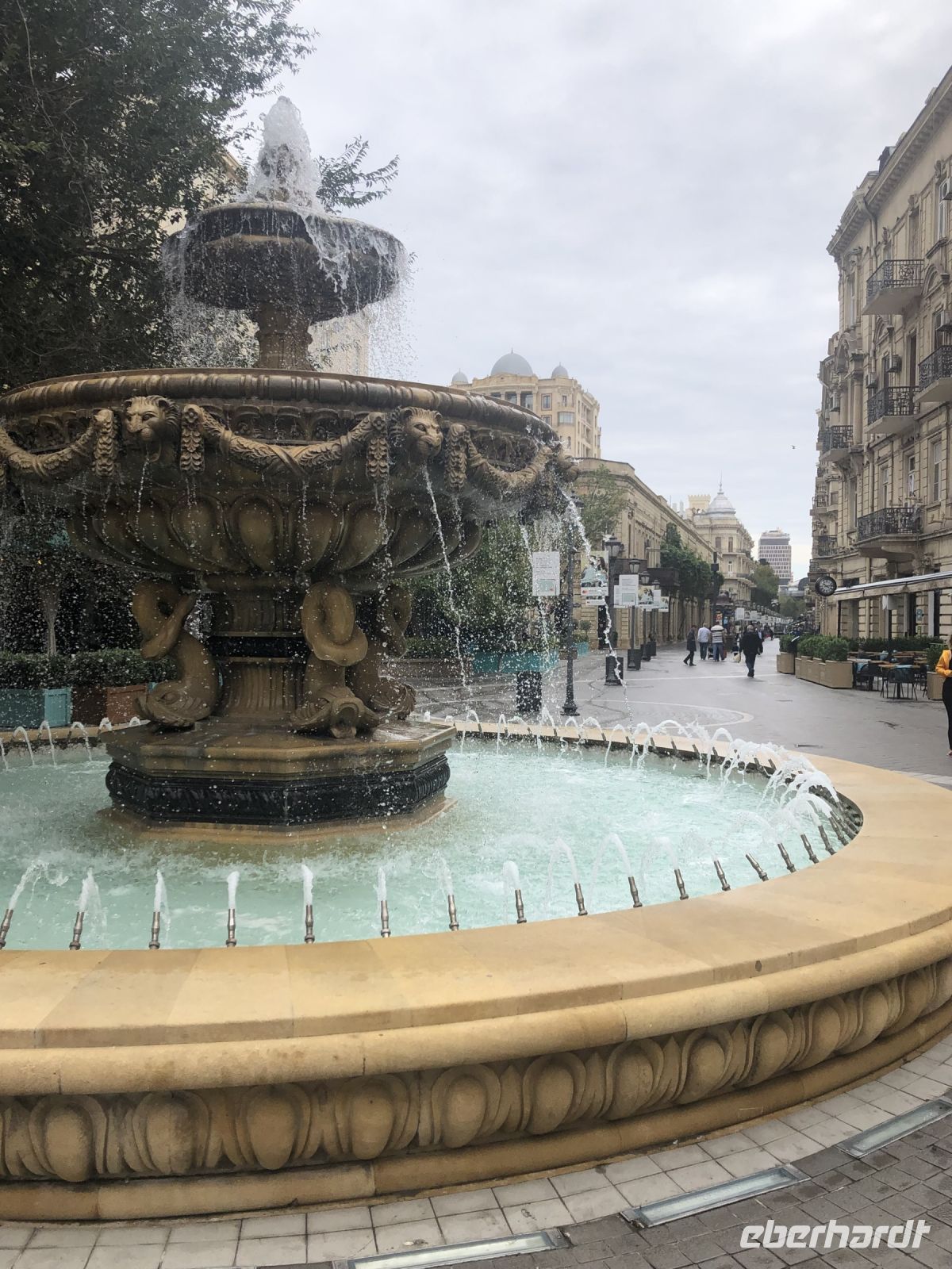 Heute lassen wir den Tag etwas ruhiger angehen. Bei herrlichem Sonnenschein und angenehmen Temperaturen bringt uns unser Bus ins Zentrum Bakus, wo wir durch noch nicht sonderlich belebte breite Fußgängenzonen mit vielen Geschäften schlendern - vorbei am "Berliner? Bär an der Deutschen Botschaft. Durch eine mondäne Unterführung gelangen wir zum Baku Bulvar, einer zum Flanieren einladenden Strandpromenade mit kleinen Parks und Blick auf zahlreiche futuristische Gebäude des "Dubai am Kaspischen Meer".