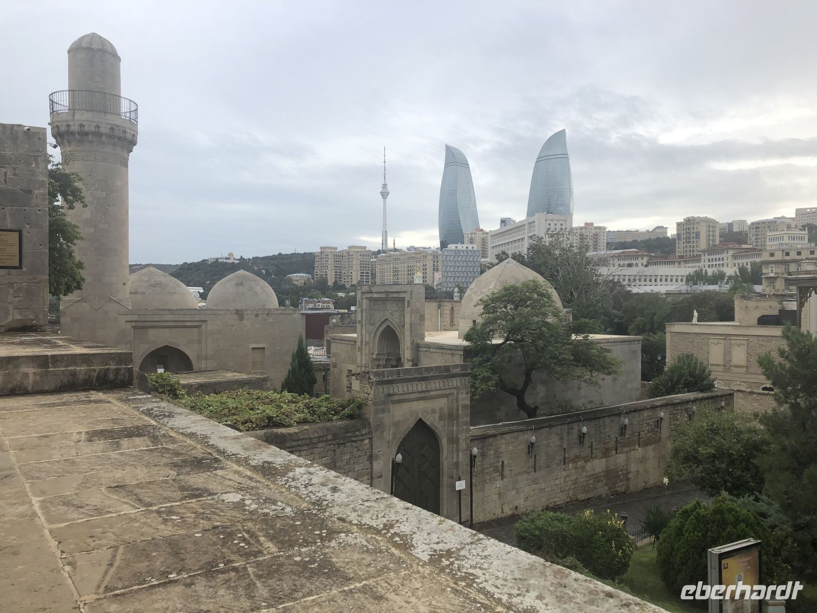 Am Nachmittag sind die Flame Towers, 3 spitz zulaufende Wolkenkratzer auf einer Anhöhe Bakus, unser erstes Ziel: Wir genießen trotz Nieselregen die herrliche Aussicht über die Landeshauptstadt und den sich anschließenden längeren Spaziergang durch das Altstadtviertel Itscheri Schecher. Hinter meterdicken Mauern hat sich ein Stück altes Baku bewahrt - eine Zeitreise in eine längst vergangene orientalisch anmutende Welt: Wir erkunden den mittelalterlichen persischen Schirwanschah-Palast inmitten von Architekturdenkmälern und Geschäften mit traditioneller Handwerkskunst und besteigen den Jungfrauenturm, das Wahrzeichen der Altstadt.