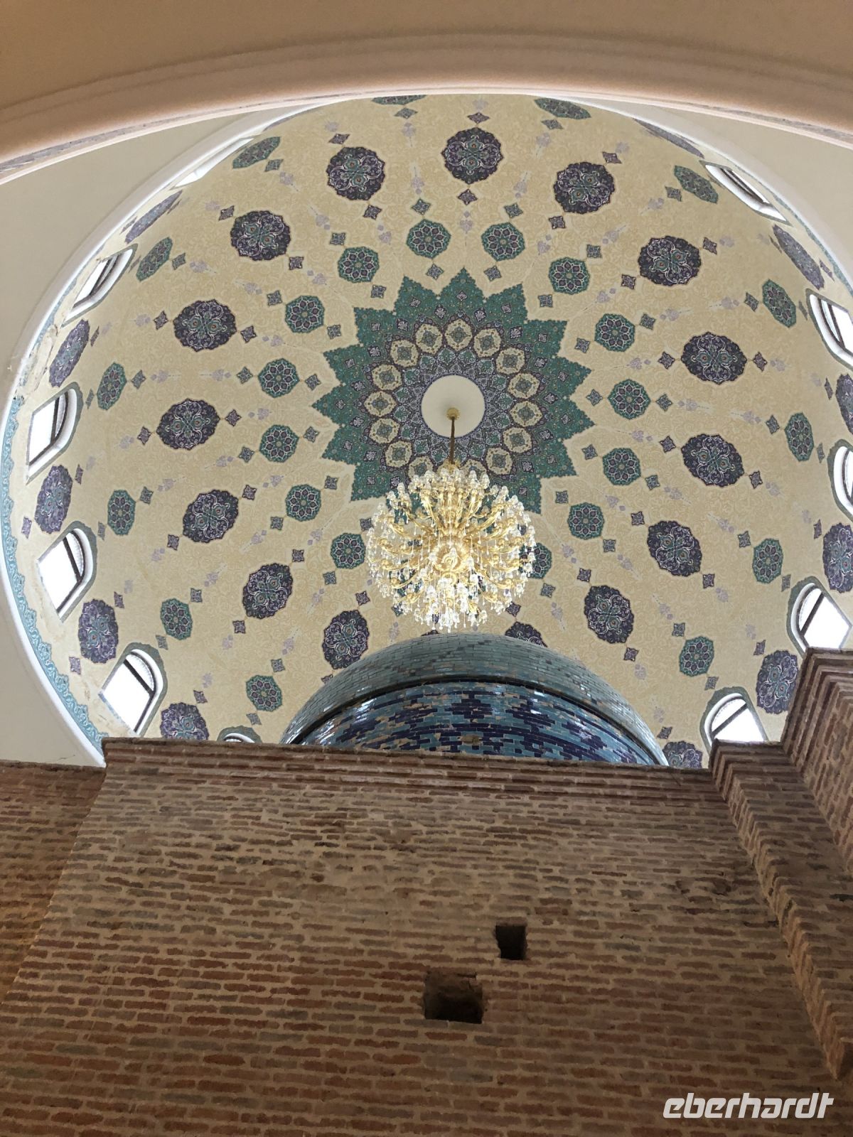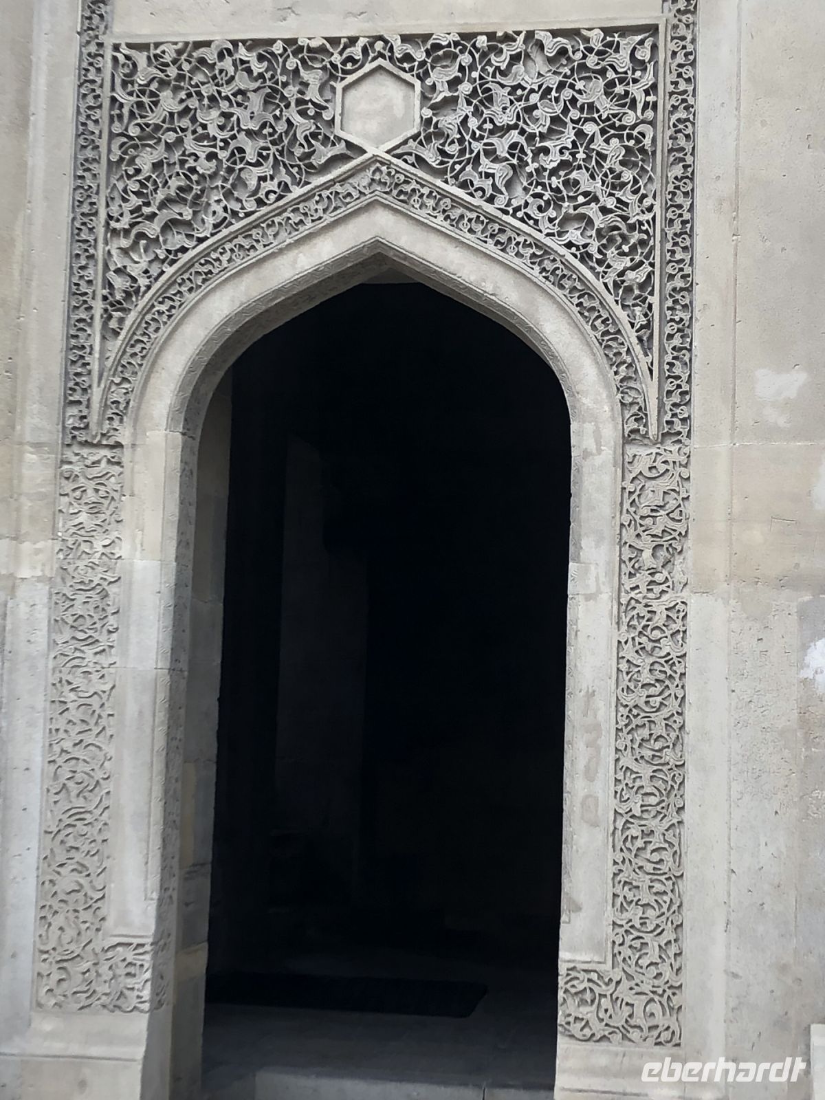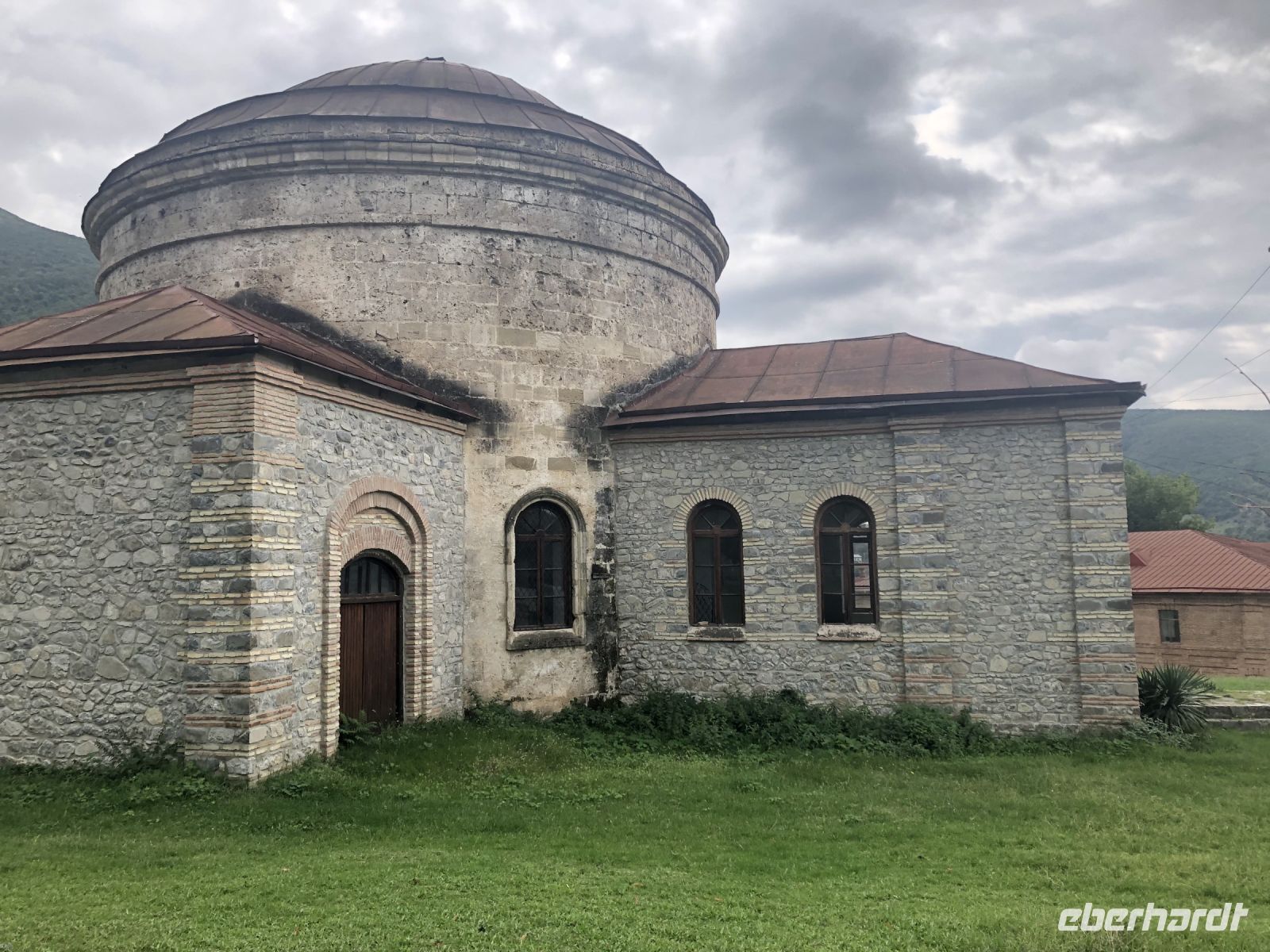 Dann geht es weiter in das von Baku nur 120 Kilometer entfernte aber schon 800 Meter hoch gelegene Shamakhi - im Mittelalter Hauptstadt des einstigen Schirwanschah-Reiches, die nach mehreren Erdbeben später nach Baku verlegt wurde. Mit spürbarer Demut erleben wir die über 1000 Jahre alte Freitagsmoschee Djuma - die älteste des Landes - mit ihren prächtig bemalten und verzierten Decken und den vielen betenden tiefgläubigen Männern.