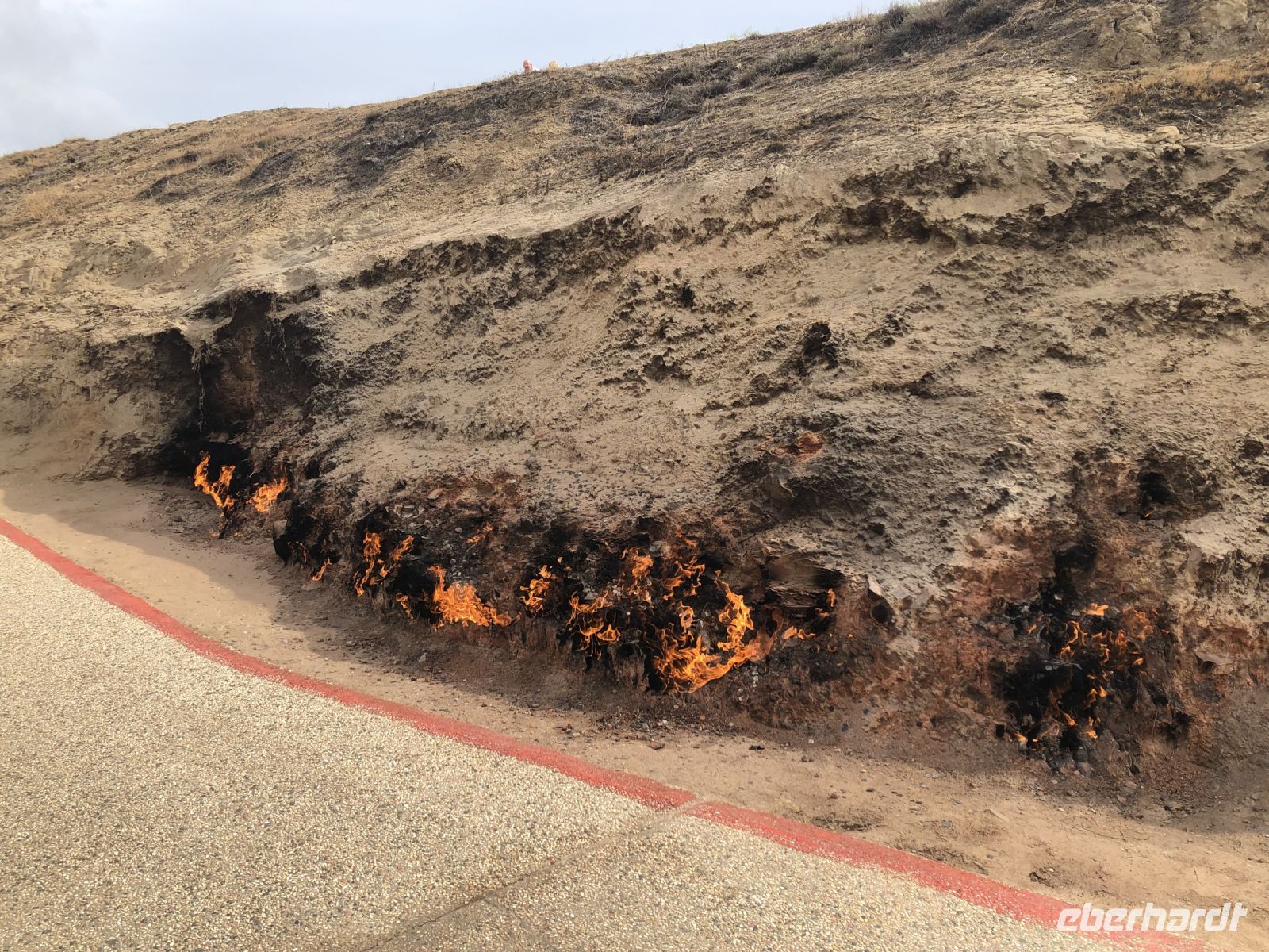 Am kleinen Hügelberg Yanar Dag züngeln seit über 1000 Jahren bis zu 3 Meter hohe Flammen - entweichende Gase der darunter liegenden Erdgasvorkommen als beeindruckendes Naturschauspiel.