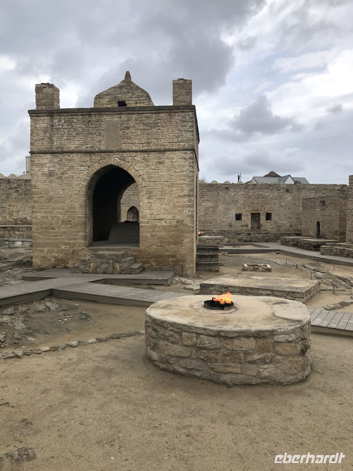 Eine weitere Stätte einstiger Feueranbetung, die wir in dieser überaus eigenartigen Gegend besuchen, ist Ateschga, der stimmungsvolle Feuertempel, der wie eine Festungsanlage wirkt. Herzstück ist ein viereckiger Bau mit Torbögen auf Pfeilern und einer Feuerstelle mit ewiger Flamme im Innenhof.