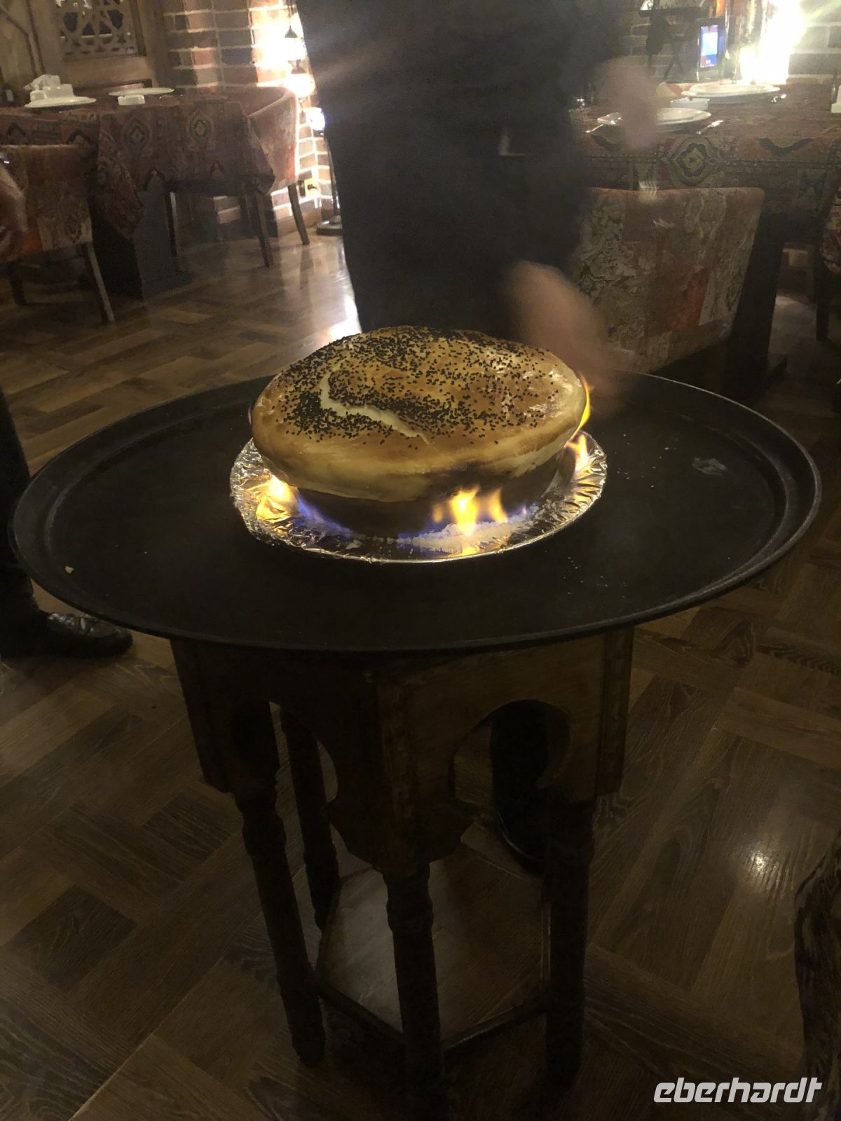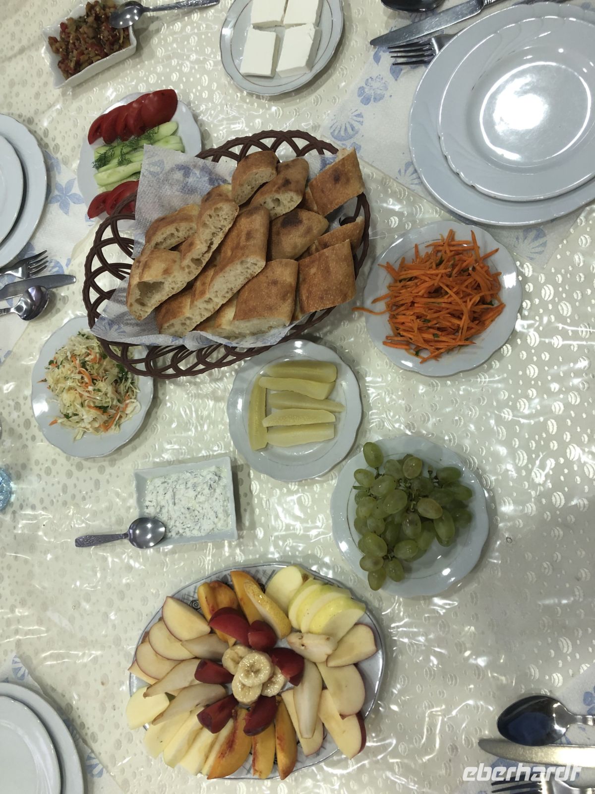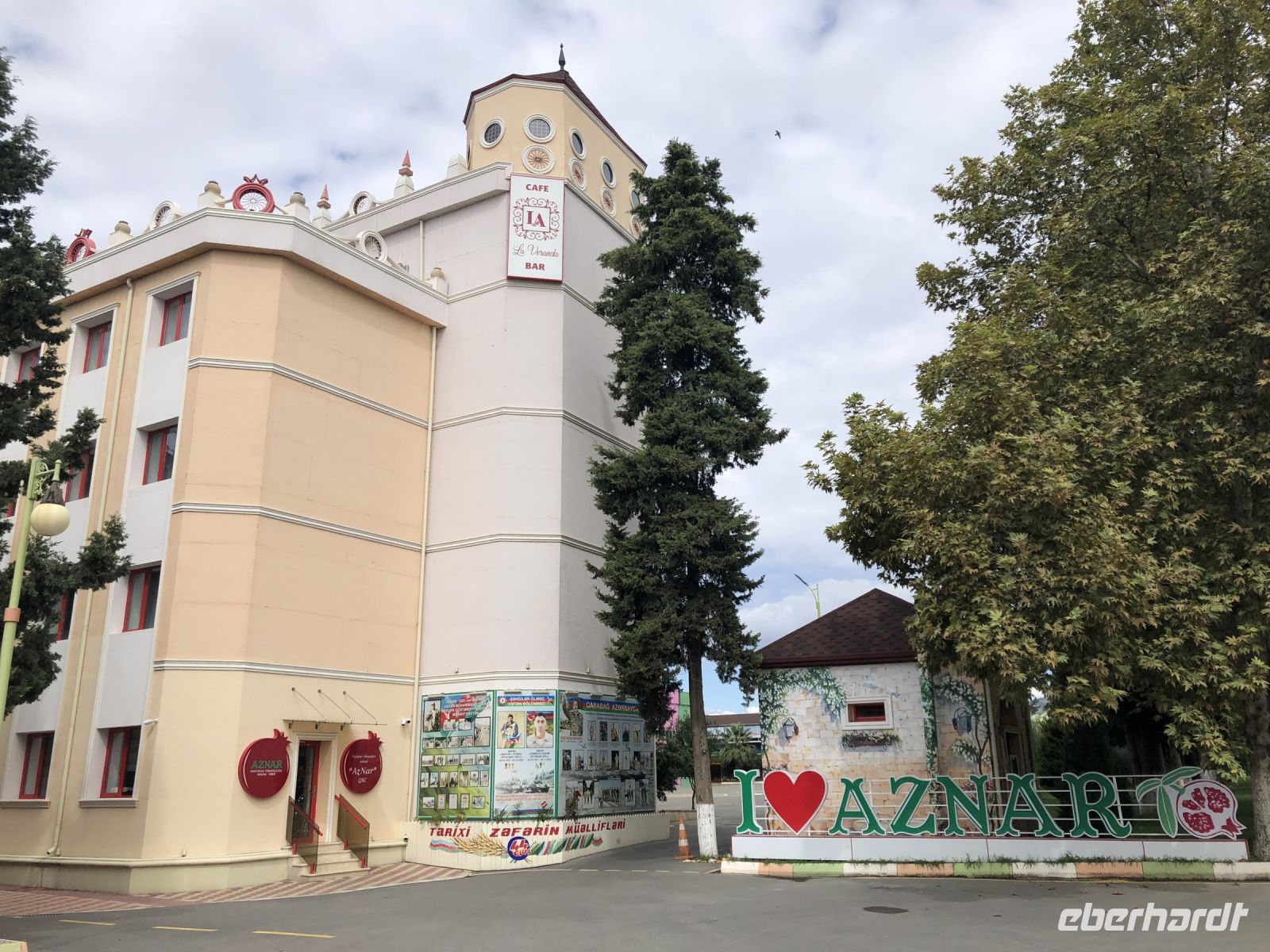 Das noch spätere Abendessen in einem landestypischen Restaurant entschädigt ein wenig für die Strapazen. Erst gegen 21 Uhr checken wir in unserem Alternativhotel Qafgaz City in Gabala ein.