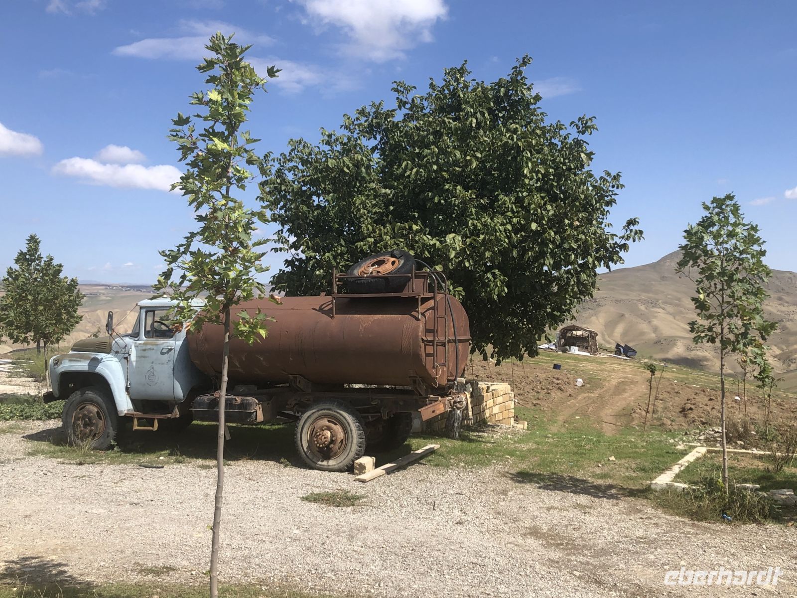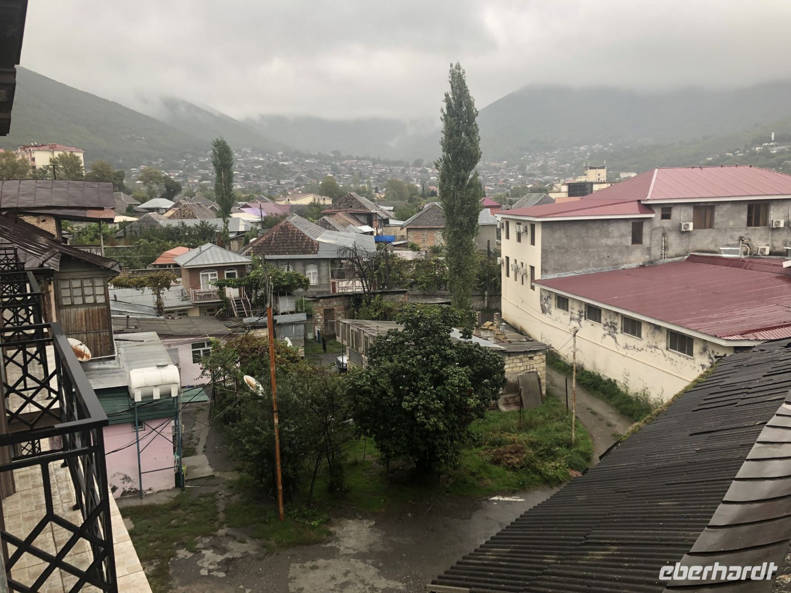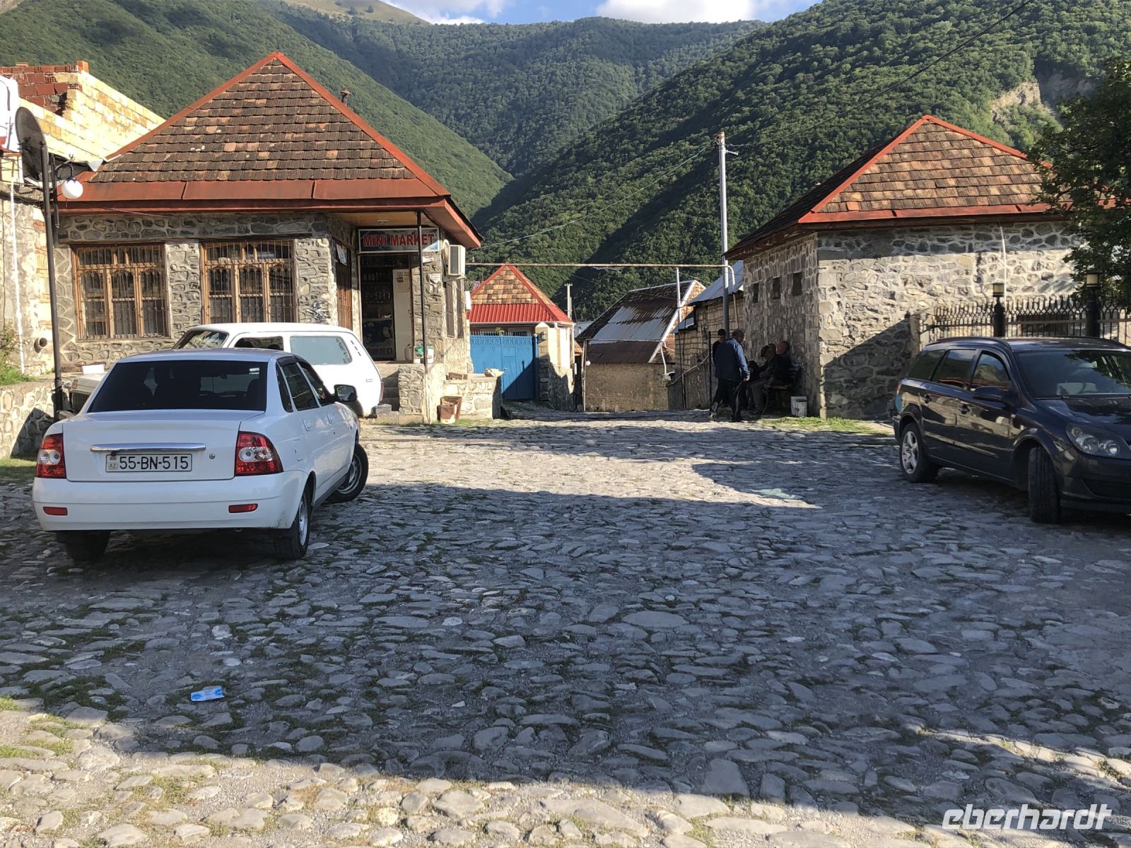 Schon am Morgen vor der Abfahrt gibt es eine Überraschung: Unser heutiges vorgesehenes Übernachtungsziel, das Bergdorf Lahic im Großen Kaukasus, kann aufgrund der wegen Steinschlag unpassierbar gewordenen einzigen Zufahrtsstraße nicht angefahren werden.