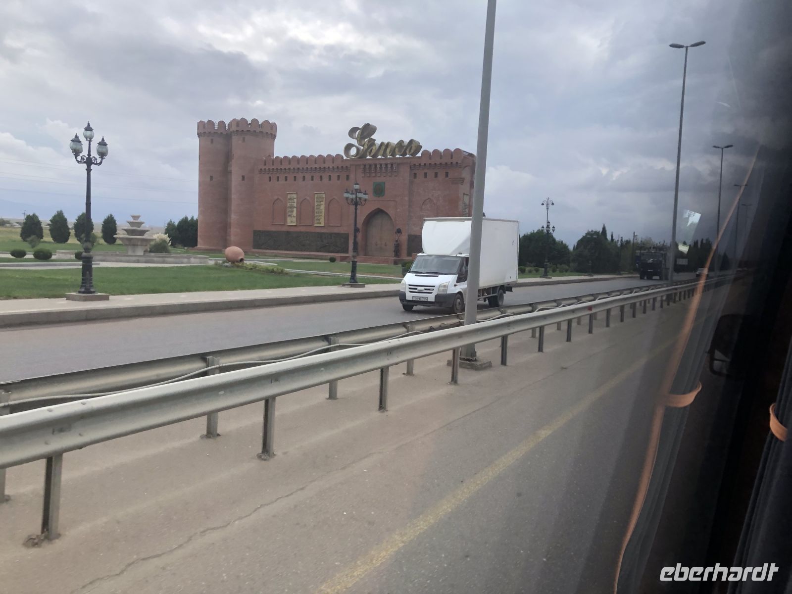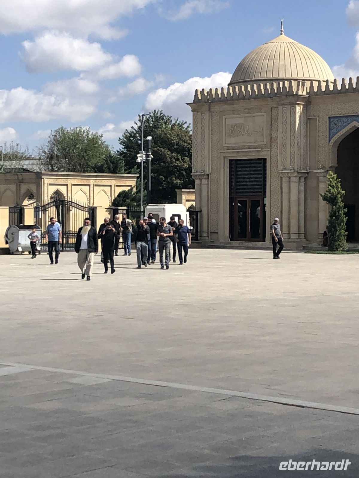 Wir verlassen Ganja, die nicht allzu weit entfernte imposante Imamzadeh-Moschee mit dem prächtigen türkisfarben leuchtenden Mausoleum ist unser erstes Ziel. Danach steht uns eine lange Fahrt von etwa 350 Kilometer zurück nach Baku bevor - doch diesmal mit gutem Straßenbelag: