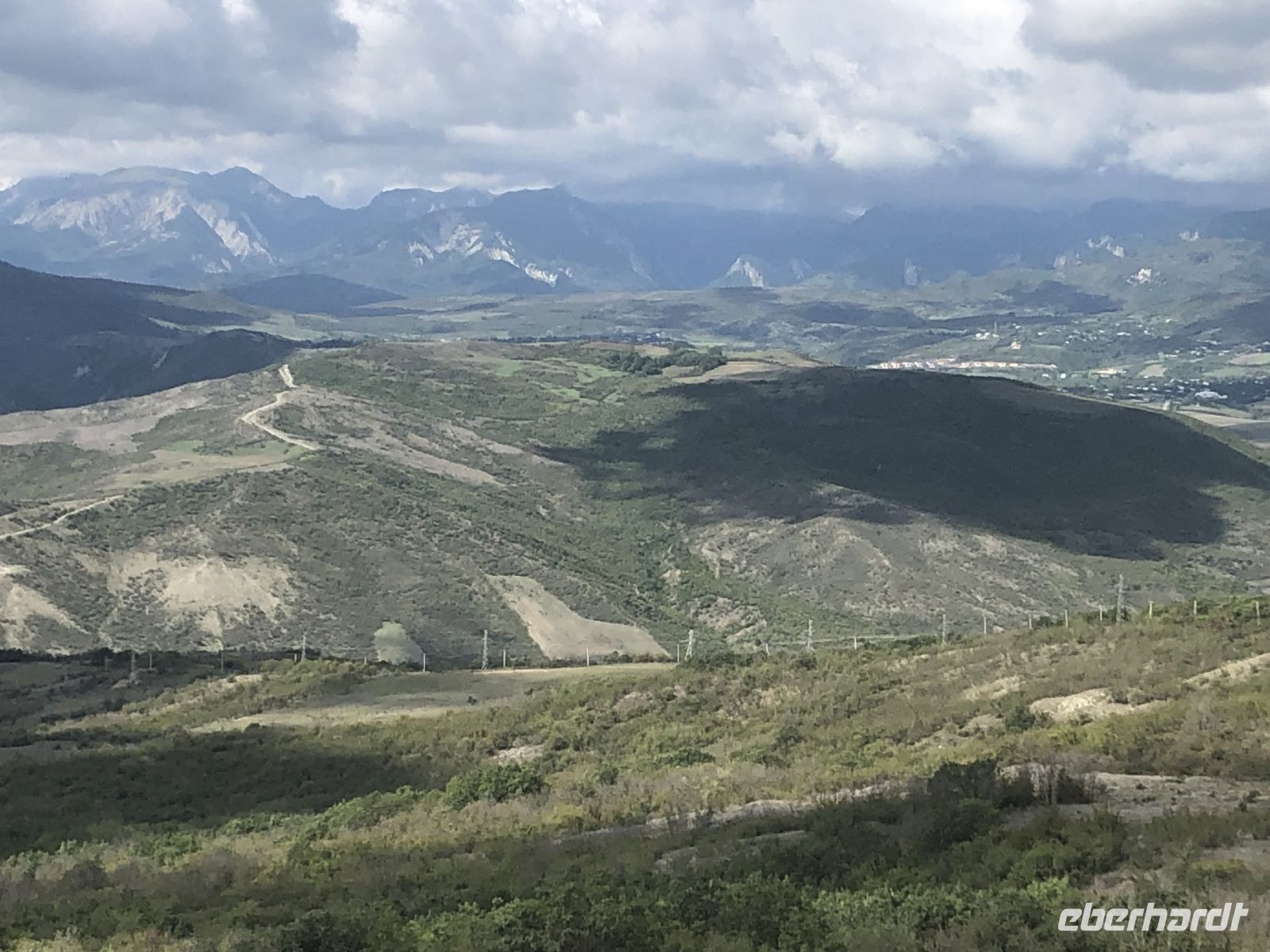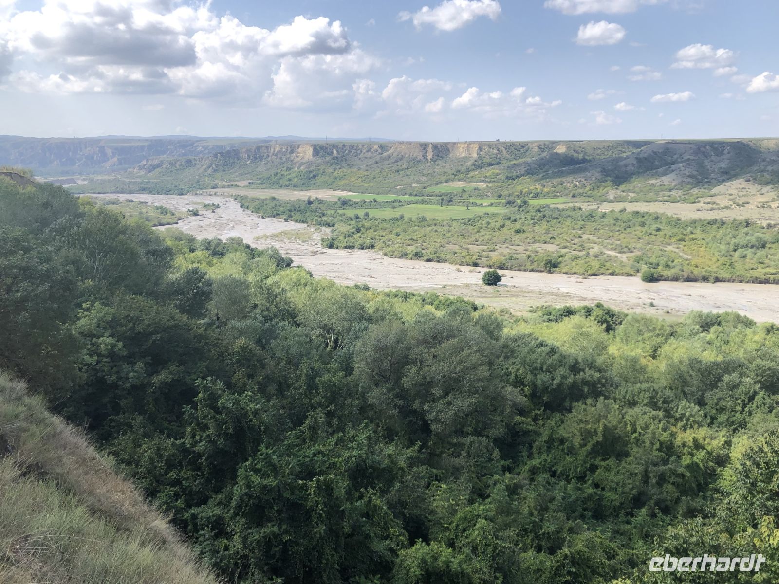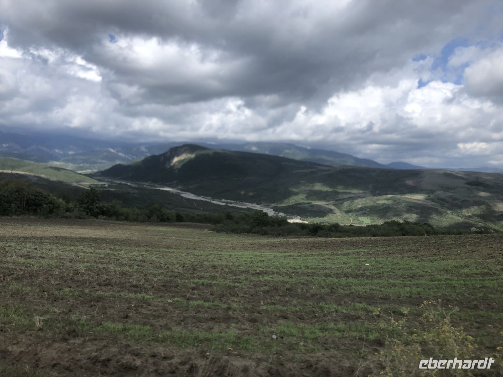 Bei zunächst strömendem Regen lassen wir Sheki und unser schönes Hotel hinter uns Richtung Südwesten. Unterwegs überqueren wir die Kura, den mit 1364 Kilometer längsten Fluss im Kaukasus.