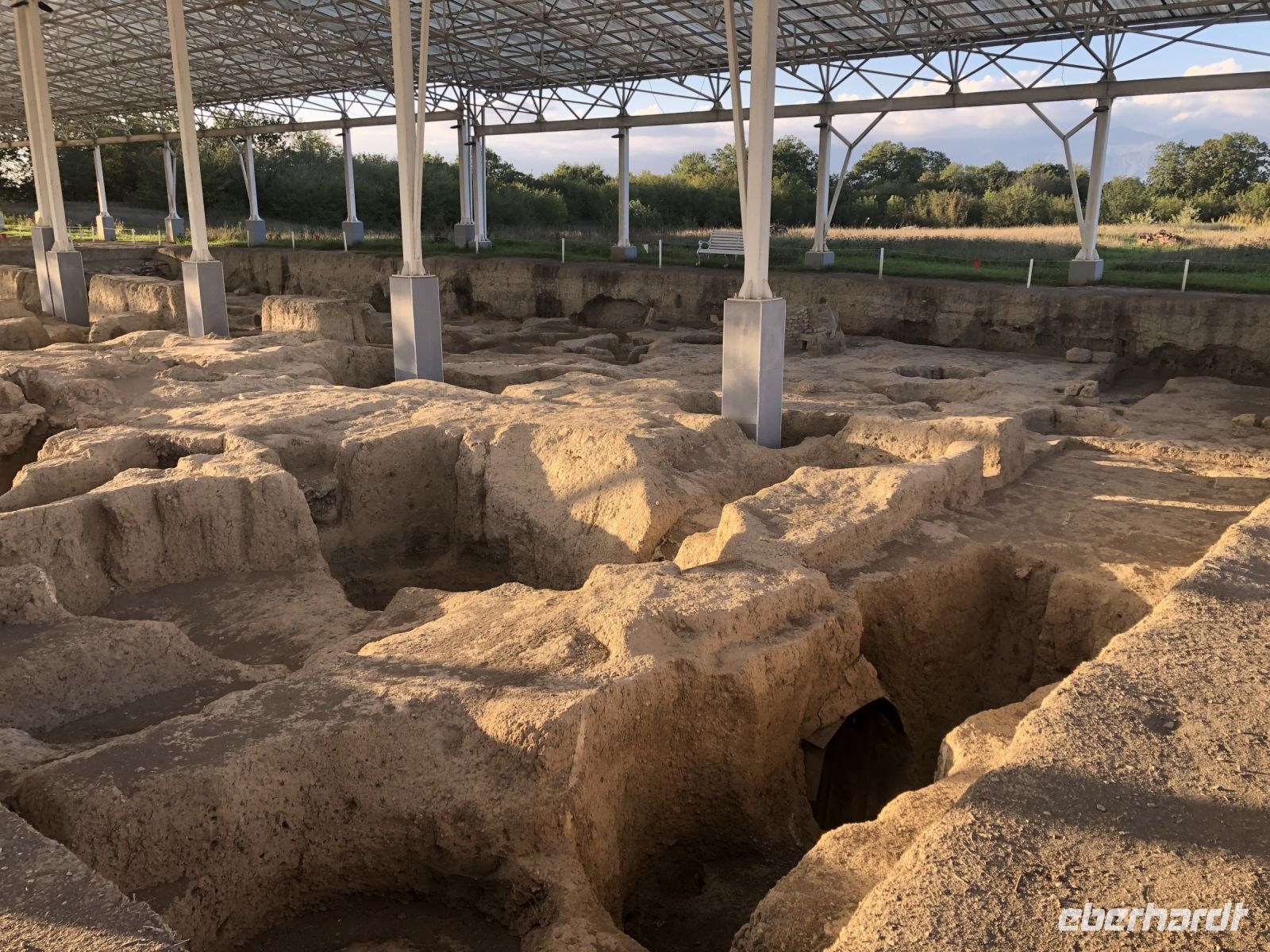 Spät, aber dafür in einer mystischen Abendstimmung, besuchen wir dann noch Cuxur Gabala, die Hauptstadt des antiken Königreichs Albanien: heute eine beschauliche archäologische Stätte mit kleinem Museum und Ruinen aus dem 5. Jahrhundert auf einer einsamen großen Wiese.
