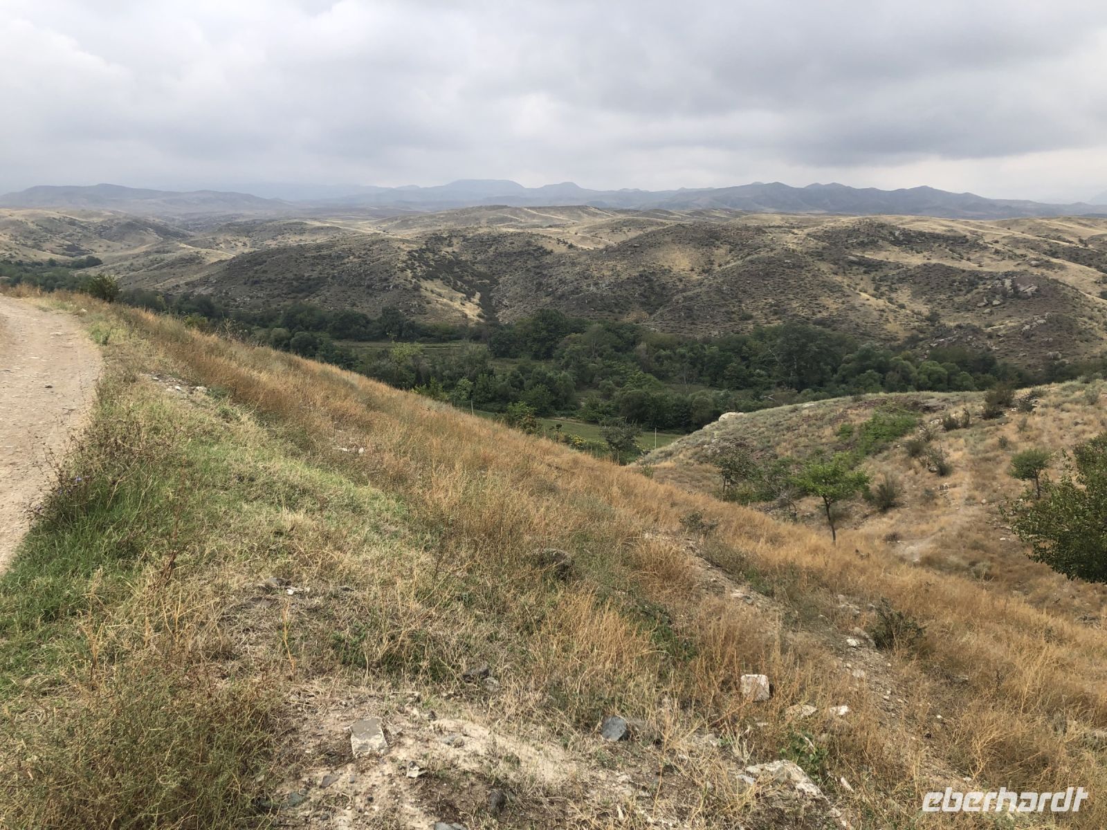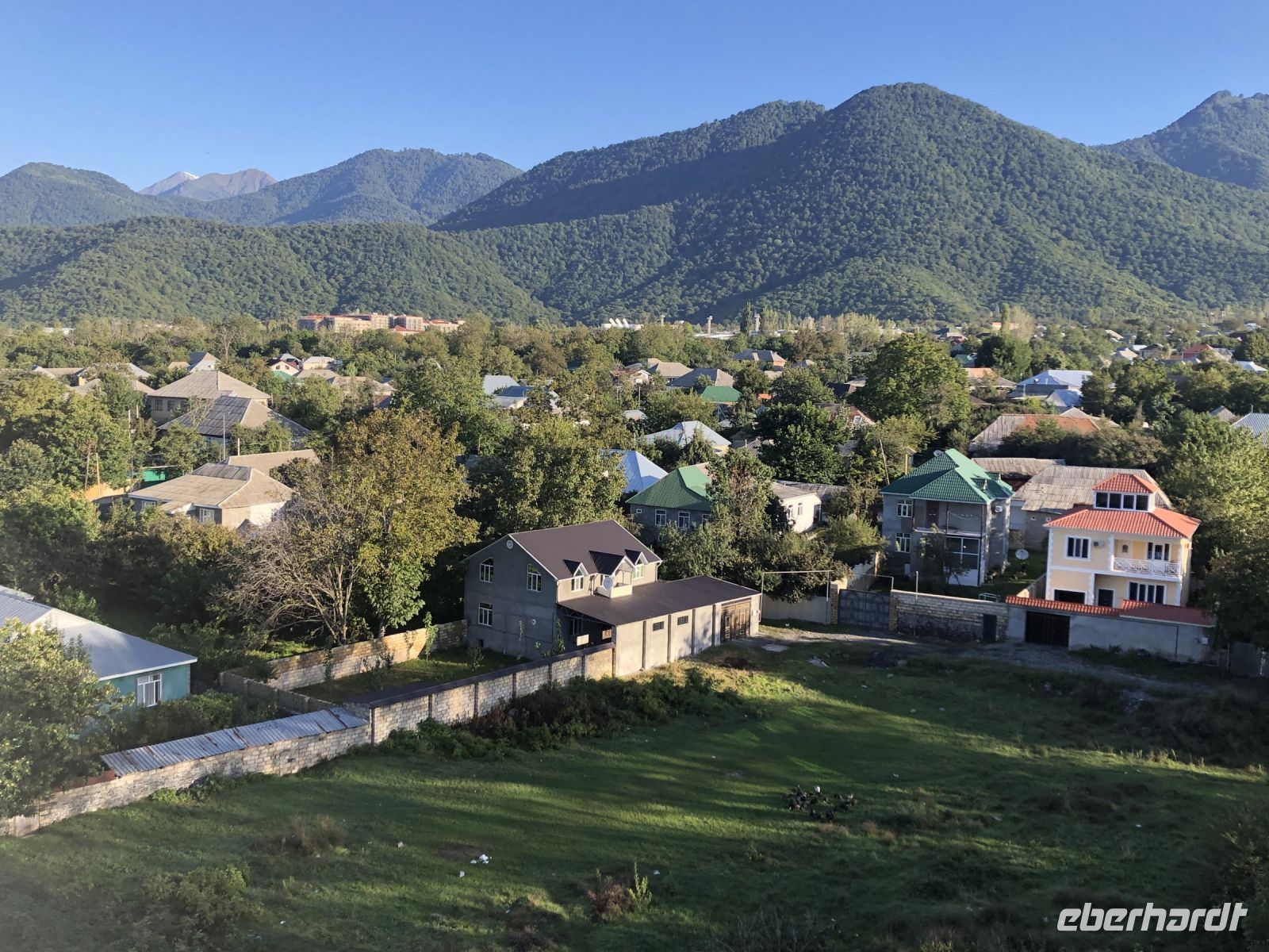 Die Weiterfahrt nach Sheki führt uns durch grüne Landschaften mit Ackerbau und Viehzucht, und immer auch mit Blick auf den Großen Kaukasus.