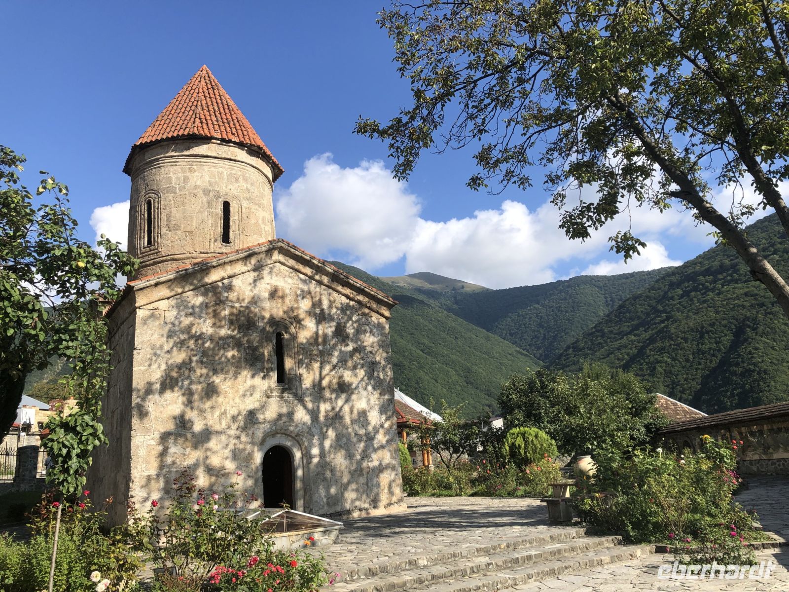 Dort angekommen steigen wir auf 3 Taxen um, die uns die gepflasterte Straße hoch ins ursprüngliche Bergdorf Kis bringen, wo wir die angeblich älteste des antiken christlich geprägten und geheimnisvollen Reiches Albanien besichtigen - "Mutter aller Kaukasus-Kirchen".