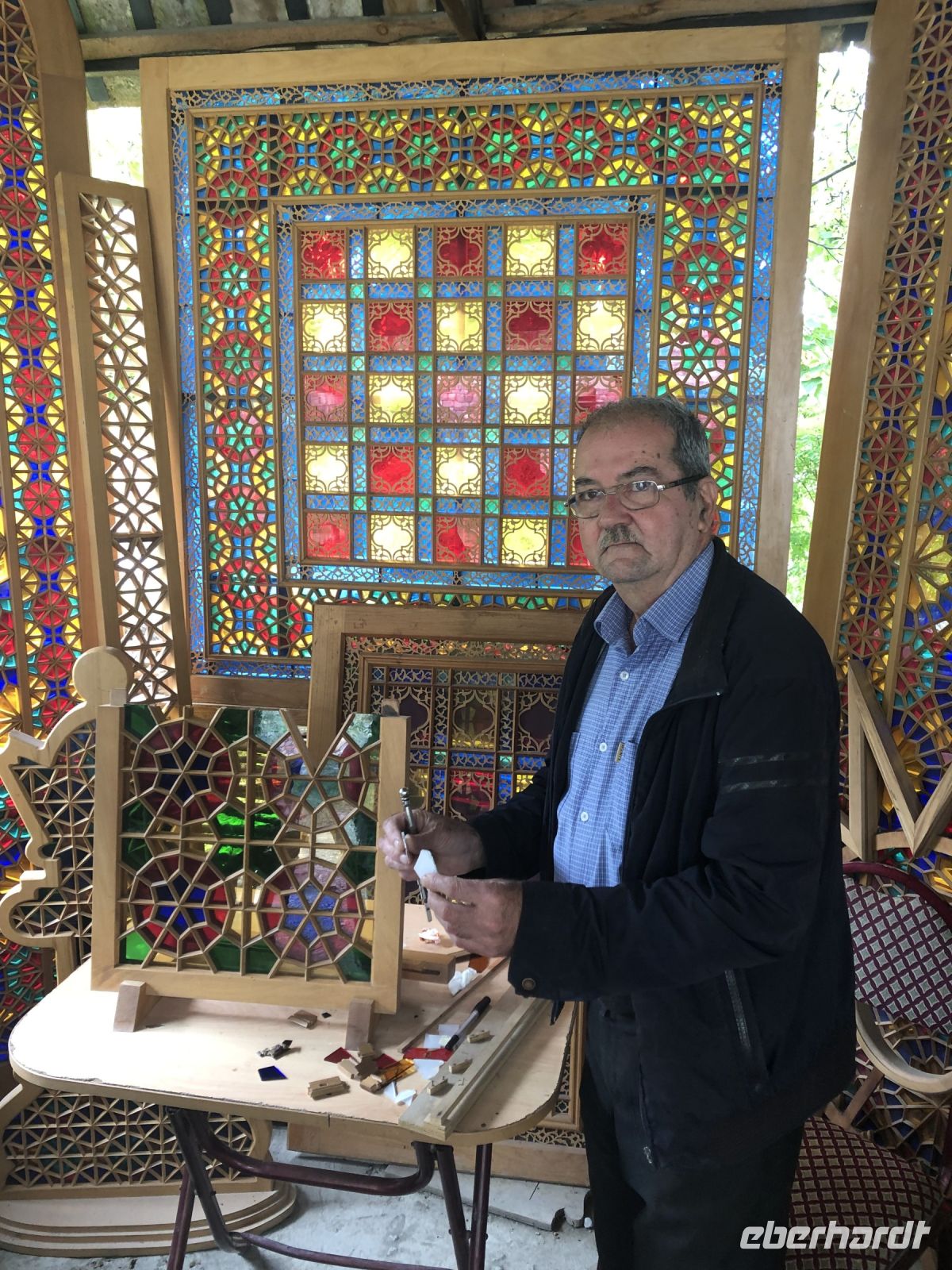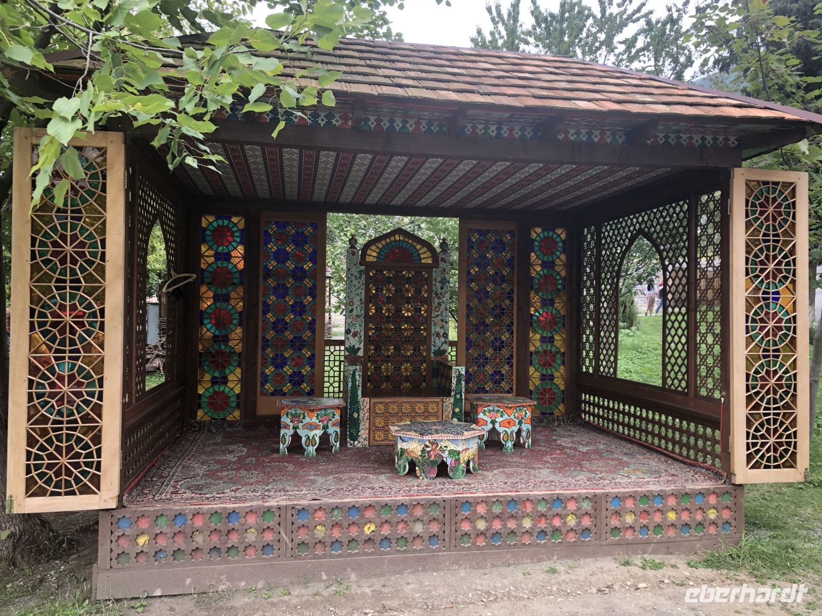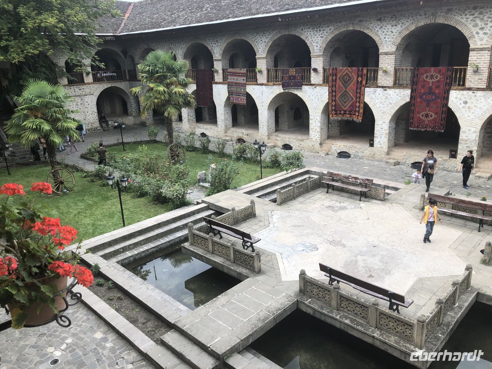Um die Mittagszeit geht es um die von einer Steinmauer umgebene Altstadt. Der berühmte Khanspalast aus dem 18. Jahrhundert - Die Region um Sheki war zu dieser Zeit ein autonomes Fürstentum - inmitten eines Rosengartens ist heute UNESCO-Weltkulturerbe. Die Wände der Innenräume dieser Sommerresidenz sind verziert mit herrlichen Fresken von Blumen, Vögeln und Jagdszenen, und die leuchtenden bunten Farben der Fenster verzaubern uns. Es handelt sich um sogenannte Shebeke-Mosaik-Fenster aus Glas und Holz ganz ohne Nägel und Schrauben. Ein Meister dieser Handwerkskunst führt uns später anschaulich in diese traditionelle Technologie ein. Schon in alten Zeiten wurde dafür Muranoglas auf der Seidenstraße hierher gebracht und gegen Seide und Gewürze eingetauscht.