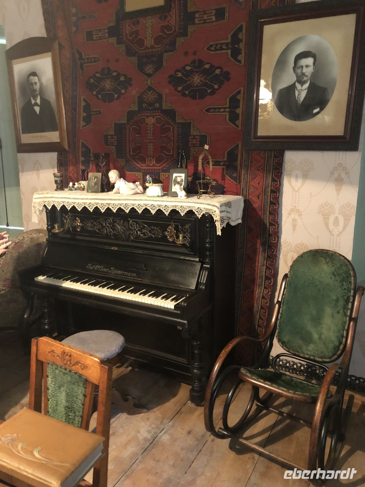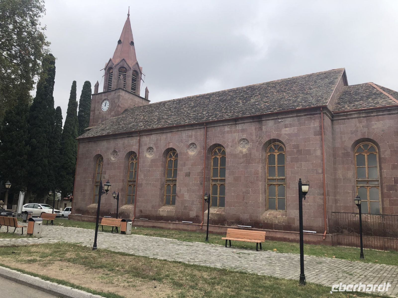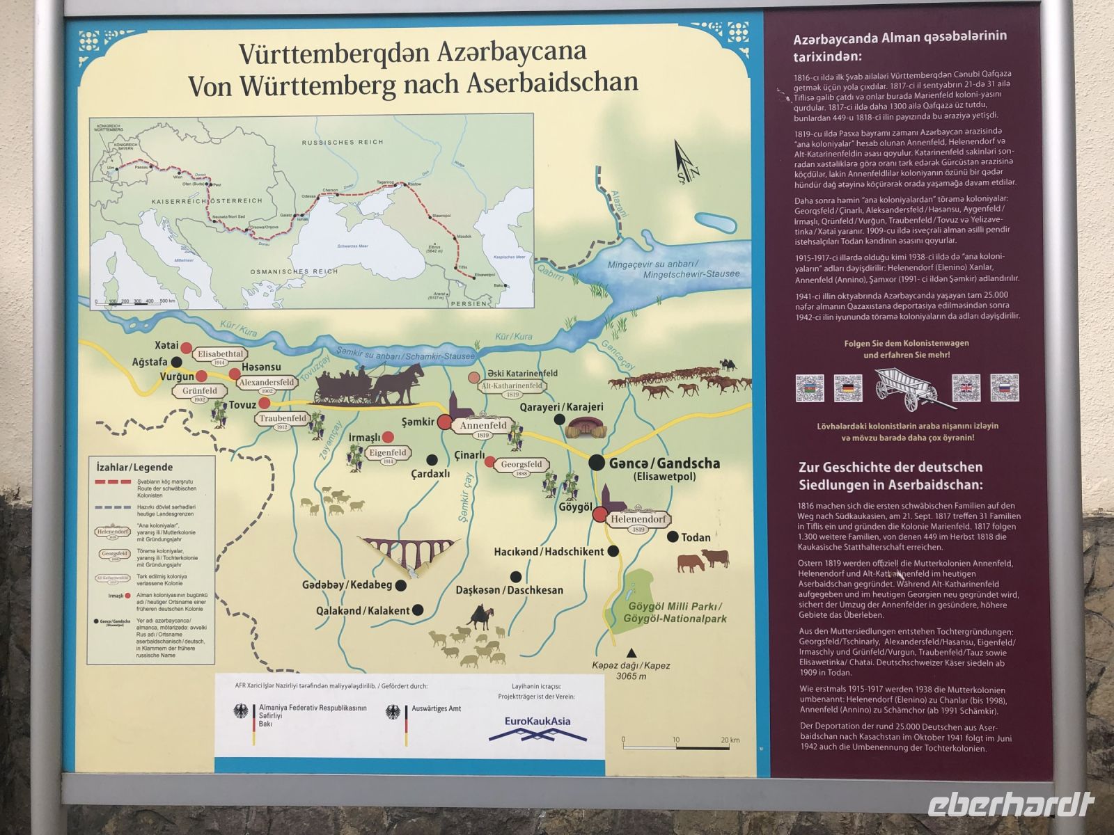 Unser für den heutigen Tag gewiss spannendstes Ziel ist Göygöl, die ehemalige deutsche Siedlung "Helenendorf", der ersten und größten kaukasiendeutschen Kolonie in Aserbeidschan. Sie wurde 1819 von Siedlern aus der Gegend des schwäbischen Reutlingen gegründet, wobei die etwa 140 Familien zunächst Milchwirtschaft, später Weinbau betrieben. 1941 jedoch wurden sie von Stalin nach Kasachstan und Sibirien umgesiedelt. Im mit Bäumen gesäumten Zentrum stehen noch immer eine evangelische Pfarrkirche, eine Schule und Dutzende deutscher Häuser. Jenes des letzten deutschen Bewohners Viktor Klein in der Helenenstraße, das zu einem Museum umgebaut wird, dürfen wir betreten und das interessante Inventar bis hin zu von ihm selbst konstruierten Sportgeräten bestaunen. Der alte Friedhof außerhalb mit den teilweise umgestürzten alten Grabsteinen und dem herrlichen Blick auf den Kleinen Kaukasus ist ein durchaus spektakulärer Ort.