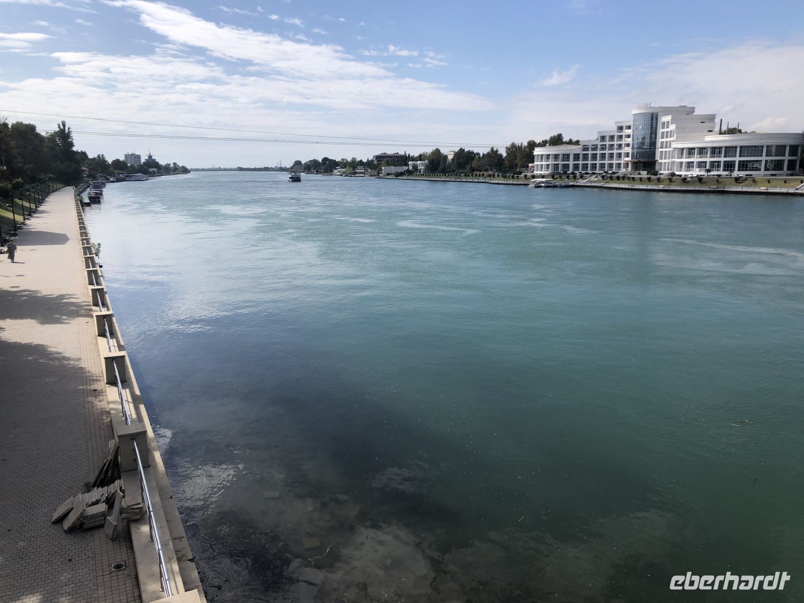 In der typisch sowjetisch anmutenden Stadt Mingachevir, 1948 gegründet, genießen wir unseren mittäglichen Stopp direkt an der Kura mit Blick auf ein Wasserkraftwerk, dem in den fünfziger Jahren größten in der ganzen Sowjetunion. Dahinter verbirgt sich ein 70 Kilometer langer Stausee mit einer Fläche von 600 Quadratkilometern.