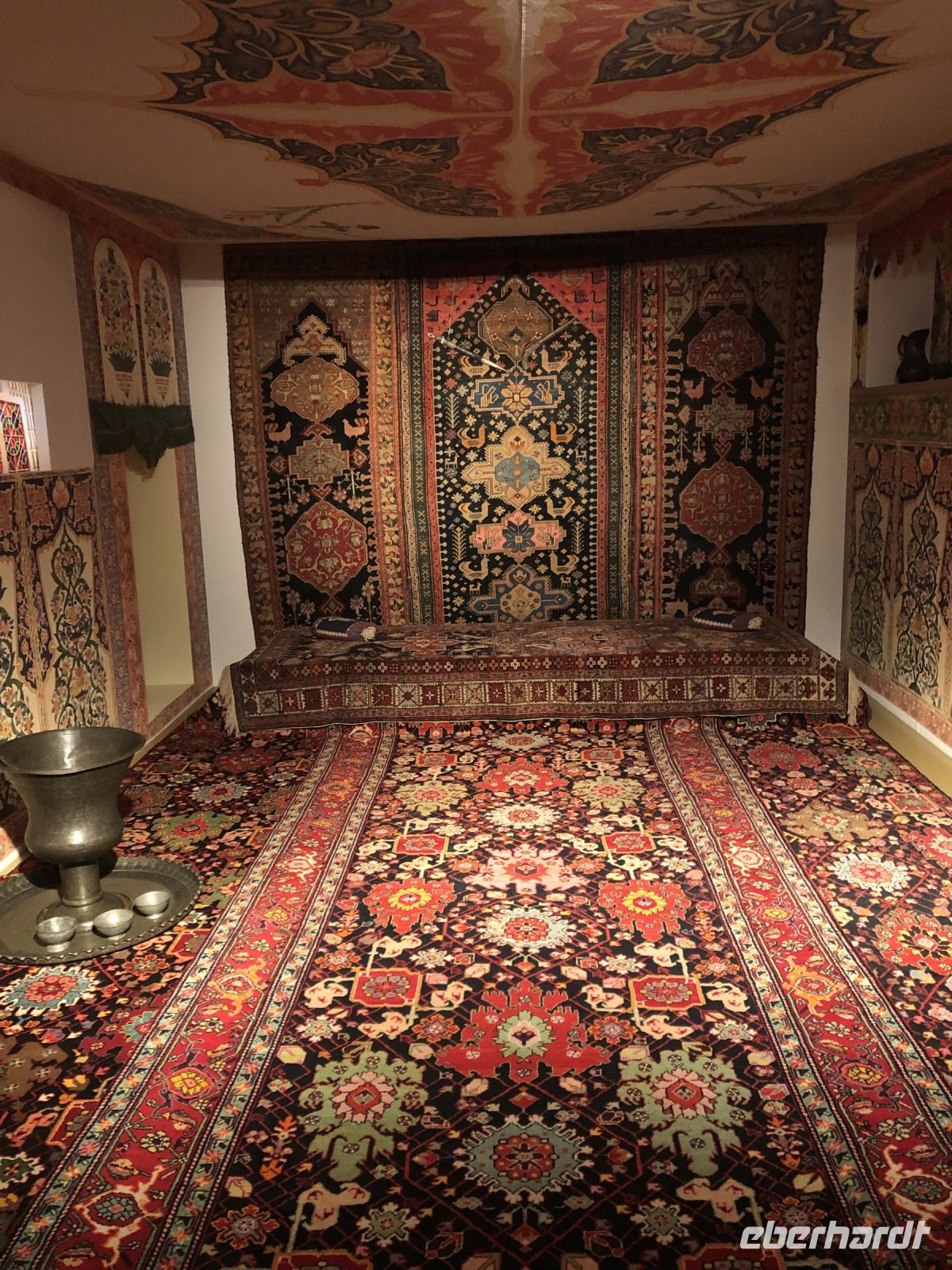 Der spektakuläre Neubau des Teppichmuseums sieht von außen tatsächlich aus wie ein zusammengerollter Läufer. Bevor das Erdöl Aserbeidschan zu Reichtum verhalf, waren Teppiche die größte Einnahmequelle des Landes. Bei unserer Führung im Inneren gibt es nicht nur wunderschöne Teppiche zu bewundern sondern auch einen Webstuhl, Keramik, Schmuck und Gewänder.