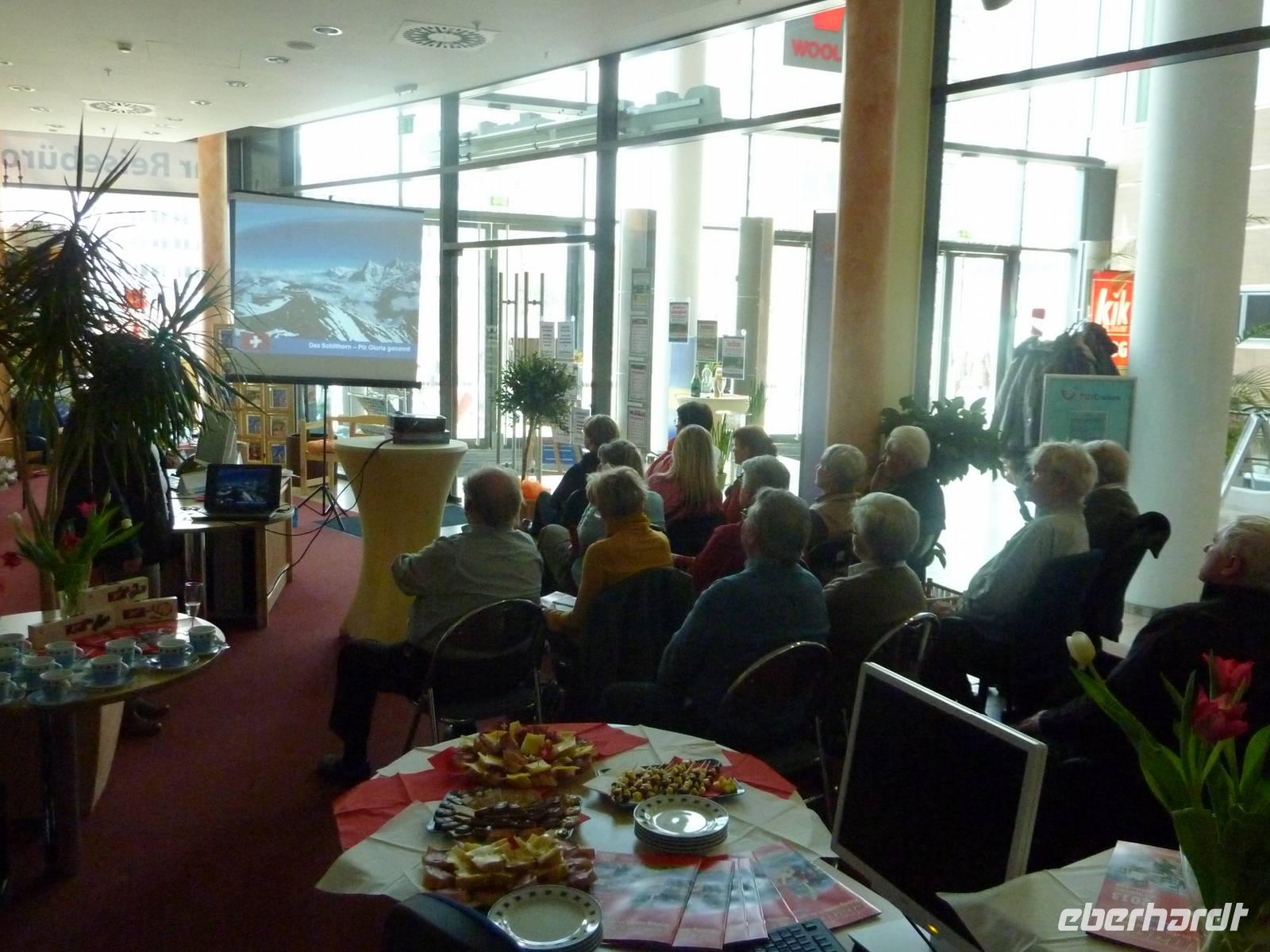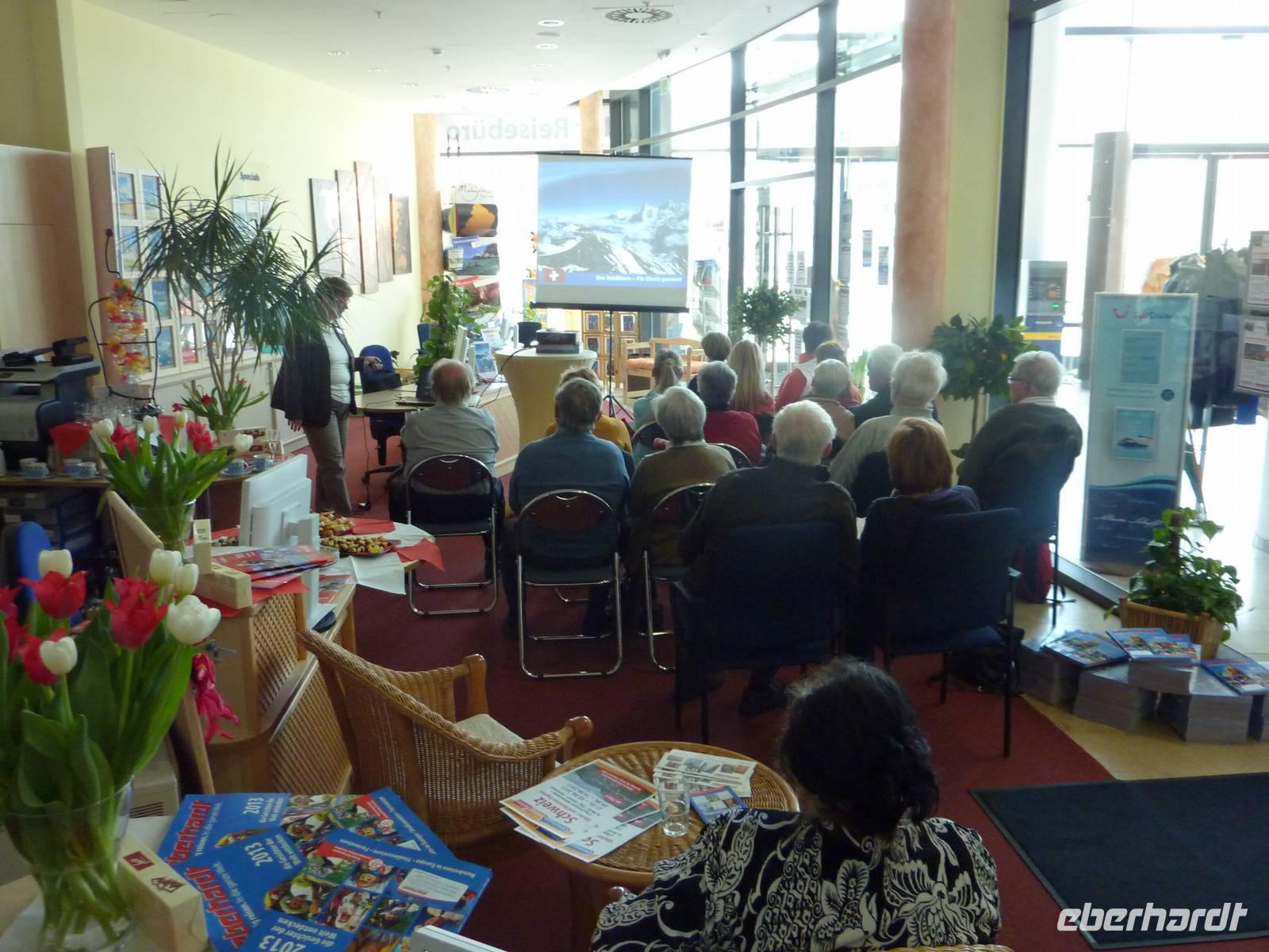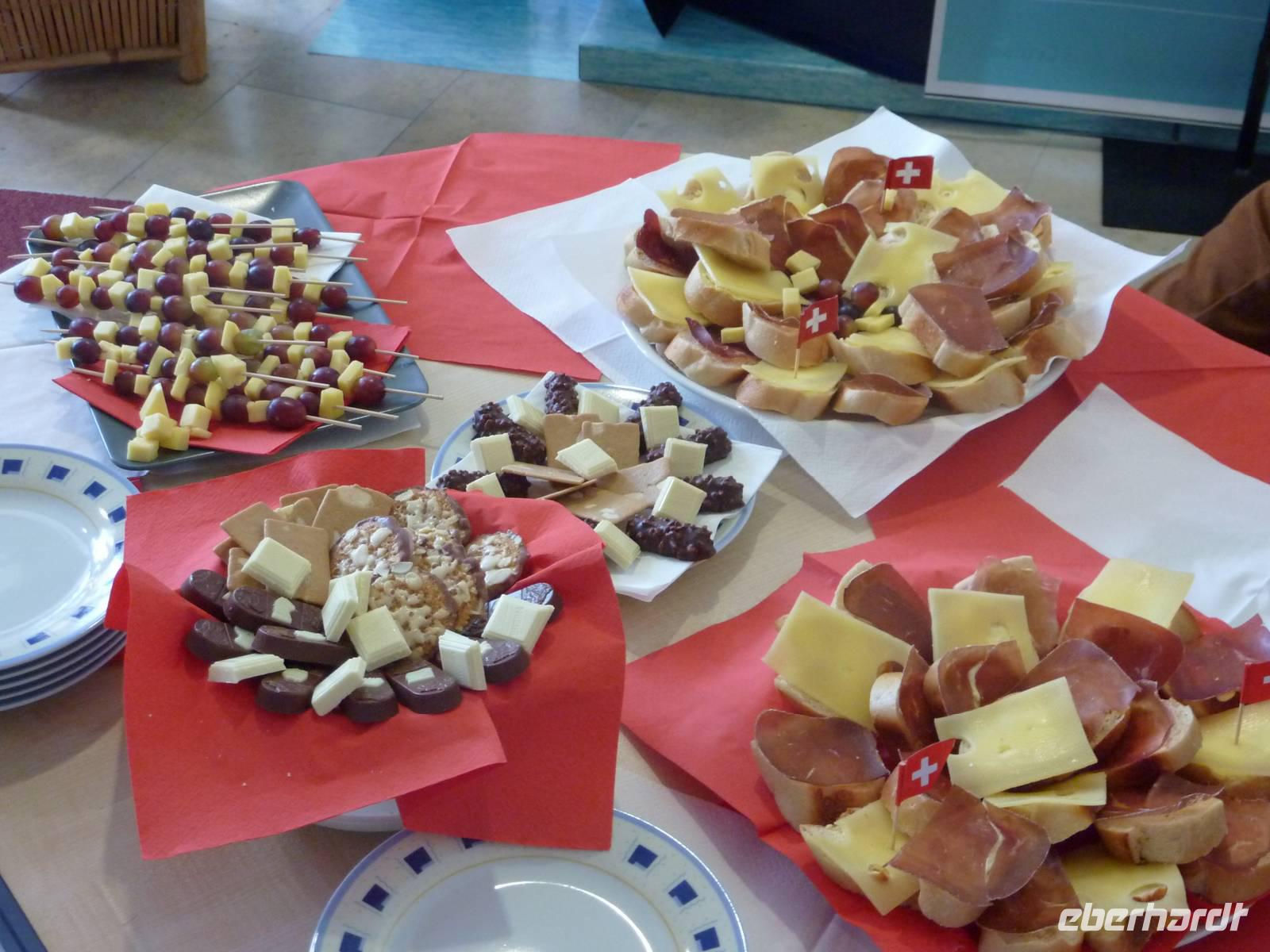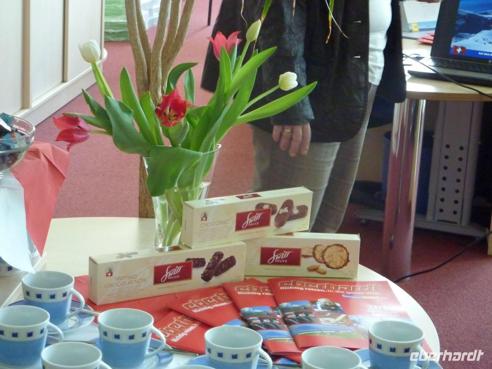 Die Eberhardt-Produktmanagerin zeigte uns faszinierende Panoramen, wunderschöne Seen und traumhafte Bergbahnfahrten in einem 2-stündigen Vortrag im Eberhardt-Reisezentrum-PragerSpitze. Abgerundet mit Köstlichkeiten aus der Schweiz waren wir weit von der sächsischen Landeshauptstadt entfernt. Wir genossen Baguette mit Emmentaler und Bündner-Fleisch und natürlich durfte die leckere Schweizer Schokolade nicht fehlen.