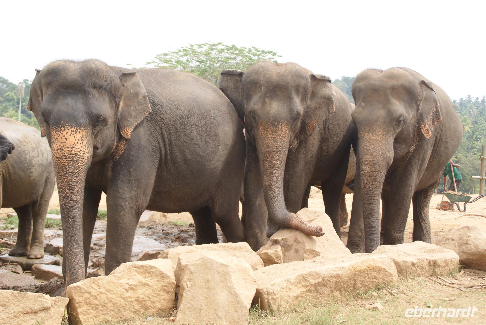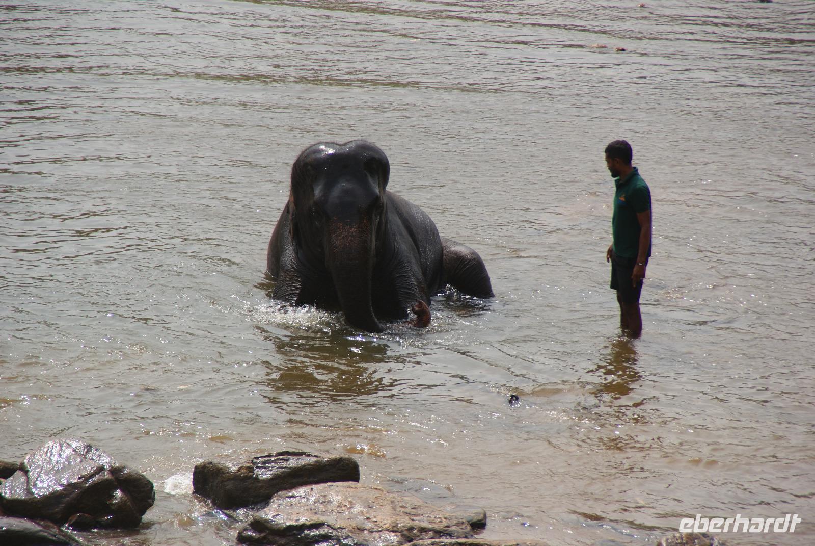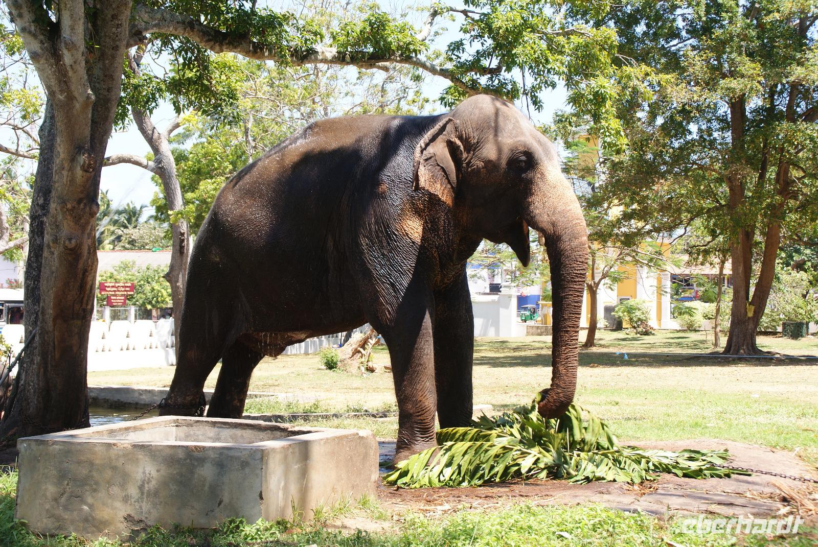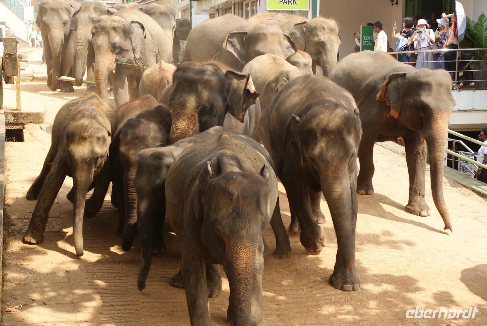 Nach einer angenehmen Nacht in unserem wunderbaren Hotel und einem herrlichen Frühstück starten wir gut gelaunt unser Programm. Unser Busfahrer Chandara empfängt uns wie jeden Morgen herzlich mit frisch gepflückten Blumen! Daran können wir uns wirklich gewöhnen! Wir beginnen mit dem weltberühmten Zahntempel von Kandy und lassen das buddhistische Treiben mit all seinen Gläubigen auf uns wirken. Beeindruckt reihen wir uns in die endlose Schlange der Tempelbesucher und ihrer Opfergaben ein und erhaschen ebenfalls einen kurzen Blick auf den goldenen Schrein, in dem ein Zahn Buddhas vorhanden sein soll. Bevor es anschließend weiter zum Elefantenwaisenhaus von Pinnawala geht, genießen wir Kaffee und Tee im Queen's Pastry Shop des altehrwürdigen Queen's Hotel. Dieses Haus hat eine 160 jährige Geschichte und gilt als eins der ältesten und ersten Hotels Sri Lankas. In Pinnawala angekommen, besuchen wir zunächst die Elefanten auf ihrem 12 Hektar großen Areal, welches insgesamt ca. 80 dieser Tiere beherbergt und schauen diesen danach beim Spaziergang durch die Fußgängerzone zum Fluss zu. Das anschließende Baden im Fluss (welches zwei Mal am Tag durchgeführt wird) findet aufgrund Wassermangels nur mäßig statt und die friedlichen Dickhäuter müssen sich in diesen Tagen mit einem Fußbad begnügen. Von unserem Reiseleiter hören wir, dass jeder Arbeitselefant einen Mahut (Betreuer) hat, der möglichst ein Leben lang mit dem Tier arbeitet und ihm an die 40 Befehle beibringen kann.