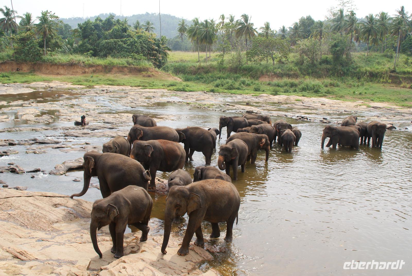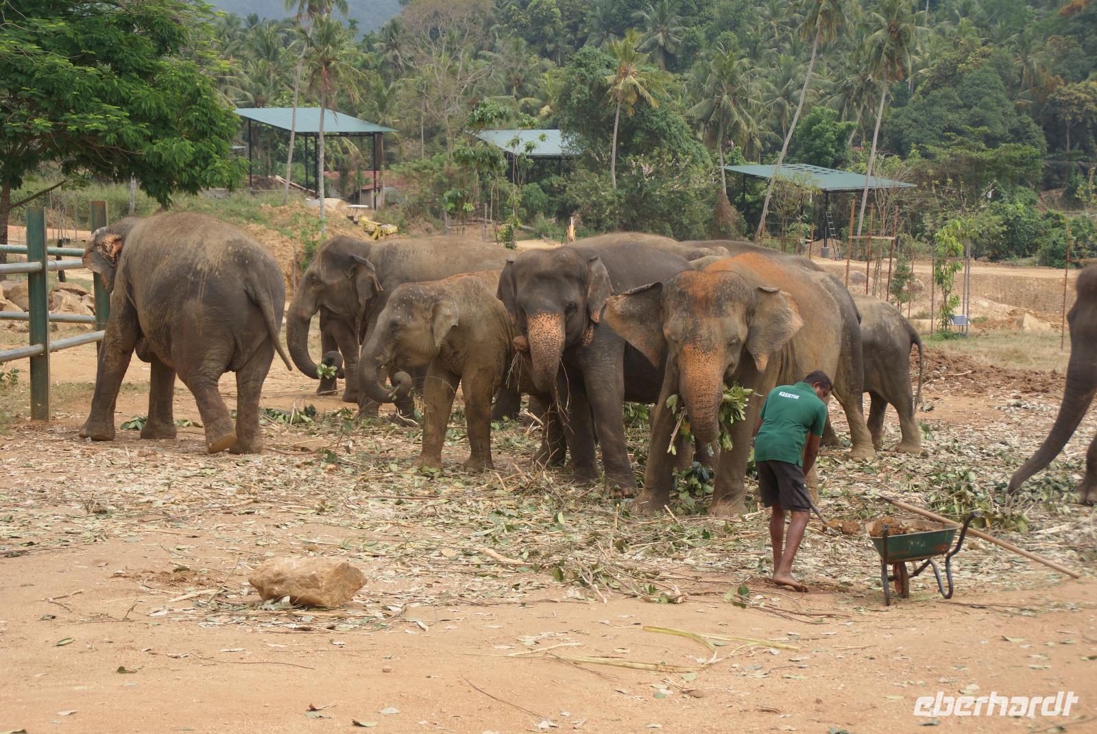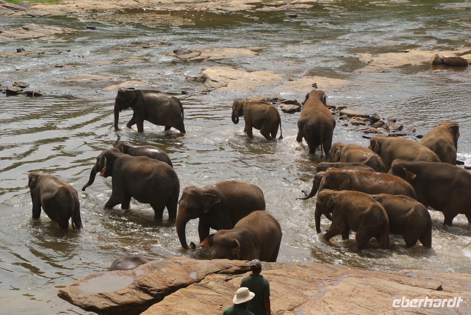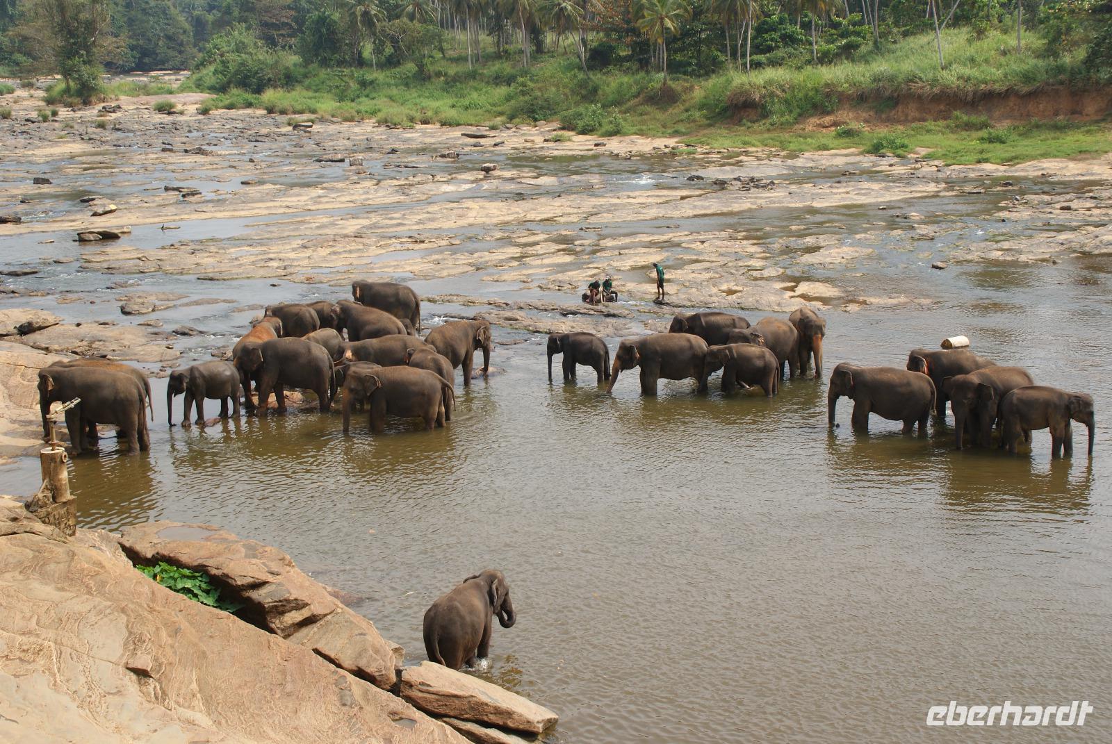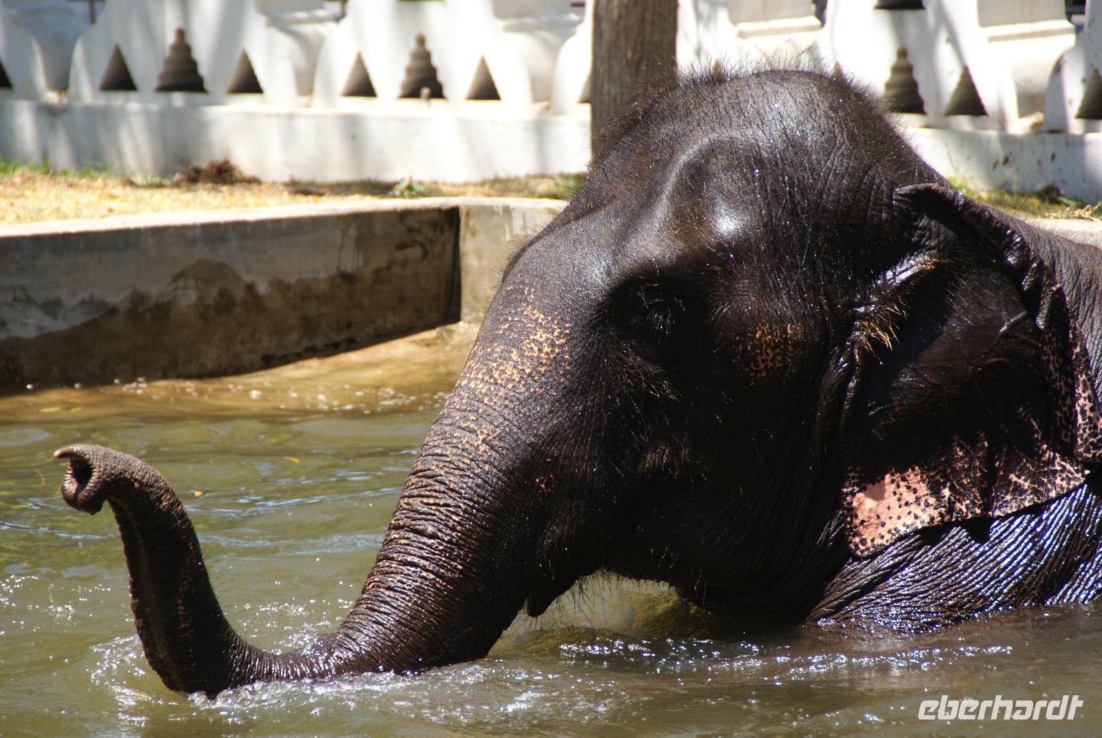 Nach einer angenehmen Nacht in unserem wunderbaren Hotel und einem herrlichen Frühstück starten wir gut gelaunt unser Programm. Unser Busfahrer Chandara empfängt uns wie jeden Morgen herzlich mit frisch gepflückten Blumen! Daran können wir uns wirklich gewöhnen! Wir beginnen mit dem weltberühmten Zahntempel von Kandy und lassen das buddhistische Treiben mit all seinen Gläubigen auf uns wirken. Beeindruckt reihen wir uns in die endlose Schlange der Tempelbesucher und ihrer Opfergaben ein und erhaschen ebenfalls einen kurzen Blick auf den goldenen Schrein, in dem ein Zahn Buddhas vorhanden sein soll. Bevor es anschließend weiter zum Elefantenwaisenhaus von Pinnawala geht, genießen wir Kaffee und Tee im Queen's Pastry Shop des altehrwürdigen Queen's Hotel. Dieses Haus hat eine 160 jährige Geschichte und gilt als eins der ältesten und ersten Hotels Sri Lankas. In Pinnawala angekommen, besuchen wir zunächst die Elefanten auf ihrem 12 Hektar großen Areal, welches insgesamt ca. 80 dieser Tiere beherbergt und schauen diesen danach beim Spaziergang durch die Fußgängerzone zum Fluss zu. Das anschließende Baden im Fluss (welches zwei Mal am Tag durchgeführt wird) findet aufgrund Wassermangels nur mäßig statt und die friedlichen Dickhäuter müssen sich in diesen Tagen mit einem Fußbad begnügen. Von unserem Reiseleiter hören wir, dass jeder Arbeitselefant einen Mahut (Betreuer) hat, der möglichst ein Leben lang mit dem Tier arbeitet und ihm an die 40 Befehle beibringen kann.