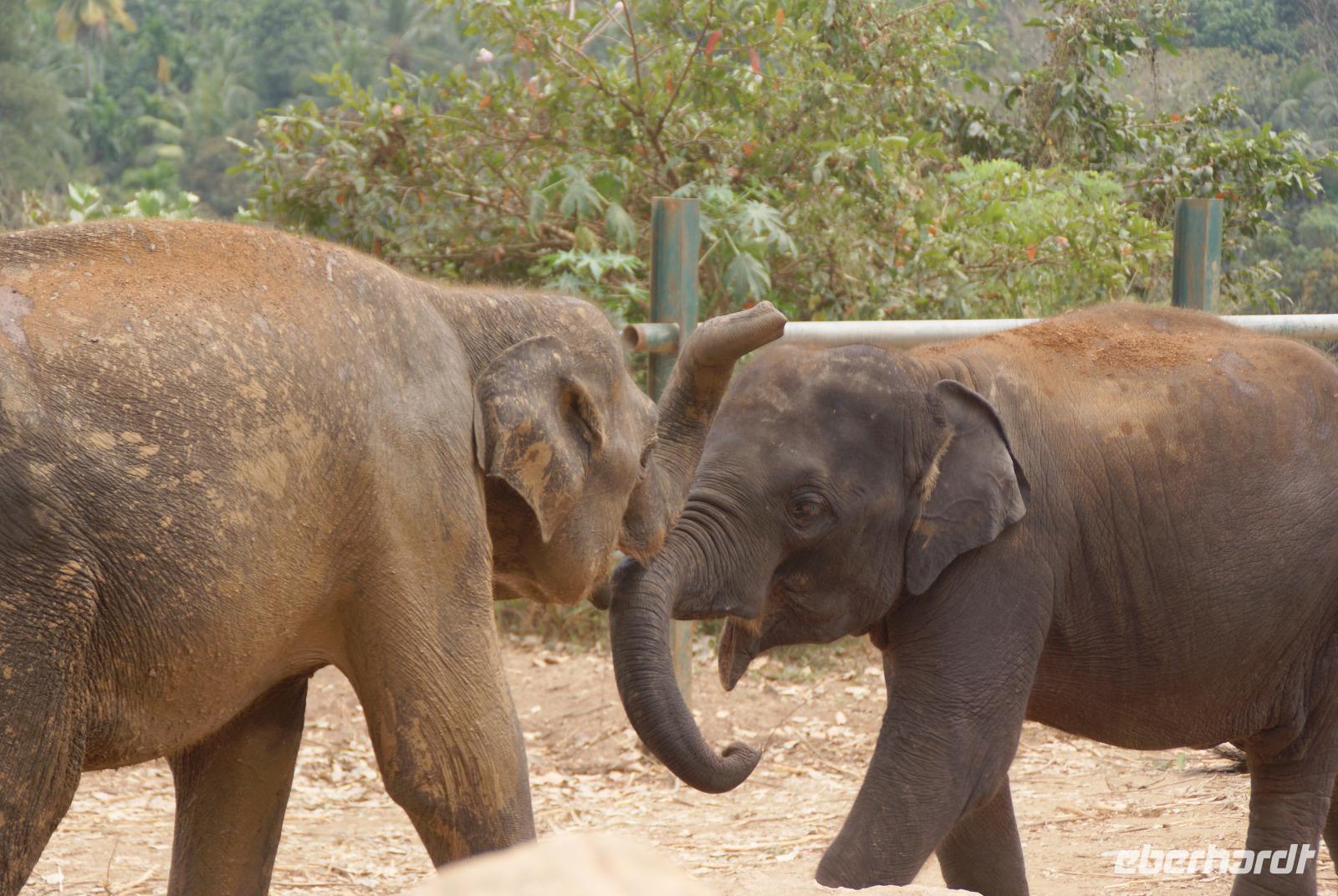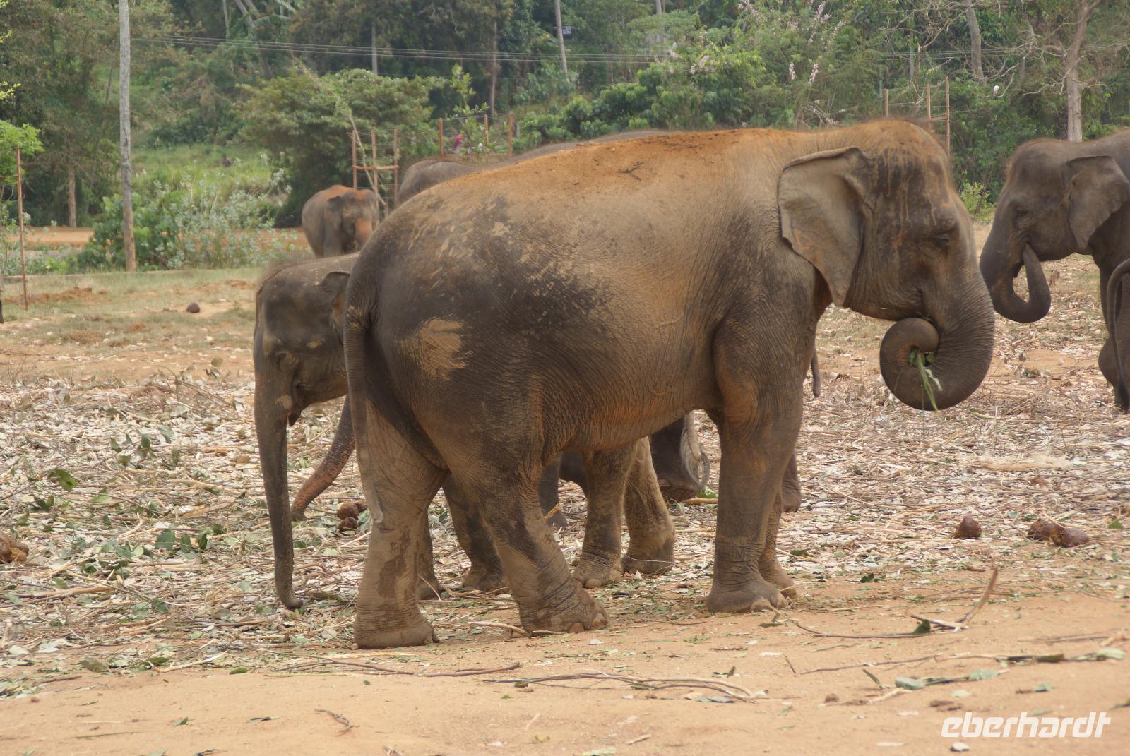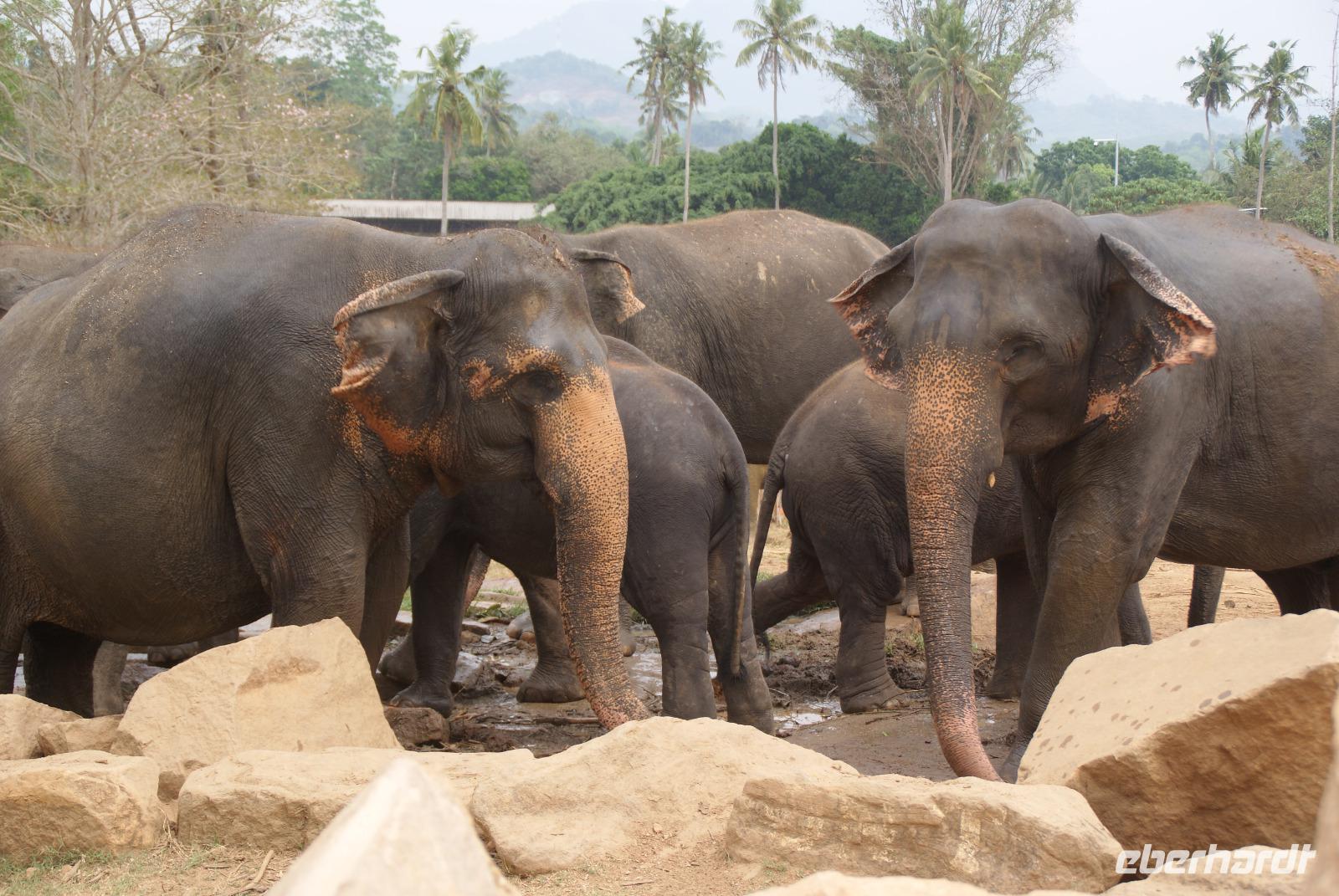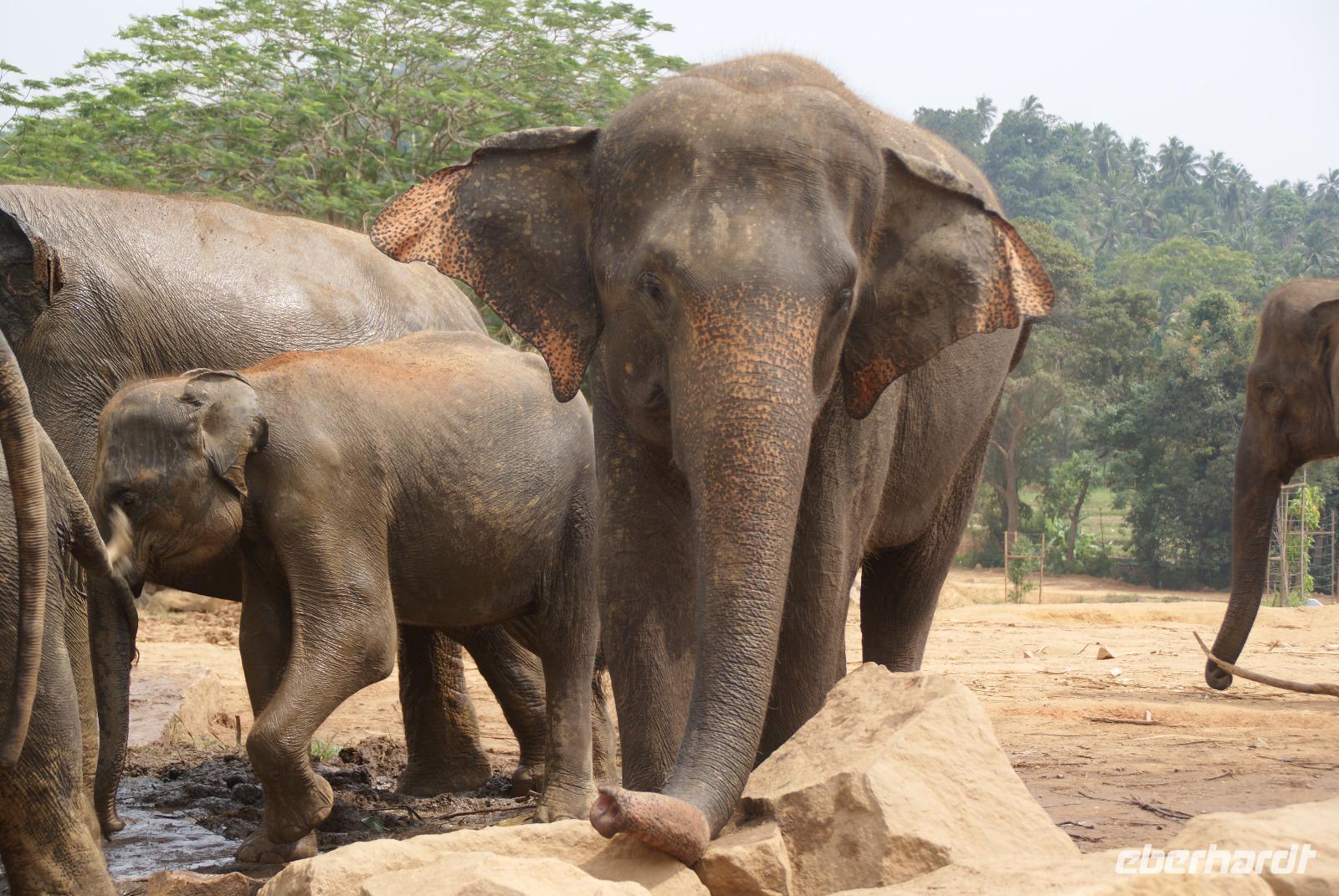 Nach einer angenehmen Nacht in unserem wunderbaren Hotel und einem herrlichen Frühstück starten wir gut gelaunt unser Programm. Unser Busfahrer Chandara empfängt uns wie jeden Morgen herzlich mit frisch gepflückten Blumen! Daran können wir uns wirklich gewöhnen! Wir beginnen mit dem weltberühmten Zahntempel von Kandy und lassen das buddhistische Treiben mit all seinen Gläubigen auf uns wirken. Beeindruckt reihen wir uns in die endlose Schlange der Tempelbesucher und ihrer Opfergaben ein und erhaschen ebenfalls einen kurzen Blick auf den goldenen Schrein, in dem ein Zahn Buddhas vorhanden sein soll. Bevor es anschließend weiter zum Elefantenwaisenhaus von Pinnawala geht, genießen wir Kaffee und Tee im Queen's Pastry Shop des altehrwürdigen Queen's Hotel. Dieses Haus hat eine 160 jährige Geschichte und gilt als eins der ältesten und ersten Hotels Sri Lankas. In Pinnawala angekommen, besuchen wir zunächst die Elefanten auf ihrem 12 Hektar großen Areal, welches insgesamt ca. 80 dieser Tiere beherbergt und schauen diesen danach beim Spaziergang durch die Fußgängerzone zum Fluss zu. Das anschließende Baden im Fluss (welches zwei Mal am Tag durchgeführt wird) findet aufgrund Wassermangels nur mäßig statt und die friedlichen Dickhäuter müssen sich in diesen Tagen mit einem Fußbad begnügen. Von unserem Reiseleiter hören wir, dass jeder Arbeitselefant einen Mahut (Betreuer) hat, der möglichst ein Leben lang mit dem Tier arbeitet und ihm an die 40 Befehle beibringen kann.