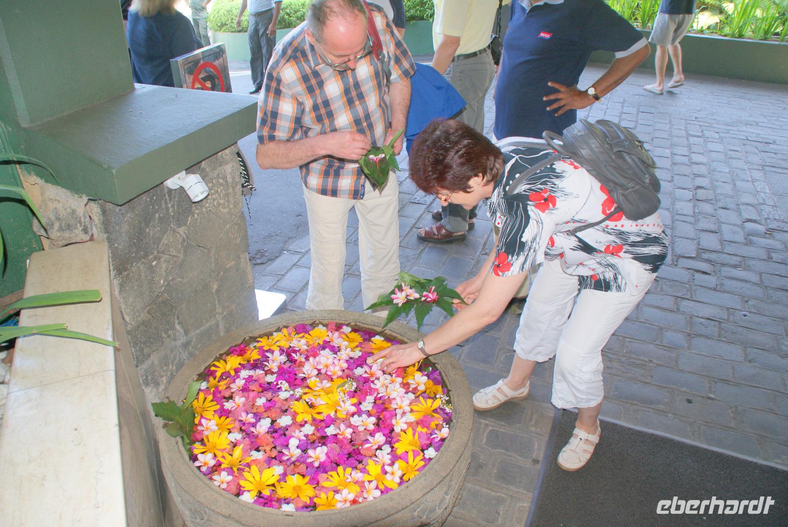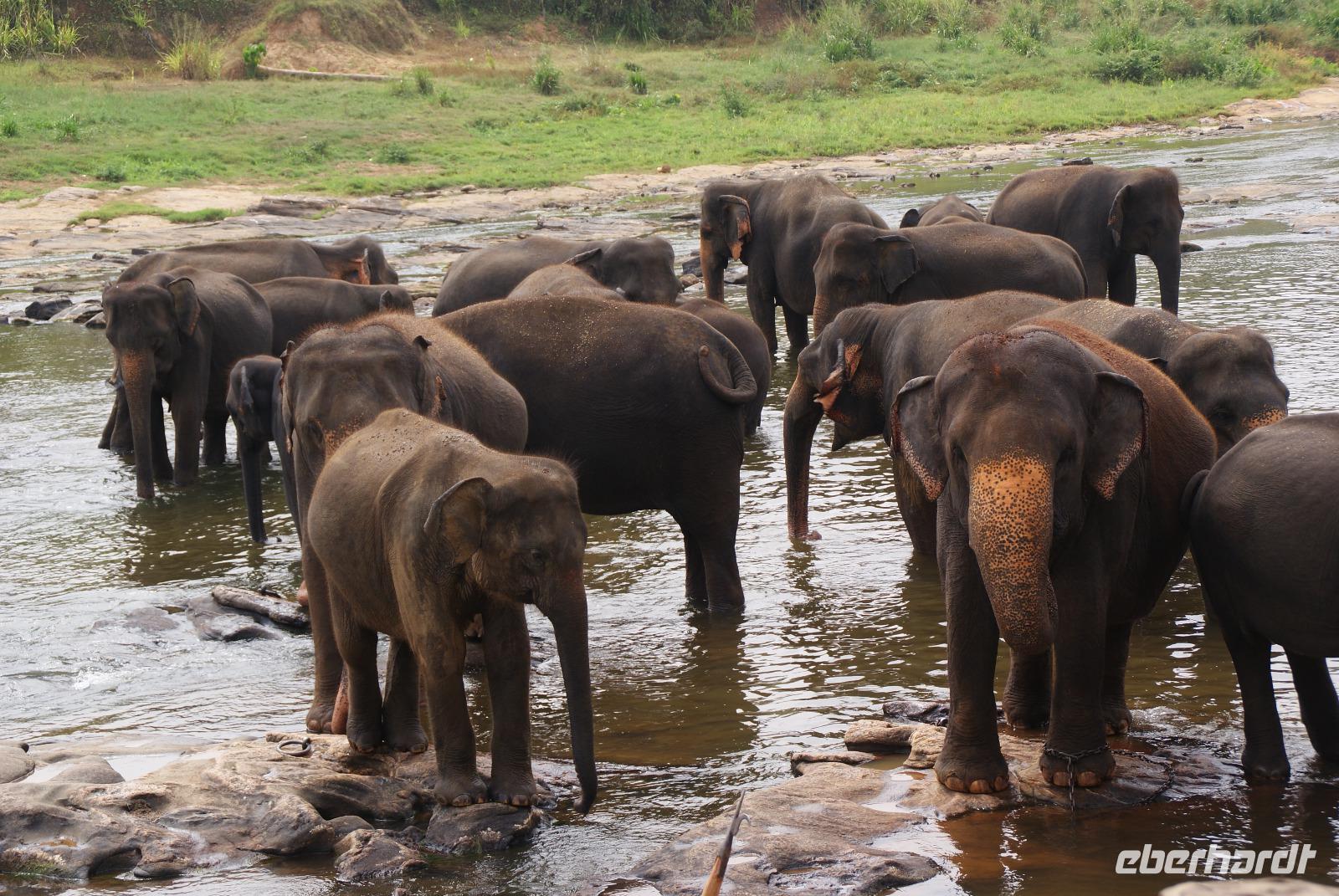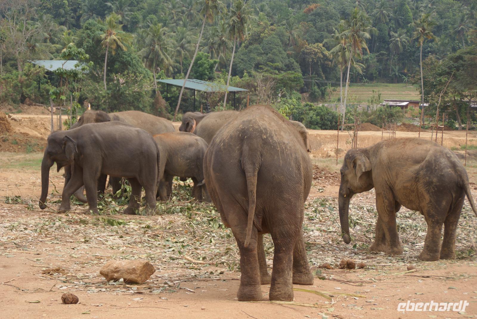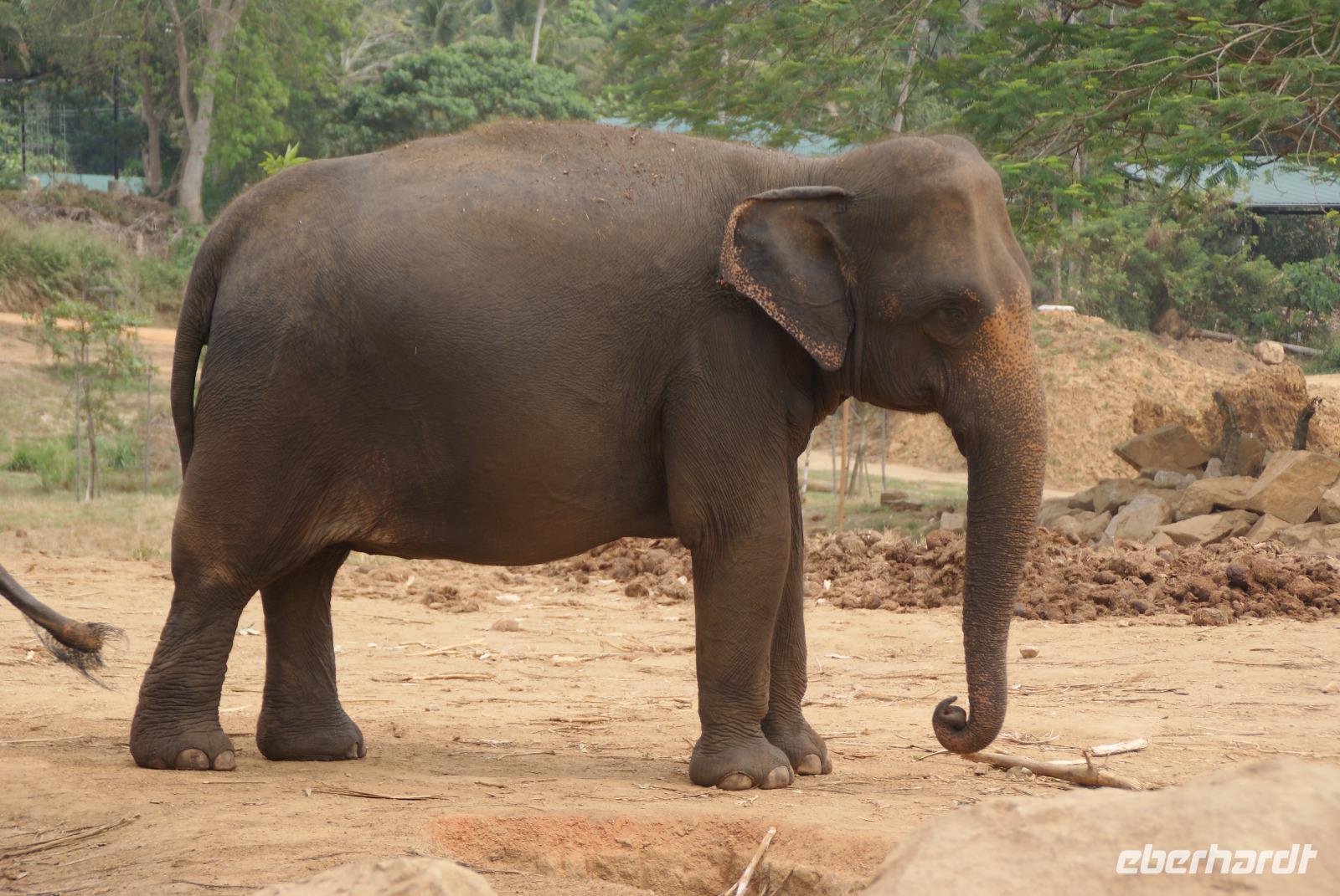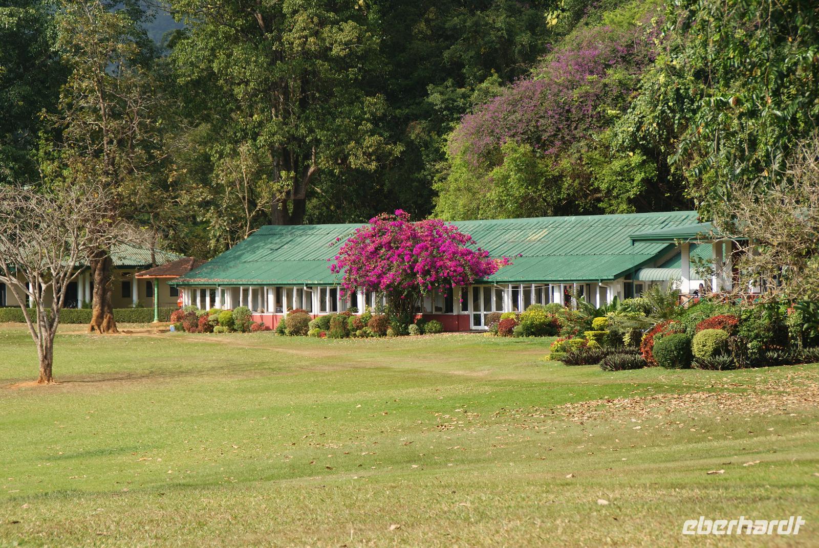 Nach einer angenehmen Nacht in unserem wunderbaren Hotel und einem herrlichen Frühstück starten wir gut gelaunt unser Programm. Unser Busfahrer Chandara empfängt uns wie jeden Morgen herzlich mit frisch gepflückten Blumen! Daran können wir uns wirklich gewöhnen! Wir beginnen mit dem weltberühmten Zahntempel von Kandy und lassen das buddhistische Treiben mit all seinen Gläubigen auf uns wirken. Beeindruckt reihen wir uns in die endlose Schlange der Tempelbesucher und ihrer Opfergaben ein und erhaschen ebenfalls einen kurzen Blick auf den goldenen Schrein, in dem ein Zahn Buddhas vorhanden sein soll. Bevor es anschließend weiter zum Elefantenwaisenhaus von Pinnawala geht, genießen wir Kaffee und Tee im Queen's Pastry Shop des altehrwürdigen Queen's Hotel. Dieses Haus hat eine 160 jährige Geschichte und gilt als eins der ältesten und ersten Hotels Sri Lankas. In Pinnawala angekommen, besuchen wir zunächst die Elefanten auf ihrem 12 Hektar großen Areal, welches insgesamt ca. 80 dieser Tiere beherbergt und schauen diesen danach beim Spaziergang durch die Fußgängerzone zum Fluss zu. Das anschließende Baden im Fluss (welches zwei Mal am Tag durchgeführt wird) findet aufgrund Wassermangels nur mäßig statt und die friedlichen Dickhäuter müssen sich in diesen Tagen mit einem Fußbad begnügen. Von unserem Reiseleiter hören wir, dass jeder Arbeitselefant einen Mahut (Betreuer) hat, der möglichst ein Leben lang mit dem Tier arbeitet und ihm an die 40 Befehle beibringen kann.