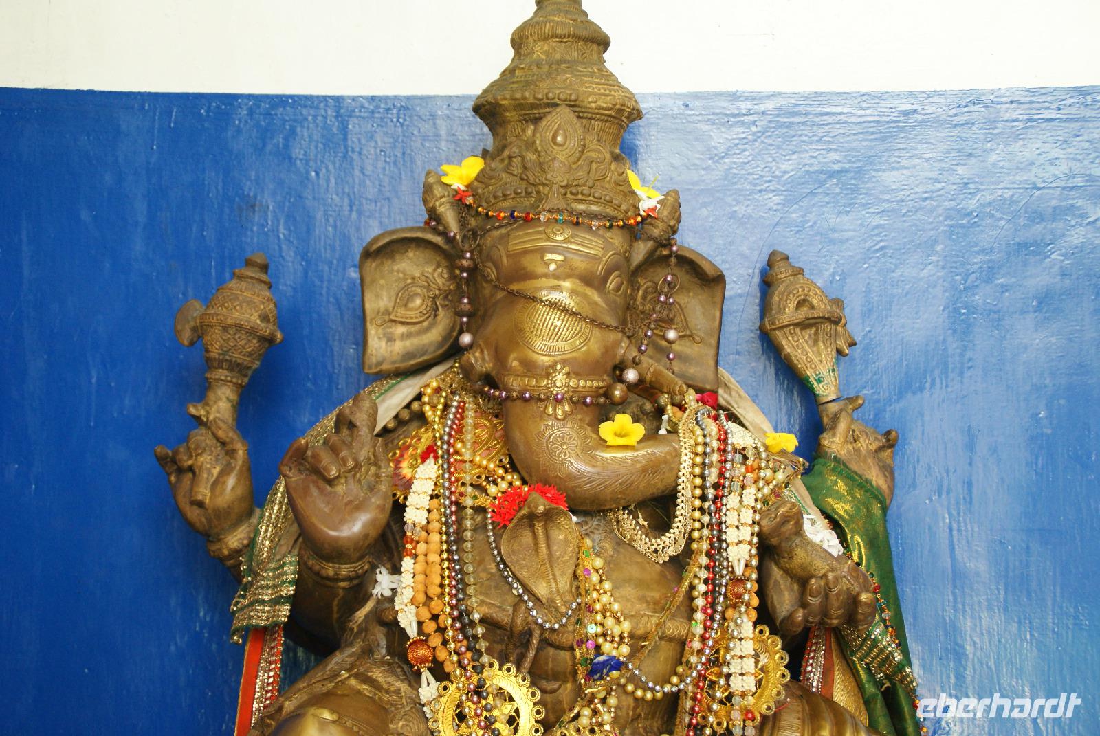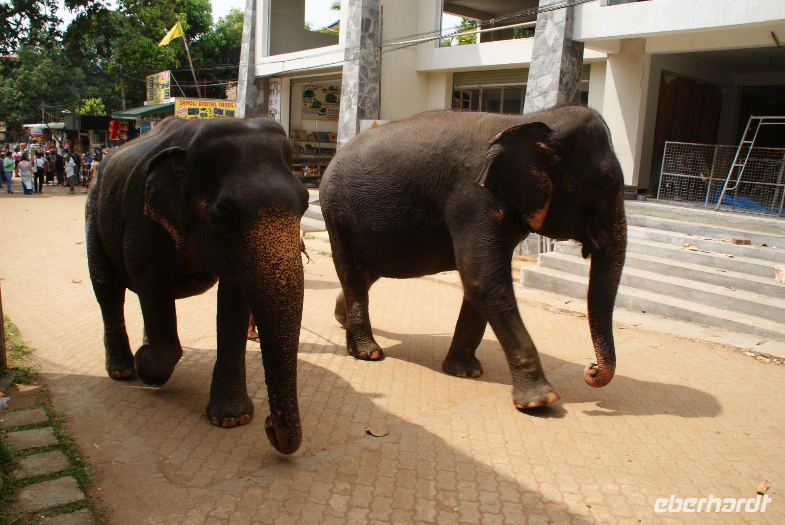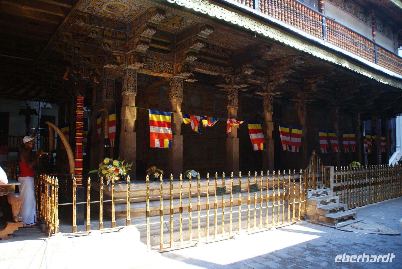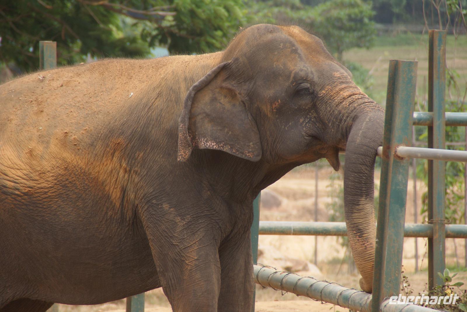 Nach einer angenehmen Nacht in unserem wunderbaren Hotel und einem herrlichen Frühstück starten wir gut gelaunt unser Programm. Unser Busfahrer Chandara empfängt uns wie jeden Morgen herzlich mit frisch gepflückten Blumen! Daran können wir uns wirklich gewöhnen! Wir beginnen mit dem weltberühmten Zahntempel von Kandy und lassen das buddhistische Treiben mit all seinen Gläubigen auf uns wirken. Beeindruckt reihen wir uns in die endlose Schlange der Tempelbesucher und ihrer Opfergaben ein und erhaschen ebenfalls einen kurzen Blick auf den goldenen Schrein, in dem ein Zahn Buddhas vorhanden sein soll. Bevor es anschließend weiter zum Elefantenwaisenhaus von Pinnawala geht, genießen wir Kaffee und Tee im Queen's Pastry Shop des altehrwürdigen Queen's Hotel. Dieses Haus hat eine 160 jährige Geschichte und gilt als eins der ältesten und ersten Hotels Sri Lankas. In Pinnawala angekommen, besuchen wir zunächst die Elefanten auf ihrem 12 Hektar großen Areal, welches insgesamt ca. 80 dieser Tiere beherbergt und schauen diesen danach beim Spaziergang durch die Fußgängerzone zum Fluss zu. Das anschließende Baden im Fluss (welches zwei Mal am Tag durchgeführt wird) findet aufgrund Wassermangels nur mäßig statt und die friedlichen Dickhäuter müssen sich in diesen Tagen mit einem Fußbad begnügen. Von unserem Reiseleiter hören wir, dass jeder Arbeitselefant einen Mahut (Betreuer) hat, der möglichst ein Leben lang mit dem Tier arbeitet und ihm an die 40 Befehle beibringen kann.