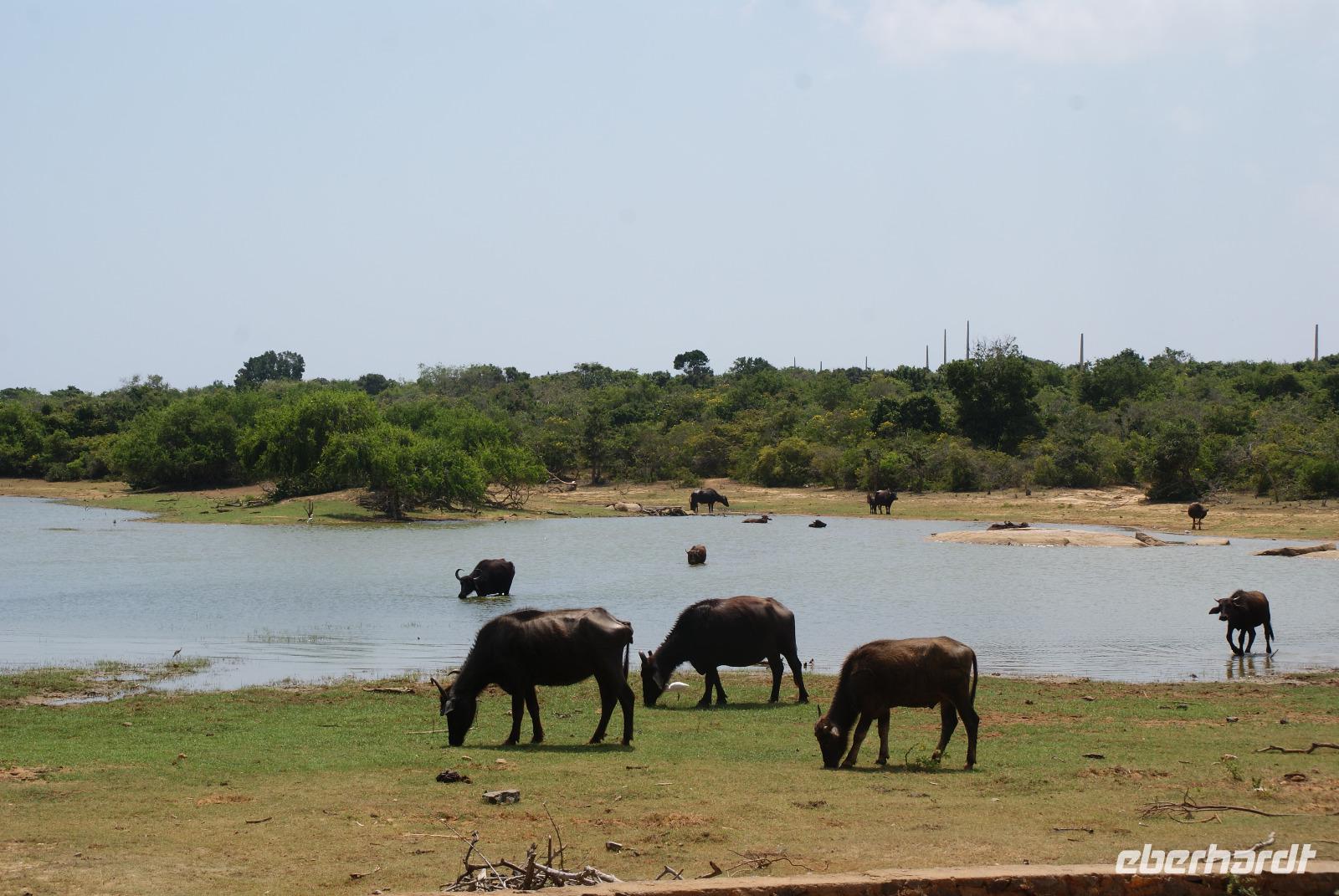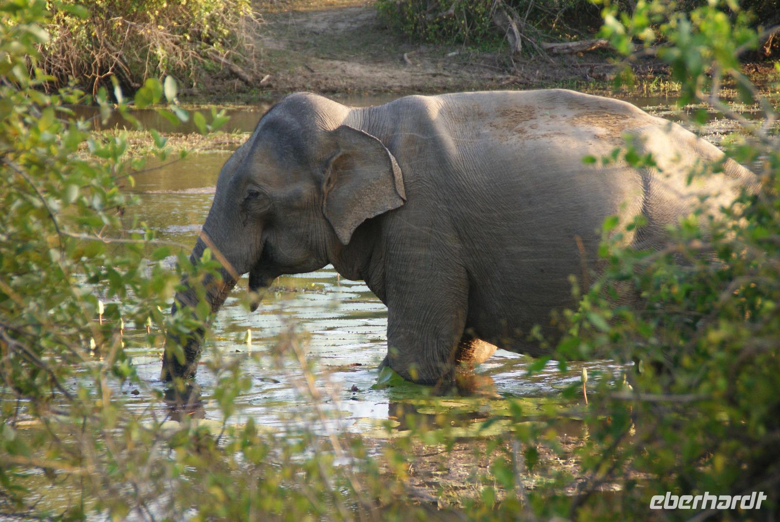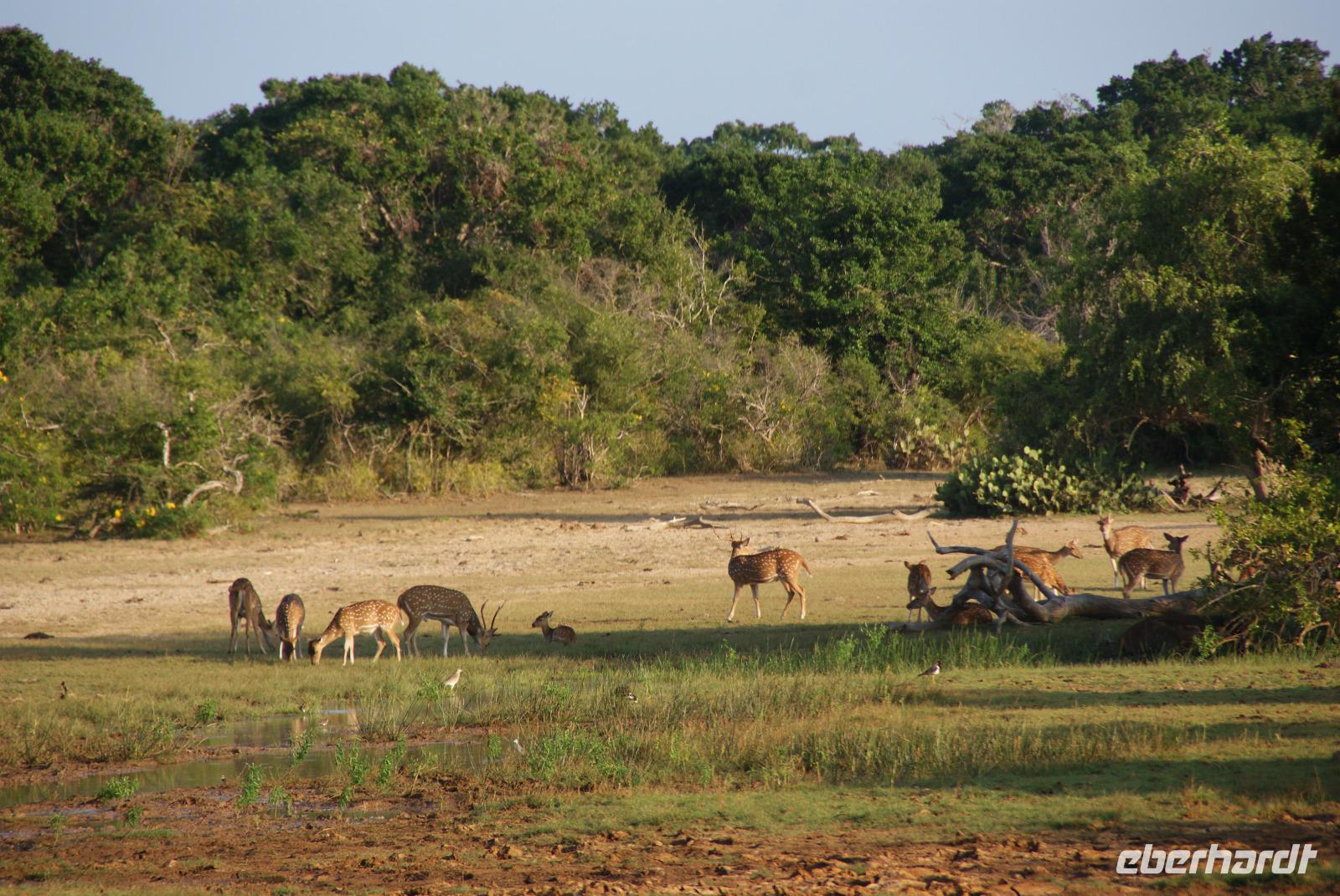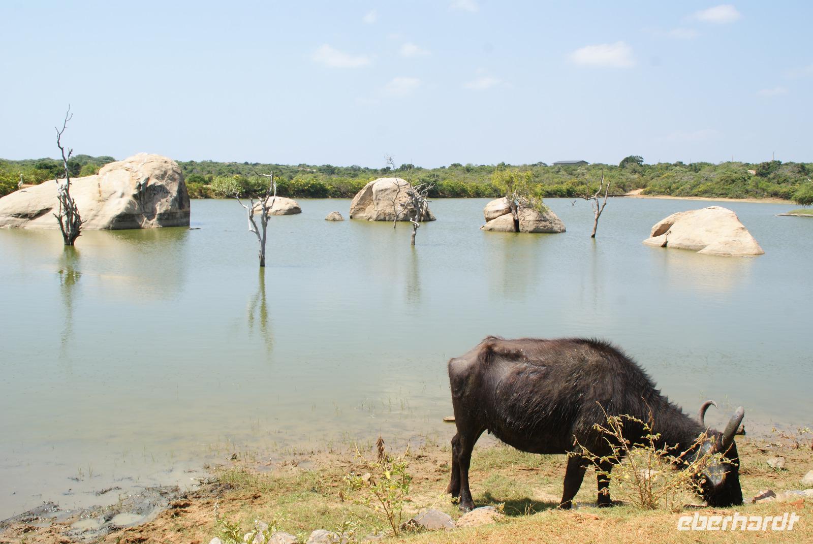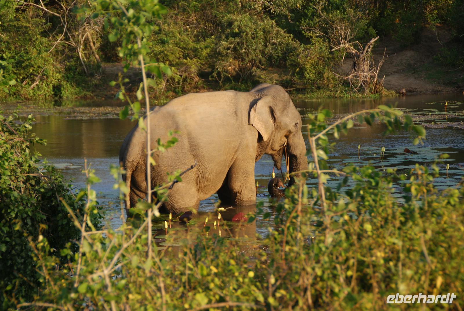 Heute Morgen stehen wir bereits vor den Hühnern auf und begeben uns um 05.45 Uhr auf unsere Morgen-Safari. Leider haben diese Idee auch zig andere Jeeps am Eingang des Parks und so müssen wir uns erst mal geduldig anstellen um die Registrierung abzuschließen. Am Vormittag bekommen wir bereits einige Tiere zu sehen, zu den Buntstörche, Ibise, Büffel, Bienenfresser, Pelikane, Stelzenläufer, Löffelreiher, Mungos, Krokodile und Wildschweine zählen. Der Yala Park ist sehr weitläufig, misst 98.000 Hektar und ist in fünf Abschnitte eingeteilt. Von diesen sind nur Abschnitt eins und zwei für Safaris freigegeben, der Rest ist Naturschutzgebiet für die Tiere und den Forschern vorbehalten. Zum Frühstück kehren wir zurück in unser sehr gut gelegenes Hotel und da der Park neuerdings mittags schließt, legen wir ebenfalls eine Safari Pause ein. So nehmen manche ein kühles Bad im wunderschönen Pool oder lassen einfach die Seele baumeln. Am frühen Nachmittag ziehen wir erneut los und werden für unsere Geduld belohnt. Wir sehen insgesamt 5 Elefanten, sogar Mutter mit Jungtier, welche wutschnaubend den Jeep vor uns „vertrötet", der ihr wohl vorab den Weg versperrt hat. Wir genießen die Wege abseits der großen Straßen, auf denen wir alleine unterwegs und ohne weitere Jeeps sind...herrliche Natur, Farben und Eindrücke lassen wir auf uns wirken. Den letzten Elefant sehen wir unmittelbar vor unserem Hotel, wie er gemütlich im See steht und Lotusblumen verspeist. Idyllischer geht es nicht mehr. Eine leckere Jubiläumstorte und frischer Kaffee runden den Nachmittag ab. Hier nutzen wir die Gelegenheit, um uns schon mal bei unserem örtlichen Reiseleiter Wilson und Busfahrer Chandara zu bedanken und ein gesammeltes Trinkgeld zu überreichen. Unsere Reise ist zwar noch nicht vorbei, aber unsere Wege trennen sich. Ein Teil der Gruppe fliegt auf die Malediven, der andere Teil zieht weiter die Küste entlang bis zu dem gebuchten Strandhotel. Abends erfolgt ein letztes Abendessen in kompletter Runde und wir erfreuen uns über ein gemütliches Beisammensein in diesem wunderschönen Hotel direkt am Yala Park.