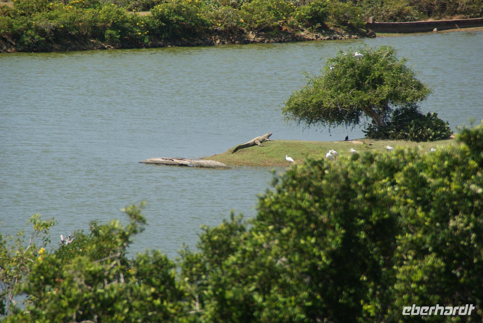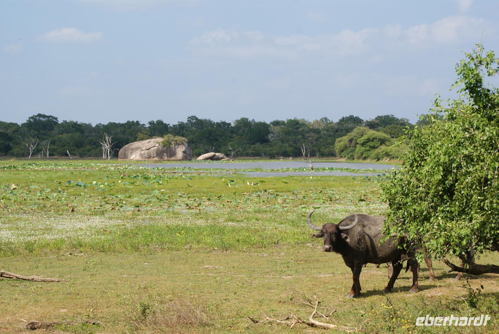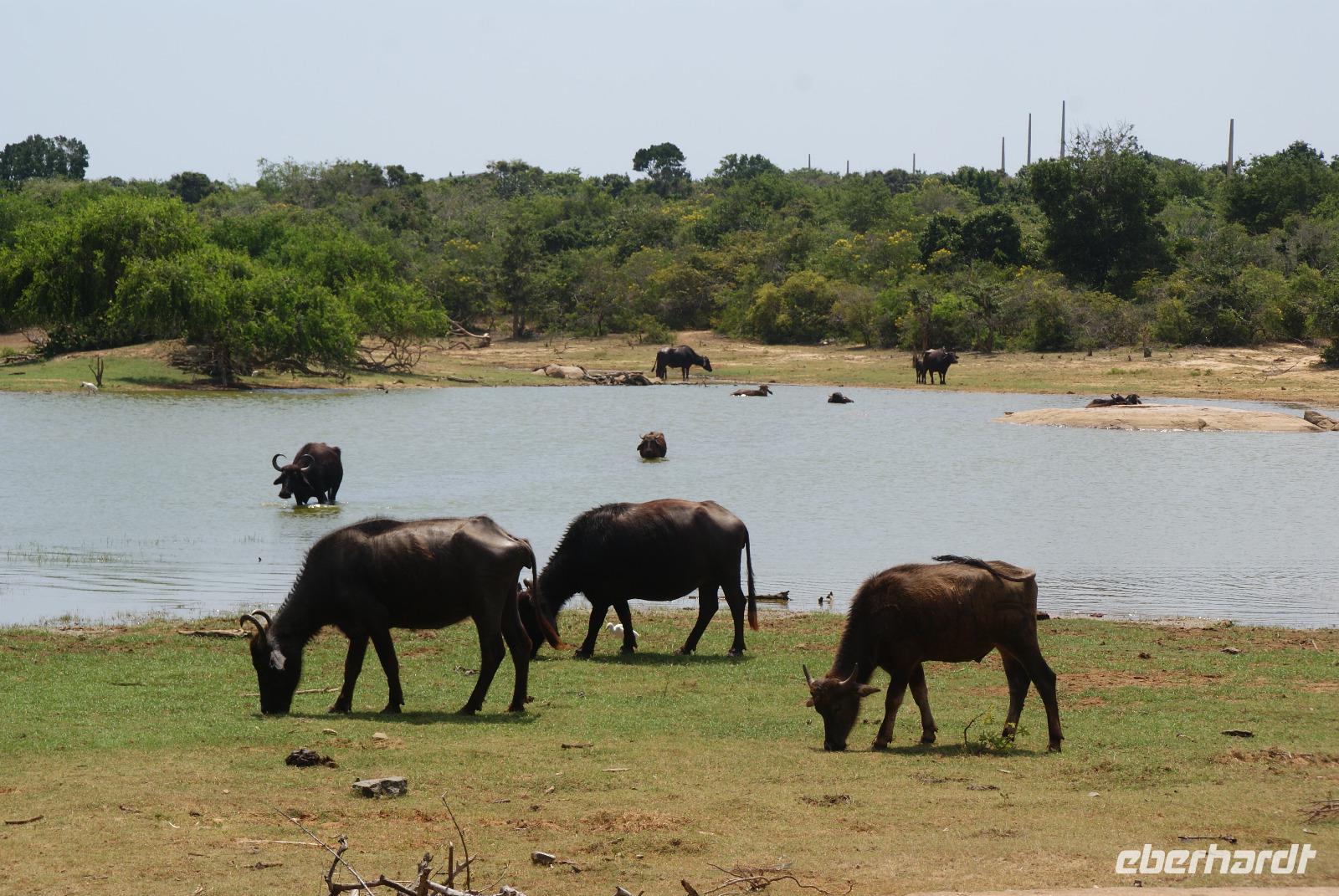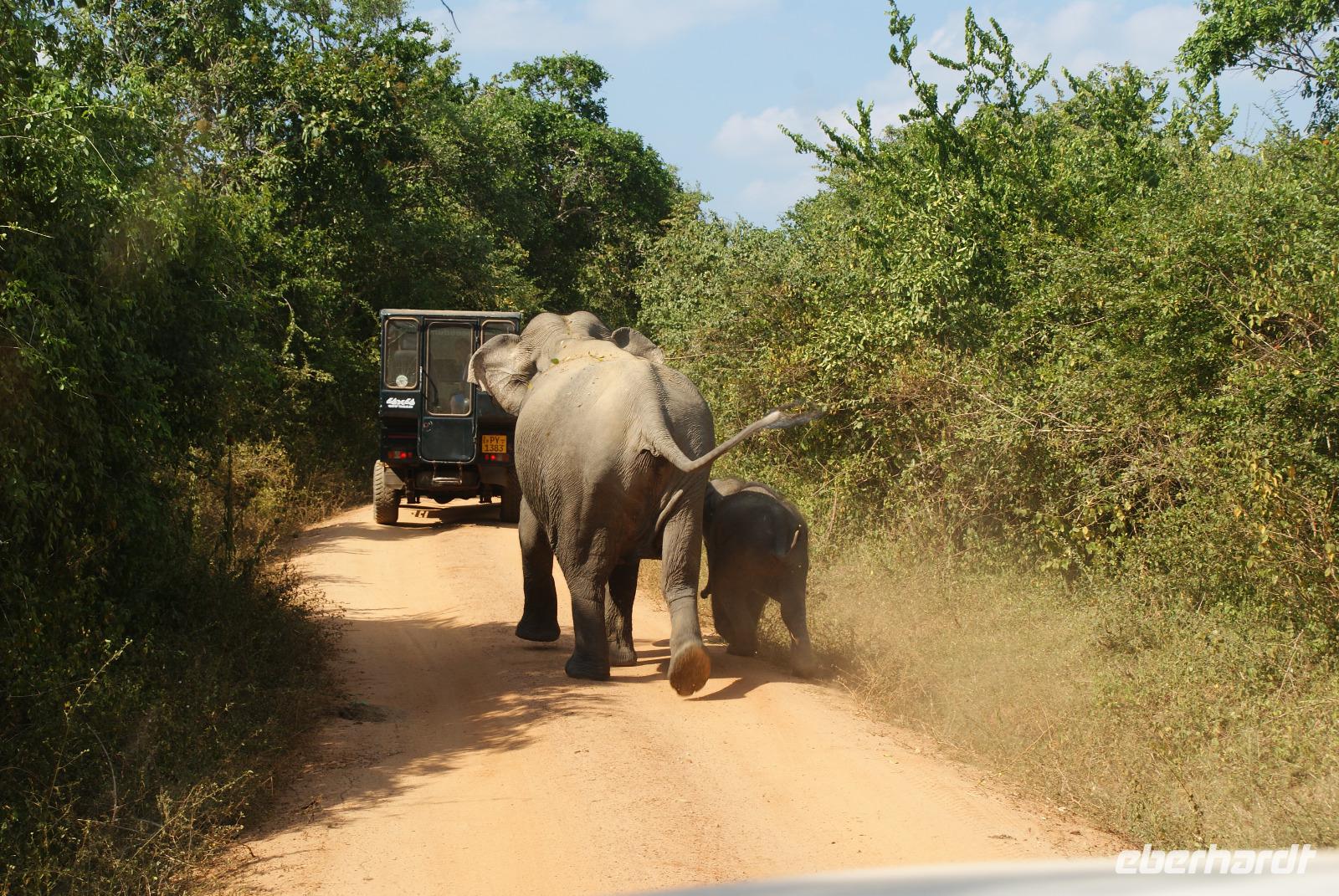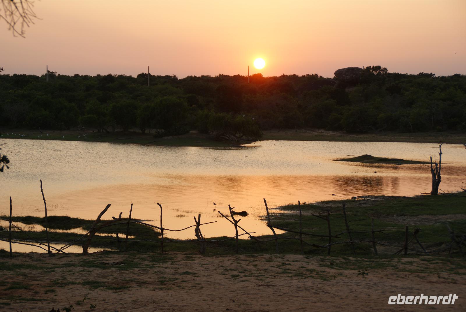 Heute Morgen stehen wir bereits vor den Hühnern auf und begeben uns um 05.45 Uhr auf unsere Morgen-Safari. Leider haben diese Idee auch zig andere Jeeps am Eingang des Parks und so müssen wir uns erst mal geduldig anstellen um die Registrierung abzuschließen. Am Vormittag bekommen wir bereits einige Tiere zu sehen, zu den Buntstörche, Ibise, Büffel, Bienenfresser, Pelikane, Stelzenläufer, Löffelreiher, Mungos, Krokodile und Wildschweine zählen. Der Yala Park ist sehr weitläufig, misst 98.000 Hektar und ist in fünf Abschnitte eingeteilt. Von diesen sind nur Abschnitt eins und zwei für Safaris freigegeben, der Rest ist Naturschutzgebiet für die Tiere und den Forschern vorbehalten. Zum Frühstück kehren wir zurück in unser sehr gut gelegenes Hotel und da der Park neuerdings mittags schließt, legen wir ebenfalls eine Safari Pause ein. So nehmen manche ein kühles Bad im wunderschönen Pool oder lassen einfach die Seele baumeln. Am frühen Nachmittag ziehen wir erneut los und werden für unsere Geduld belohnt. Wir sehen insgesamt 5 Elefanten, sogar Mutter mit Jungtier, welche wutschnaubend den Jeep vor uns „vertrötet", der ihr wohl vorab den Weg versperrt hat. Wir genießen die Wege abseits der großen Straßen, auf denen wir alleine unterwegs und ohne weitere Jeeps sind...herrliche Natur, Farben und Eindrücke lassen wir auf uns wirken. Den letzten Elefant sehen wir unmittelbar vor unserem Hotel, wie er gemütlich im See steht und Lotusblumen verspeist. Idyllischer geht es nicht mehr. Eine leckere Jubiläumstorte und frischer Kaffee runden den Nachmittag ab. Hier nutzen wir die Gelegenheit, um uns schon mal bei unserem örtlichen Reiseleiter Wilson und Busfahrer Chandara zu bedanken und ein gesammeltes Trinkgeld zu überreichen. Unsere Reise ist zwar noch nicht vorbei, aber unsere Wege trennen sich. Ein Teil der Gruppe fliegt auf die Malediven, der andere Teil zieht weiter die Küste entlang bis zu dem gebuchten Strandhotel. Abends erfolgt ein letztes Abendessen in kompletter Runde und wir erfreuen uns über ein gemütliches Beisammensein in diesem wunderschönen Hotel direkt am Yala Park.