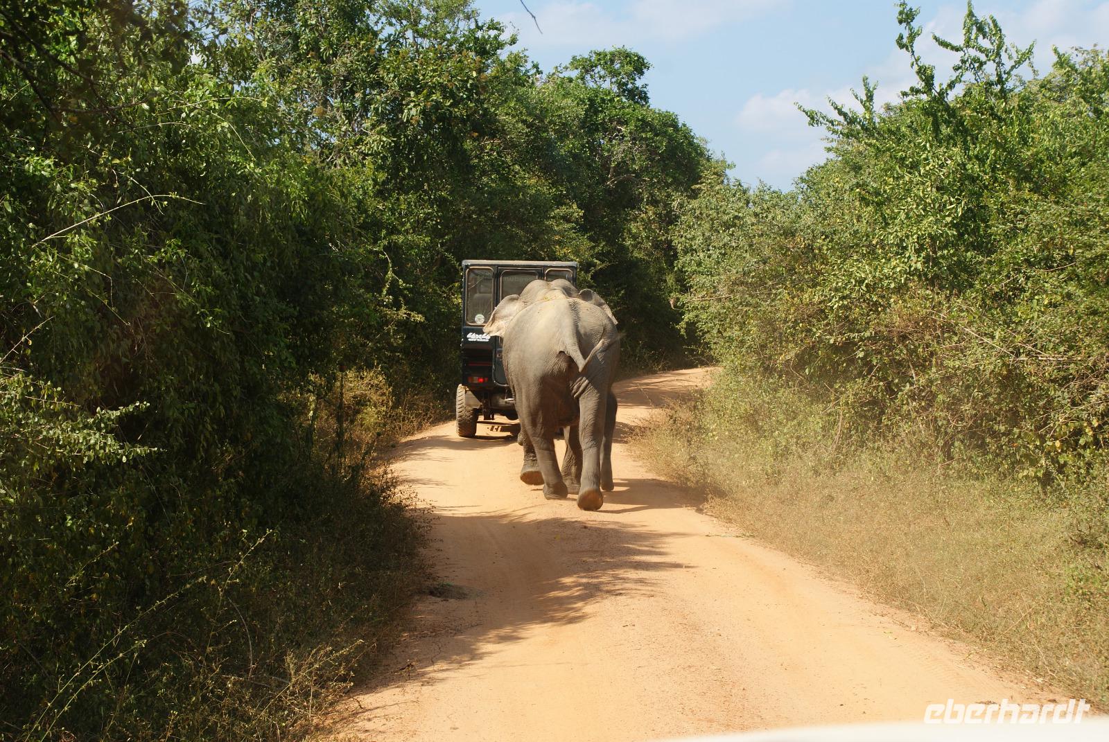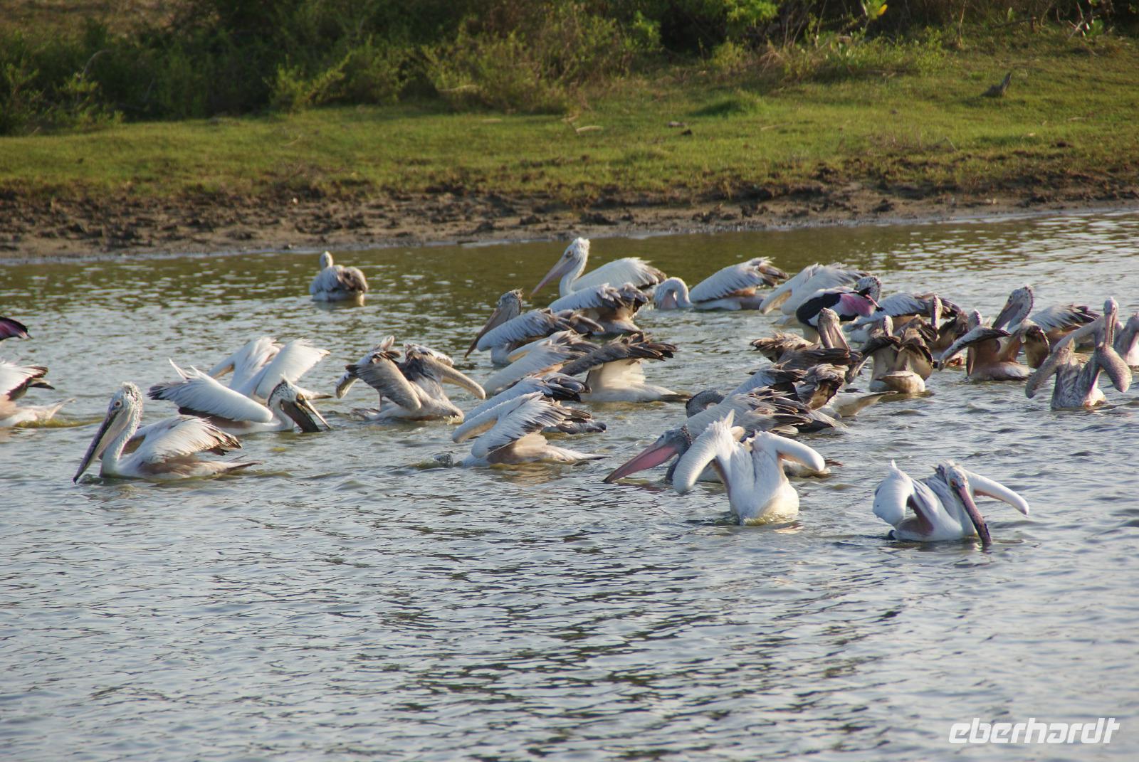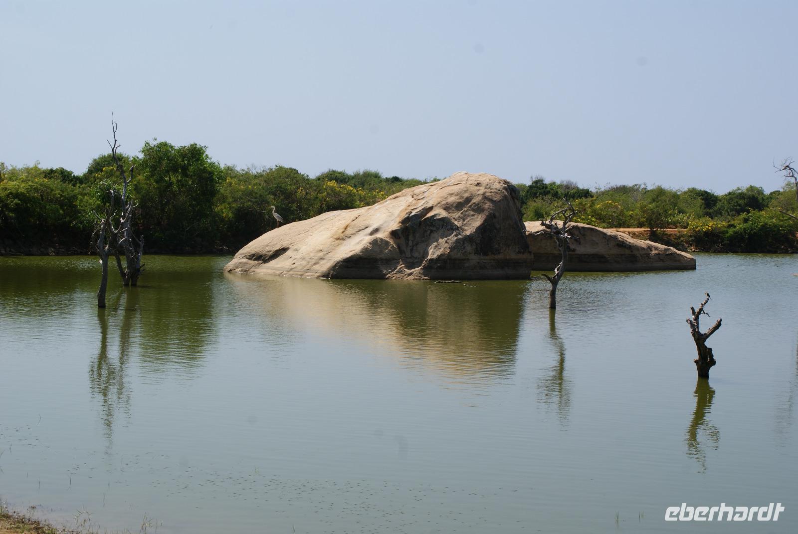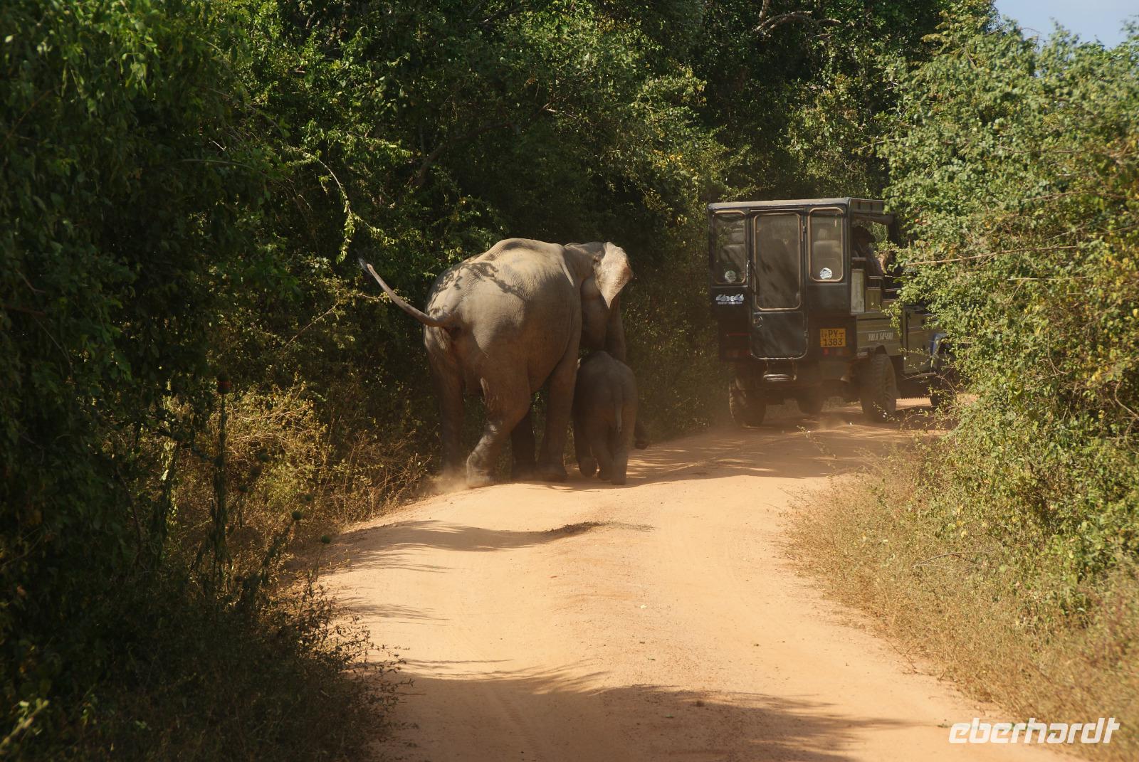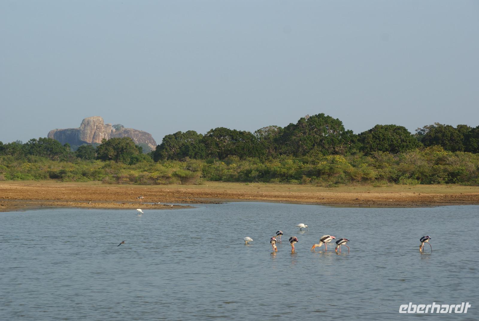 Heute Morgen stehen wir bereits vor den Hühnern auf und begeben uns um 05.45 Uhr auf unsere Morgen-Safari. Leider haben diese Idee auch zig andere Jeeps am Eingang des Parks und so müssen wir uns erst mal geduldig anstellen um die Registrierung abzuschließen. Am Vormittag bekommen wir bereits einige Tiere zu sehen, zu den Buntstörche, Ibise, Büffel, Bienenfresser, Pelikane, Stelzenläufer, Löffelreiher, Mungos, Krokodile und Wildschweine zählen. Der Yala Park ist sehr weitläufig, misst 98.000 Hektar und ist in fünf Abschnitte eingeteilt. Von diesen sind nur Abschnitt eins und zwei für Safaris freigegeben, der Rest ist Naturschutzgebiet für die Tiere und den Forschern vorbehalten. Zum Frühstück kehren wir zurück in unser sehr gut gelegenes Hotel und da der Park neuerdings mittags schließt, legen wir ebenfalls eine Safari Pause ein. So nehmen manche ein kühles Bad im wunderschönen Pool oder lassen einfach die Seele baumeln. Am frühen Nachmittag ziehen wir erneut los und werden für unsere Geduld belohnt. Wir sehen insgesamt 5 Elefanten, sogar Mutter mit Jungtier, welche wutschnaubend den Jeep vor uns „vertrötet", der ihr wohl vorab den Weg versperrt hat. Wir genießen die Wege abseits der großen Straßen, auf denen wir alleine unterwegs und ohne weitere Jeeps sind...herrliche Natur, Farben und Eindrücke lassen wir auf uns wirken. Den letzten Elefant sehen wir unmittelbar vor unserem Hotel, wie er gemütlich im See steht und Lotusblumen verspeist. Idyllischer geht es nicht mehr. Eine leckere Jubiläumstorte und frischer Kaffee runden den Nachmittag ab. Hier nutzen wir die Gelegenheit, um uns schon mal bei unserem örtlichen Reiseleiter Wilson und Busfahrer Chandara zu bedanken und ein gesammeltes Trinkgeld zu überreichen. Unsere Reise ist zwar noch nicht vorbei, aber unsere Wege trennen sich. Ein Teil der Gruppe fliegt auf die Malediven, der andere Teil zieht weiter die Küste entlang bis zu dem gebuchten Strandhotel. Abends erfolgt ein letztes Abendessen in kompletter Runde und wir erfreuen uns über ein gemütliches Beisammensein in diesem wunderschönen Hotel direkt am Yala Park.