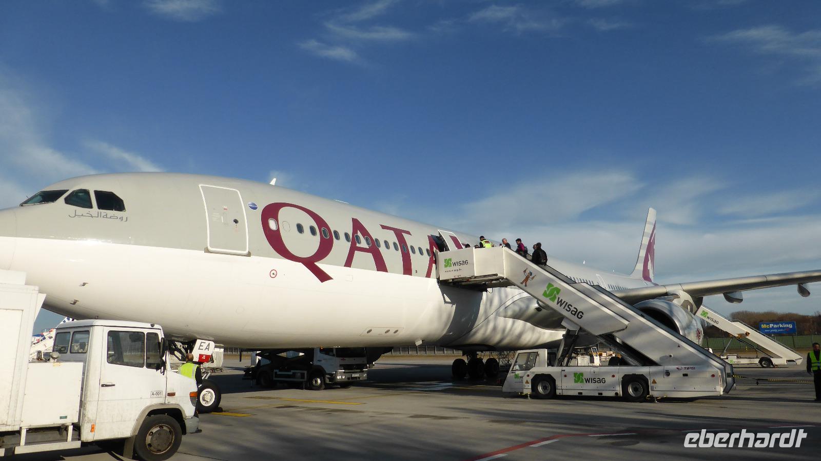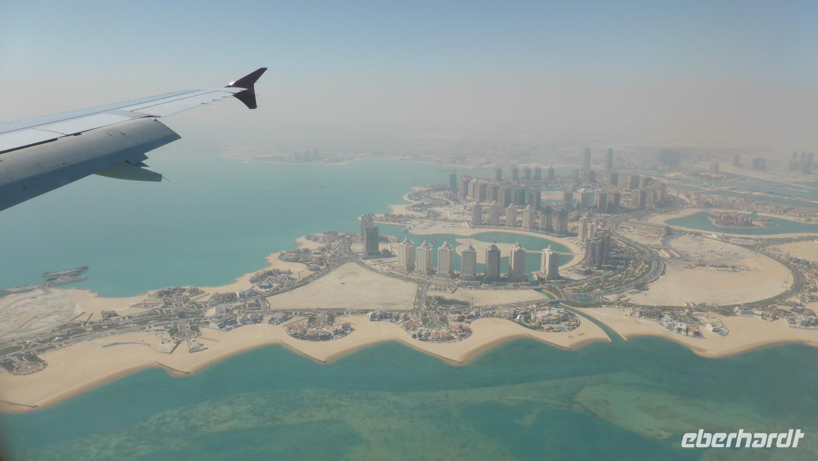 Am Sonnabend fliegen wir nachmittags mit Qatar Airways von Berlin (einige von Frankfurt) nach Doha. Im Flieger haben wir guten Service und eine gute Verpflegung. Das Umsteigen im 2014 fertig gestellten Hamad International Airport funktioniert prima und so bleibt noch etwas Zeit, um im Duty Free schon mal nach Schokodatteln Ausschau zu halten.