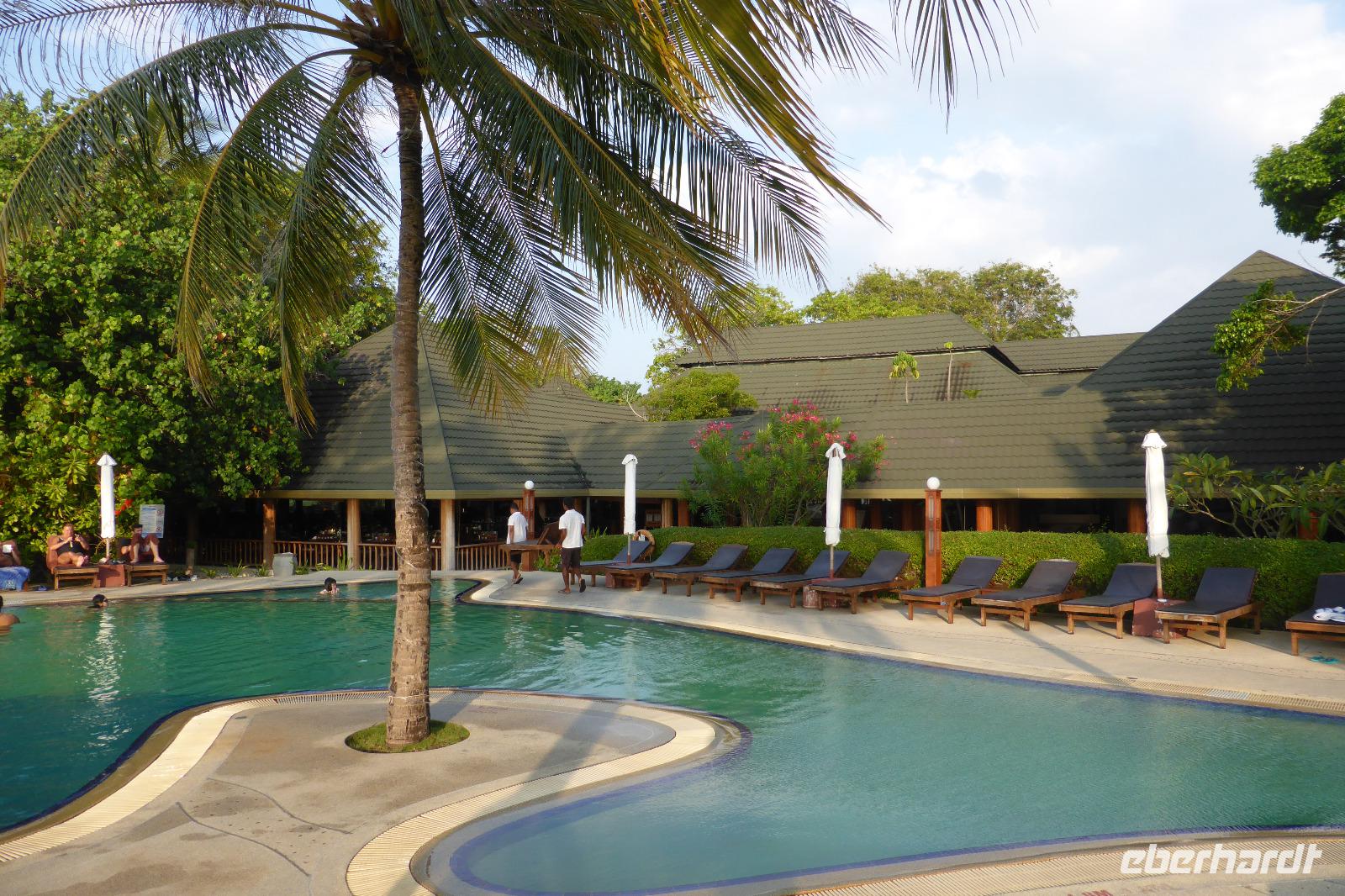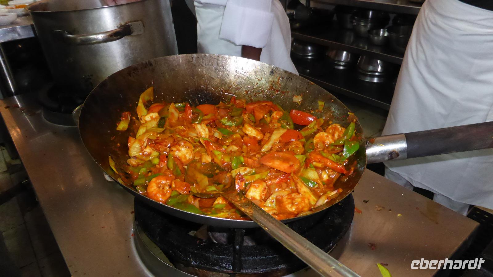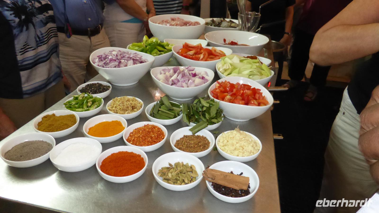 Mittags ist Schaukochen in der Strandhütte unseres Hotels angesagt. Schrimps und Hühnchenfleisch sollen zubereitet werden. Vielen Dank an Gudrun und Moni für die fachmännische Unterstützung! Der Koch geizt nicht mit Gewürzen und Zutaten. Scheinbar von allem was die Gewürzinsel Sri Lanka zu bieten hat, kommt rein: Currypulver, Zimt, Kardamom, Knoblauch, viel Chili, Dillsamen, Nelken, Curryblätter. Unsere anschließende Kostprobe zeigt, es ist wirklich gut gewürzt und scharf, aber noch verträglich scharf. Nachdem wir hier gekostet haben geht´s an das leckere Buffet am Pool im Haupthaus. Nachmittag genießen wir noch mal die Annehmlichkeiten des Hotels, wir wollen es ja zum Anfang der Reise ruhig angehen lassen. Am Abend wird wieder reichlich am Buffet aufgetischt.