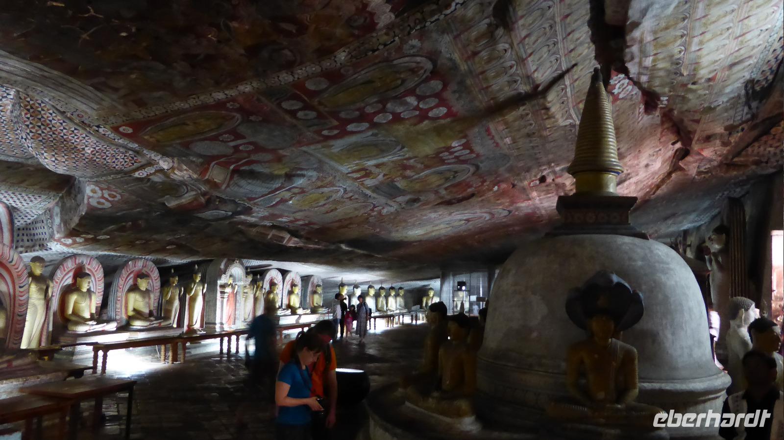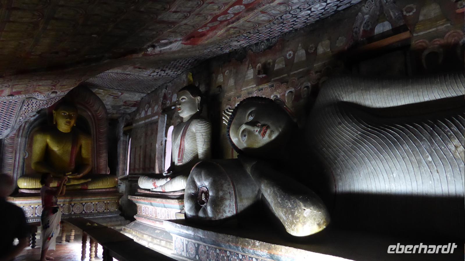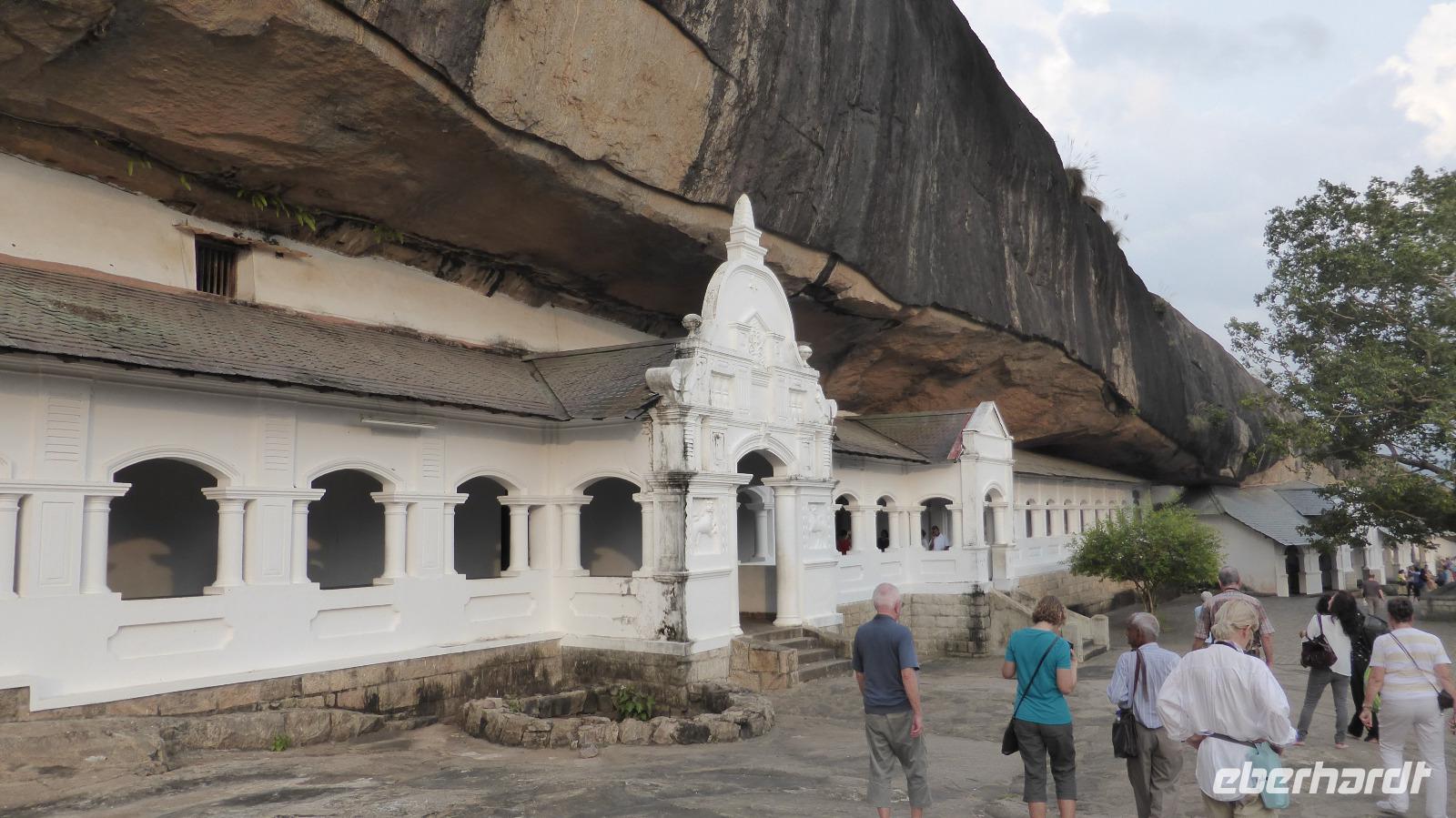 Nach der Mittagspause am See in Kurunegala brauchen wir wieder Geduld, um voranzukommen. Zahlreiche Baustellen halten uns auf. Schließlich erreichen wir am Nachmittag Dambulla. Der Ort ist bekannt für seine Felsenhöhlen. Der Weg hinauf führt über etwa 350 Stufen, begleitet von Affen (Makaken), die wir besser im Blick behalten und nicht zu nah an uns herankommen lassen. Besonders interessant ist die Ausgestaltung der Höhlen mit Deckenmalereien und vielen Buddhafiguren. Einst boten die Höhlen dem König von Anuradhapura über Jahre Exil. Die hiesigen Mönche schützten ihn. Als der König auf seinen Thron zurückkehren konnte, lies er als Dank einen großen Tempel in Dambulla bauen. Es ist bis heute ein heiliger buddhistischer Ort, weshalb wir die Anlage nur barfuß bzw. mit unseren „Tempelsocken" betreten dürfen.