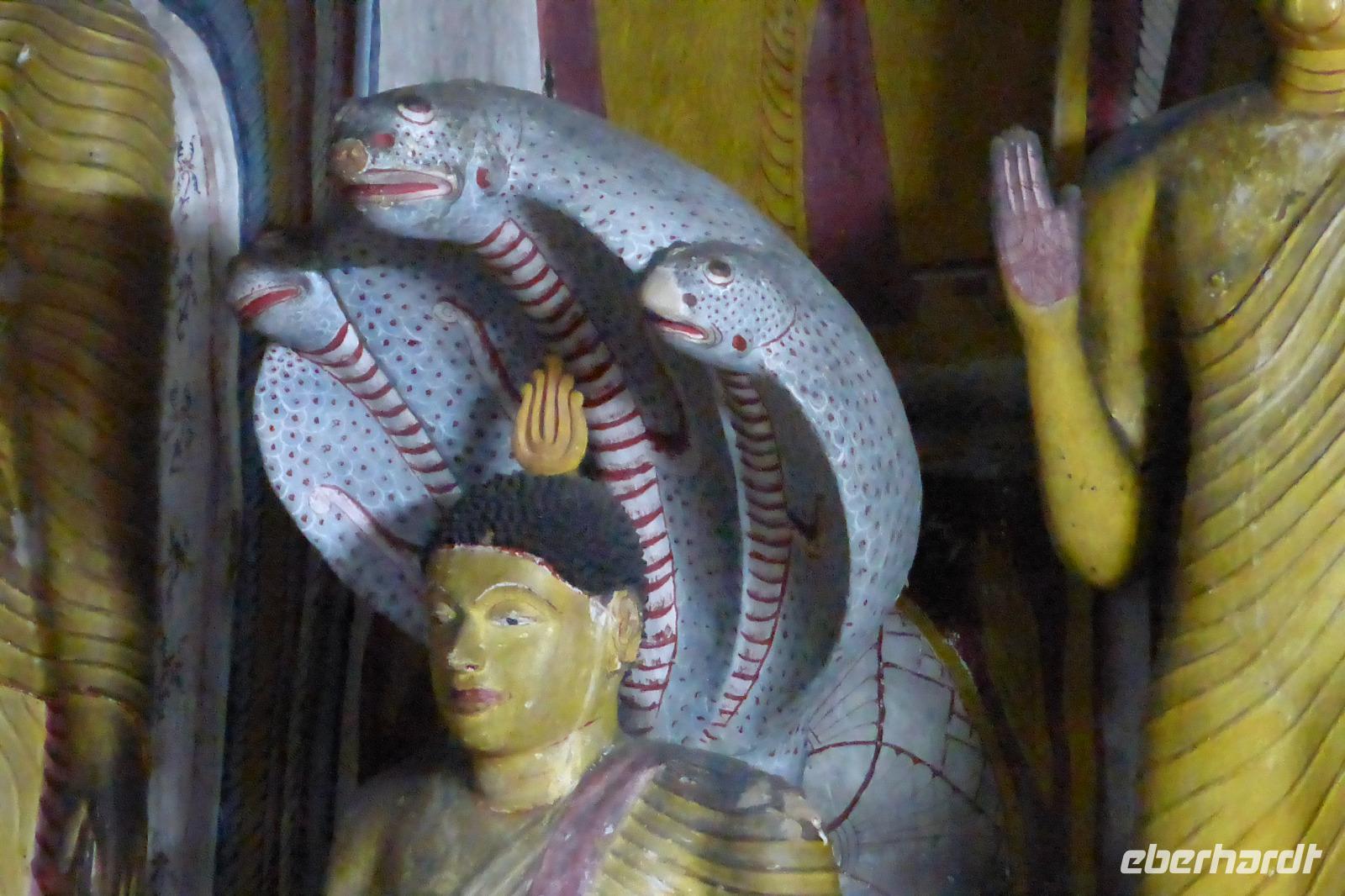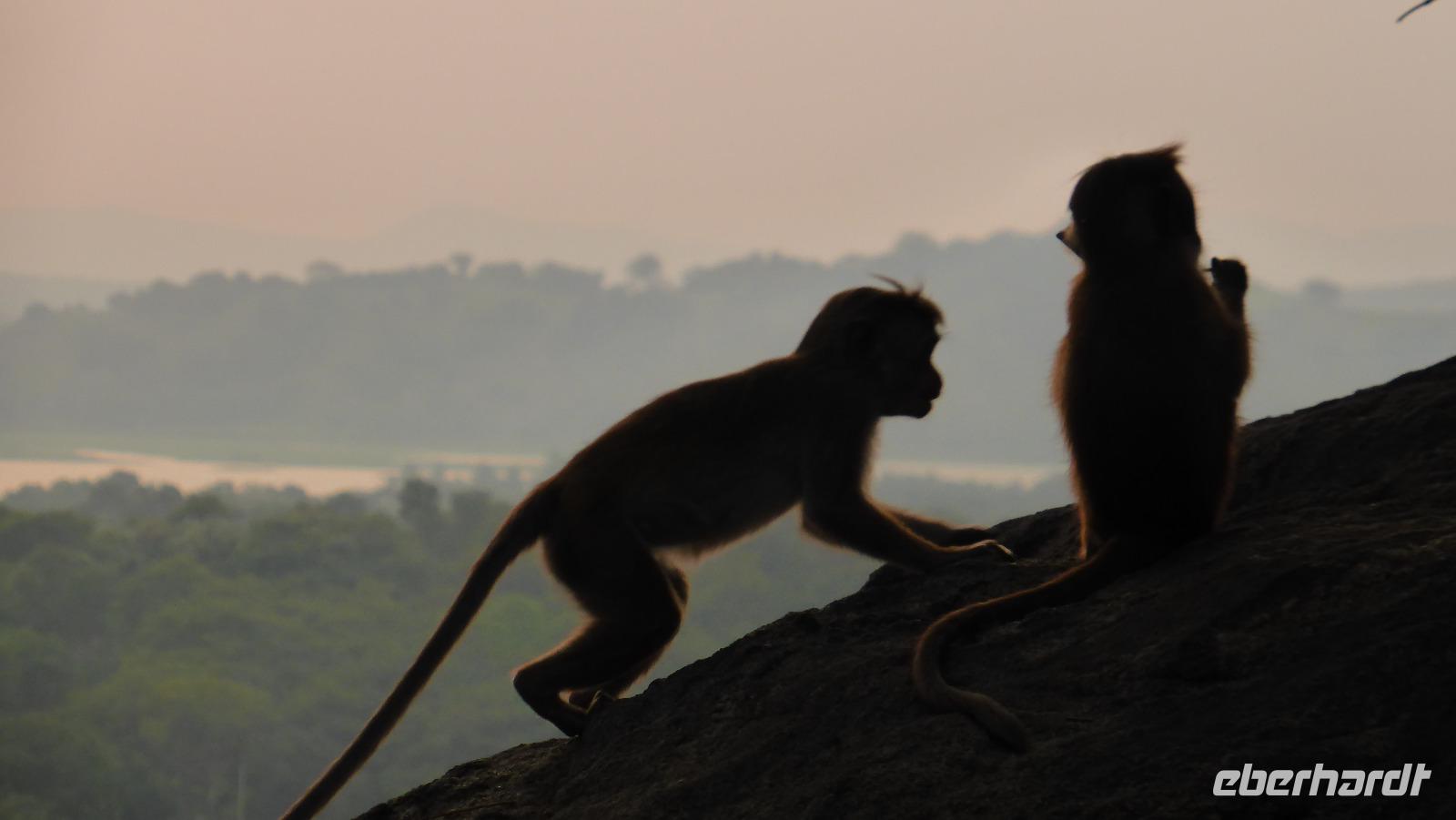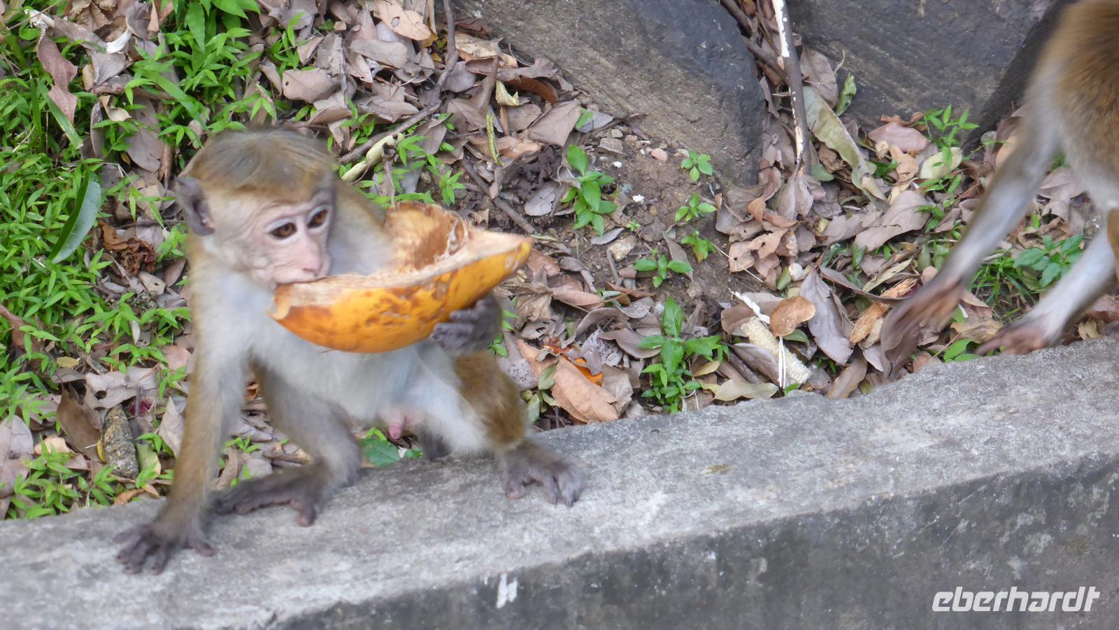 Nach der Mittagspause am See in Kurunegala brauchen wir wieder Geduld, um voranzukommen. Zahlreiche Baustellen halten uns auf. Schließlich erreichen wir am Nachmittag Dambulla. Der Ort ist bekannt für seine Felsenhöhlen. Der Weg hinauf führt über etwa 350 Stufen, begleitet von Affen (Makaken), die wir besser im Blick behalten und nicht zu nah an uns herankommen lassen. Besonders interessant ist die Ausgestaltung der Höhlen mit Deckenmalereien und vielen Buddhafiguren. Einst boten die Höhlen dem König von Anuradhapura über Jahre Exil. Die hiesigen Mönche schützten ihn. Als der König auf seinen Thron zurückkehren konnte, lies er als Dank einen großen Tempel in Dambulla bauen. Es ist bis heute ein heiliger buddhistischer Ort, weshalb wir die Anlage nur barfuß bzw. mit unseren „Tempelsocken" betreten dürfen.