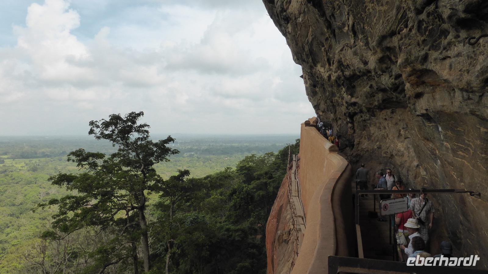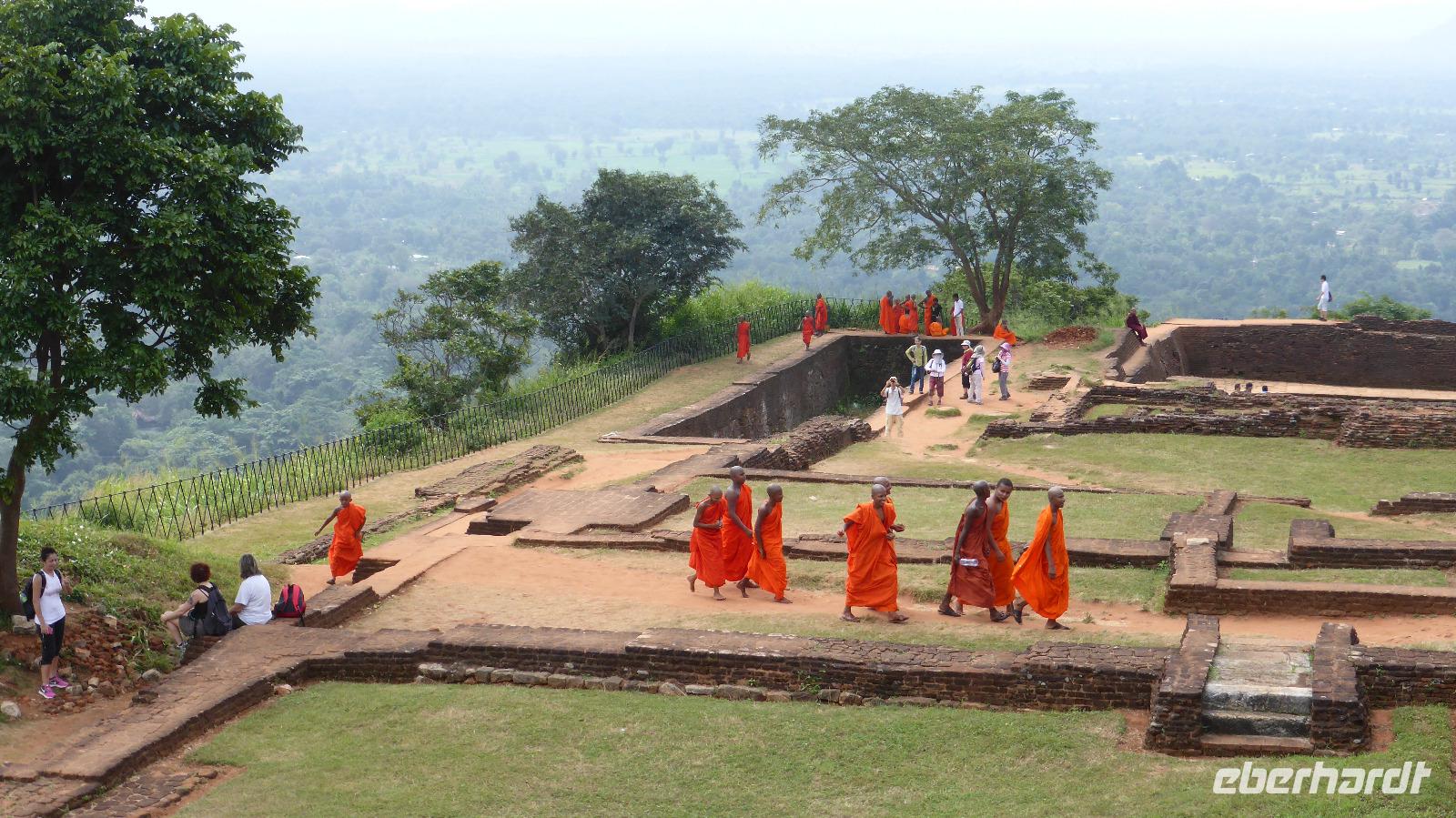 Es folgt der schweißtreibende Besuch des Löwenfelsens, Sigiriya genannt. Der rötliche Monolith vulkanischen Ursprungs ragt etwa 185 Meter aus der Ebene. Auf dem Löwenfelsen entstand im 5. Jahrhundert eine Festung. Sie steht für den Kampf zweier Brüder um die Thronfolge. Der „harte Kern" der Gruppe steigt bis zum Festungsplateau auf. Unterwegs bekommen wir die berühmten Wolkenmädchen zu sehen, farbenfrohe Fresken aus dem 5. Jahrhundert. Der Felsen ist gut besucht, eine Gruppe Mönche macht einen Ausflug und vor allem mal wieder Chinesen sind hier. Es kommt immer mal zum Stau bis wir oben sind und Daya befürchtet ständig, dass einer von uns verloren geht.... Aber die Anstrengung hat sich gelohnt, der Rundblick entschädigt für den mühsamen Aufstieg.