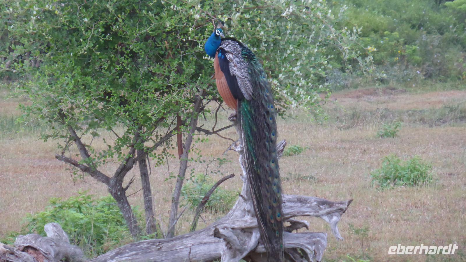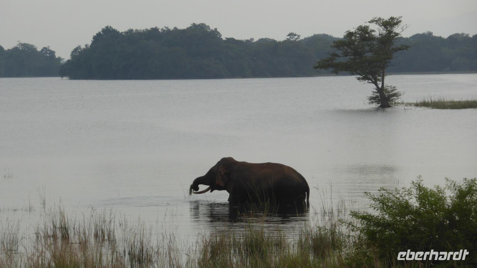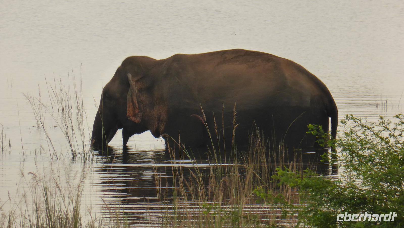 Daya hat schon immer mal erwähnt, dass es in dieser Region auch Elefanten gibt und manchmal einer zu sehen ist. Nur geglaubt haben wir nicht so recht daran. Doch auf der Rückfahrt sehen wir tatsächlich einen Wildelefanten, ca. 200 m von der Straße entfernt in einem See. Wir können ihn beim Fressen beobachten und fotografieren, er lässt sich nicht stören, toll! Später werden wir noch wilde Pfauen sehen, die unsere Straße kreuzen.