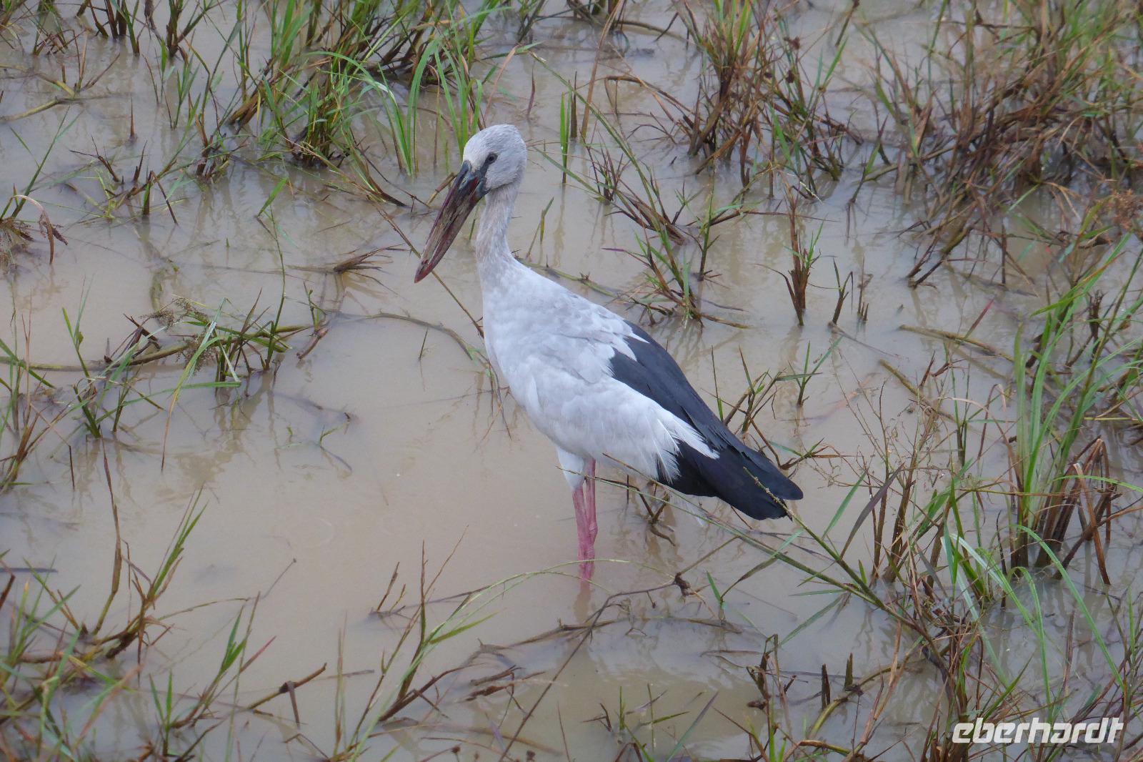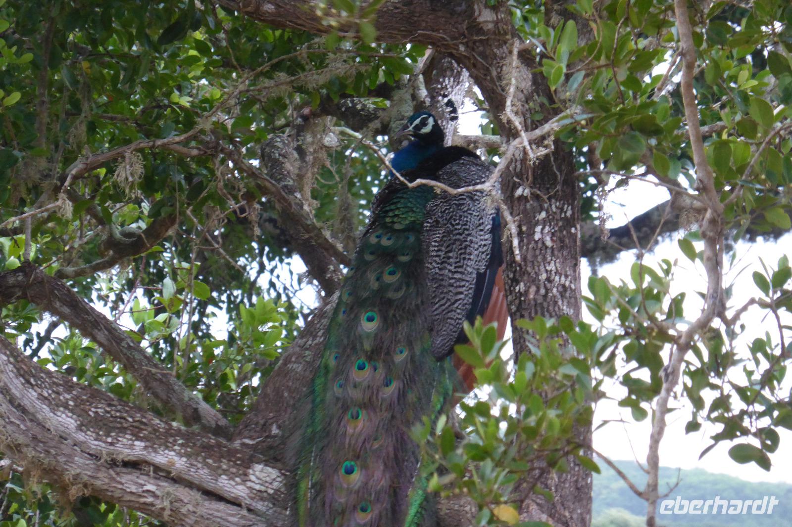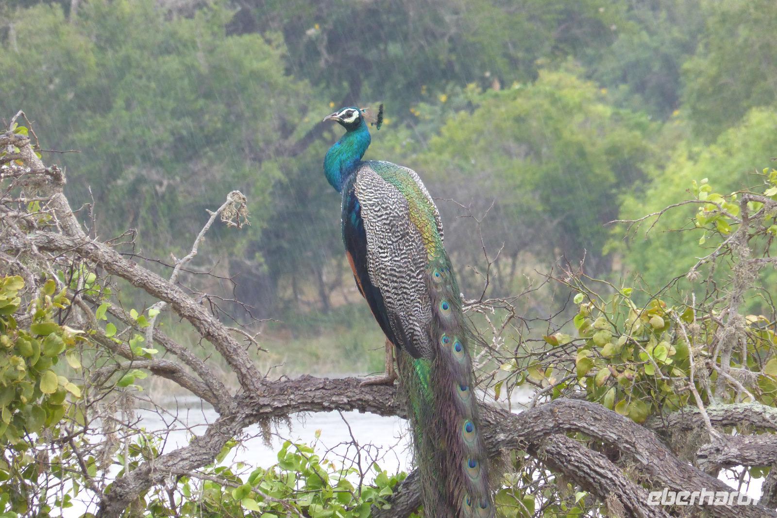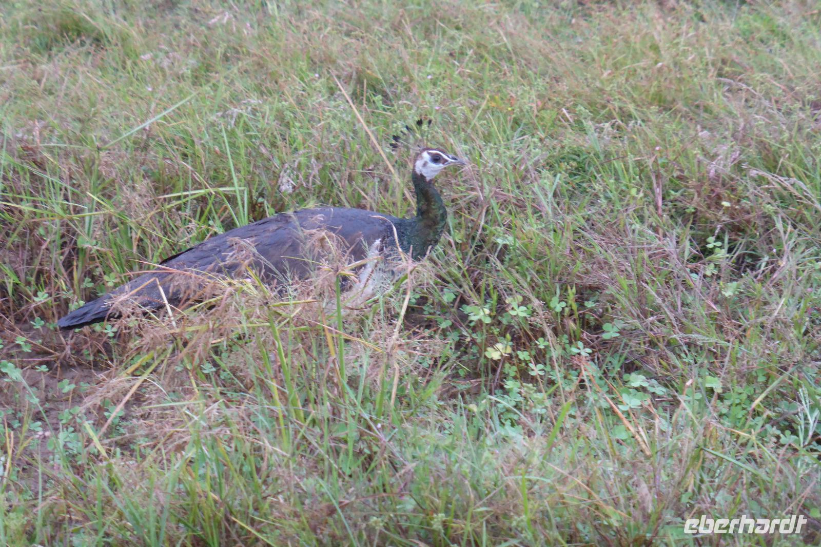 Daya hat schon immer mal erwähnt, dass es in dieser Region auch Elefanten gibt und manchmal einer zu sehen ist. Nur geglaubt haben wir nicht so recht daran. Doch auf der Rückfahrt sehen wir tatsächlich einen Wildelefanten, ca. 200 m von der Straße entfernt in einem See. Wir können ihn beim Fressen beobachten und fotografieren, er lässt sich nicht stören, toll! Später werden wir noch wilde Pfauen sehen, die unsere Straße kreuzen.