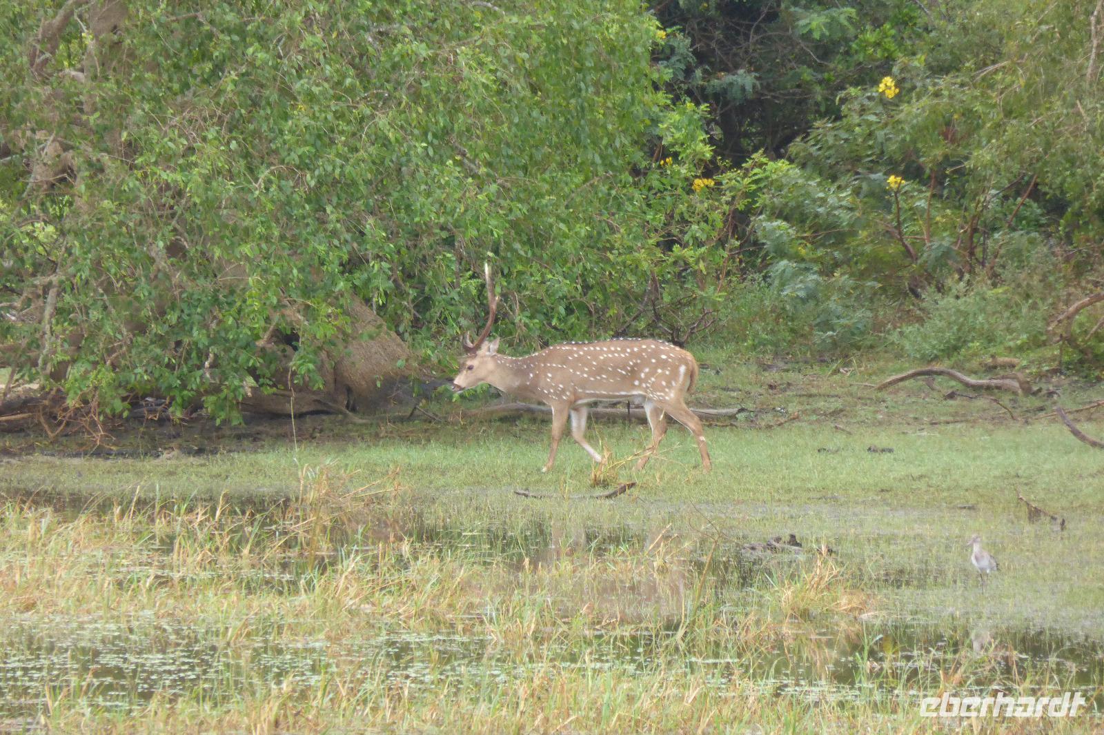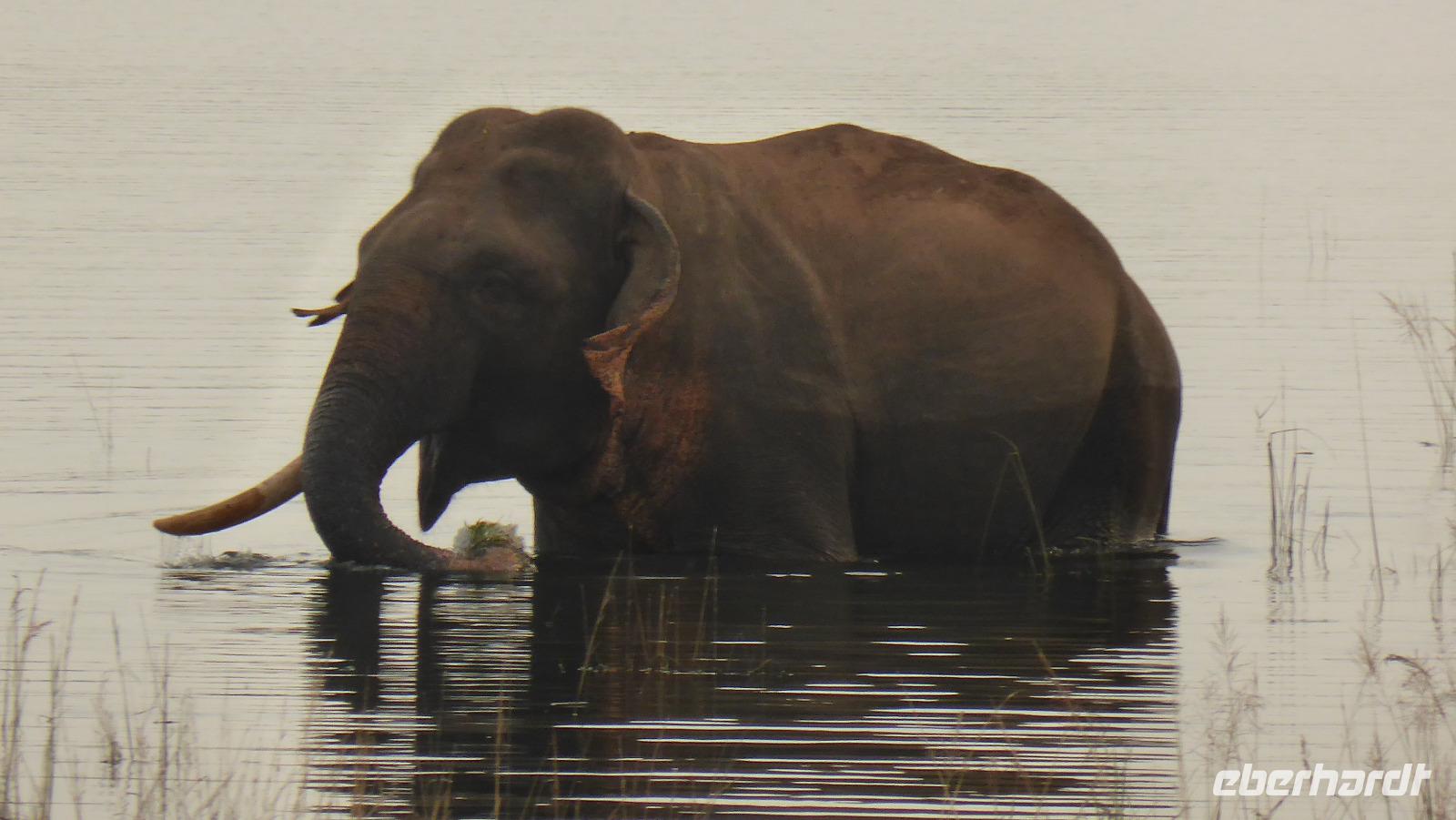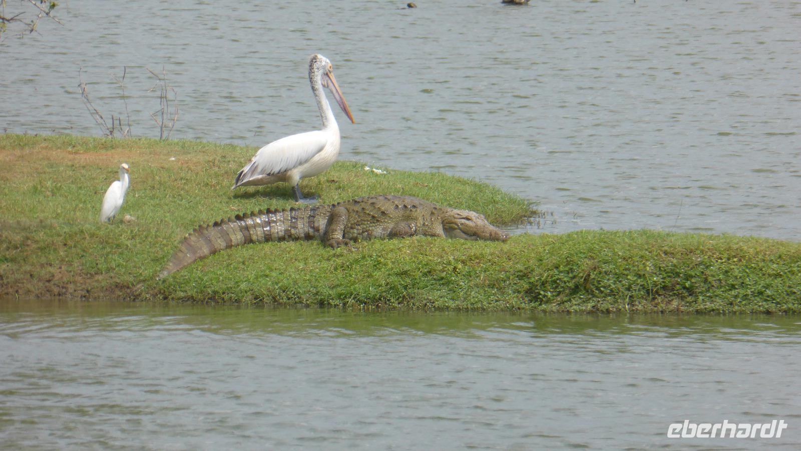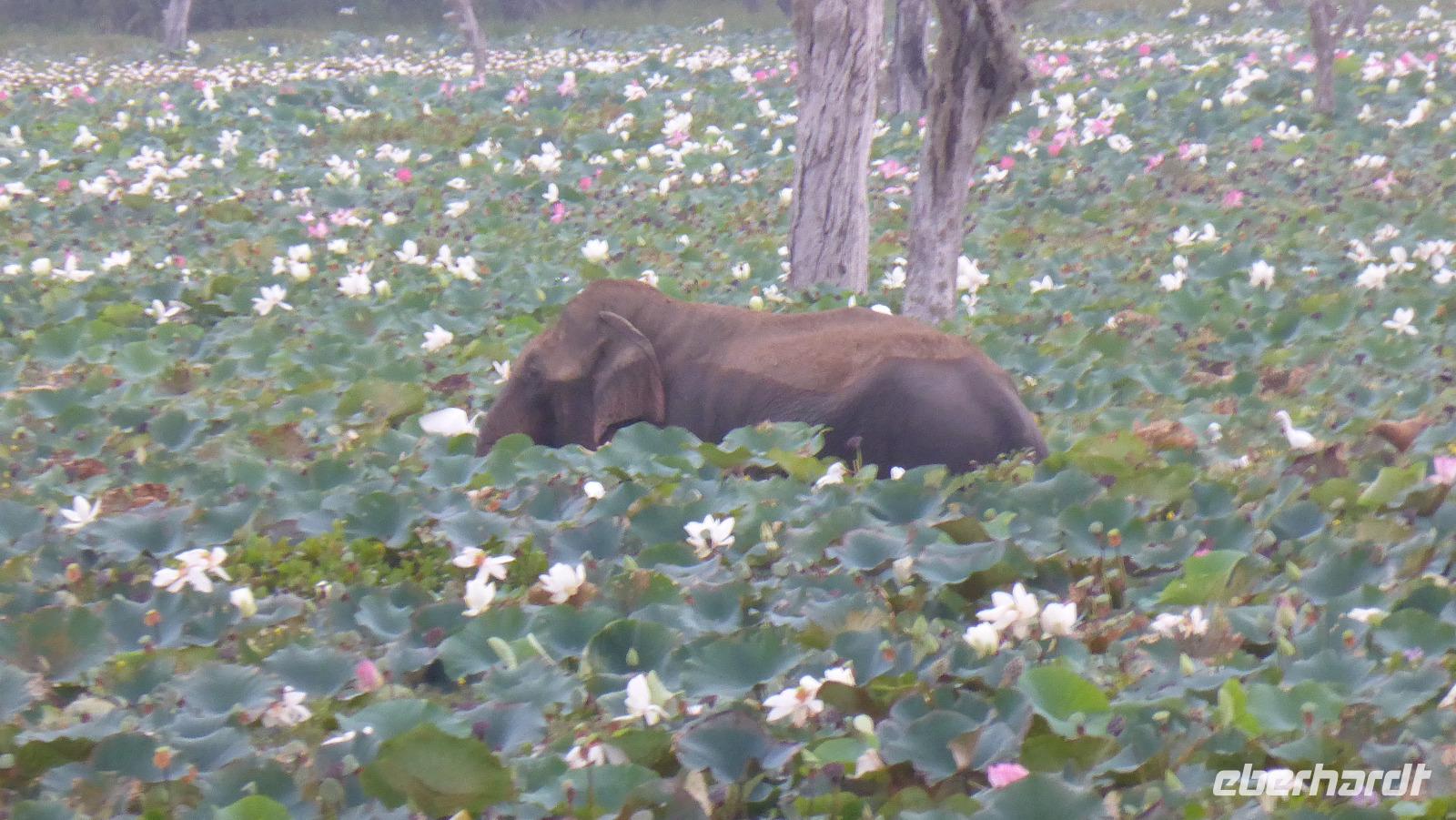 Nach etwas Wartezeit am Eingang des Nationalparks geht es los mit Tierbeobachtungen. Wir sehen viele verschieden Vögel, vom bunten Bienenfresser über Papageien bis zum Adler und verschieden Wasservögeln. Oft sind auch Pfaue zu beobachten. Es gibt auch Wildhühner, Wildschweine, Rehe, Wasserbüffel. Natürlich hoffen wir auch auf Elefant, Krokodil und Leopard. Letzterer wird uns nicht den Gefallen tun. Doch zwei Elefanten sehen wir aus größerer Entfernung im Lotusteich beim Fressen. Krokodile bekommen wir auch zu Gesicht, allerdings im Wasser, fast vollständig abgetaucht auf Beute lauernd.