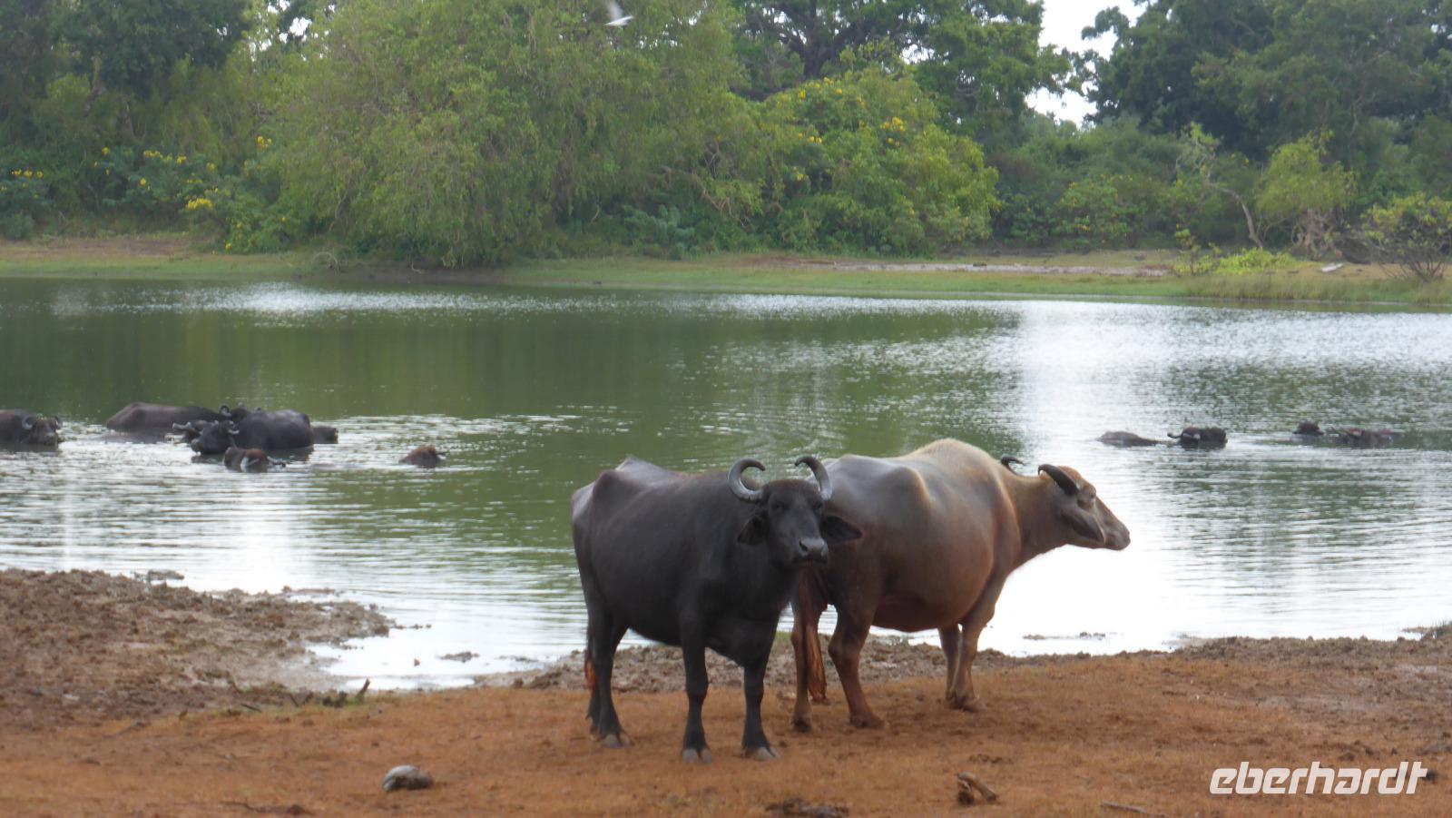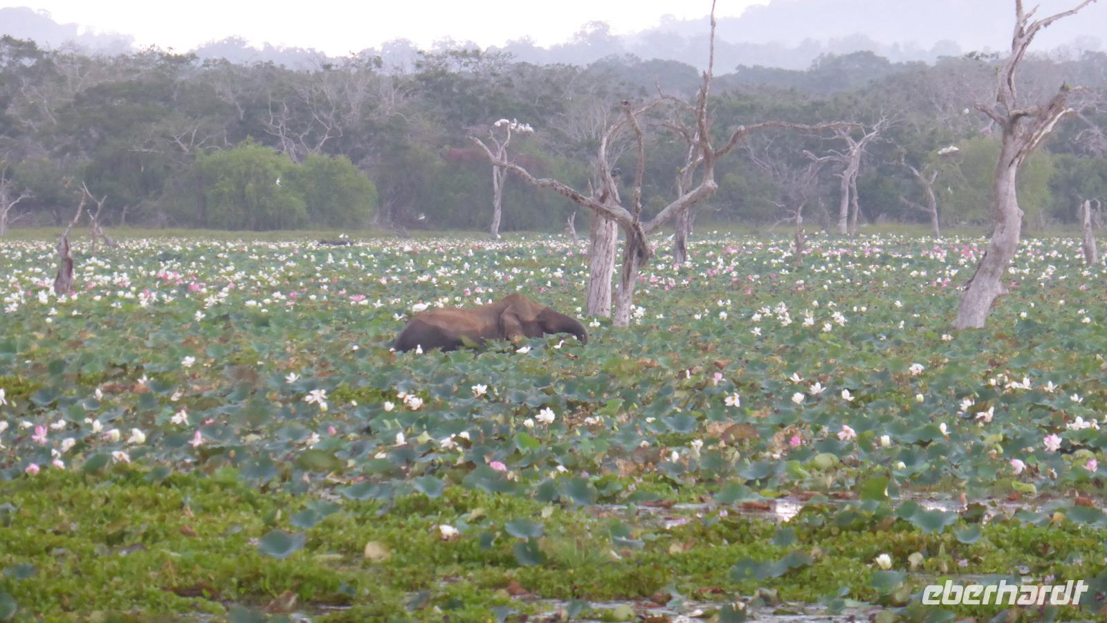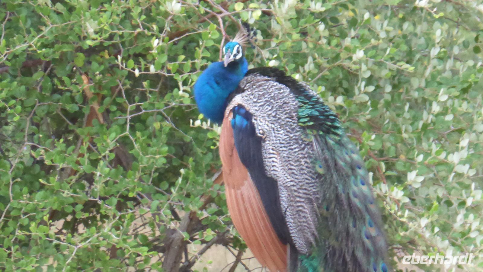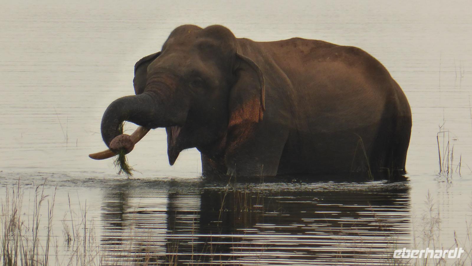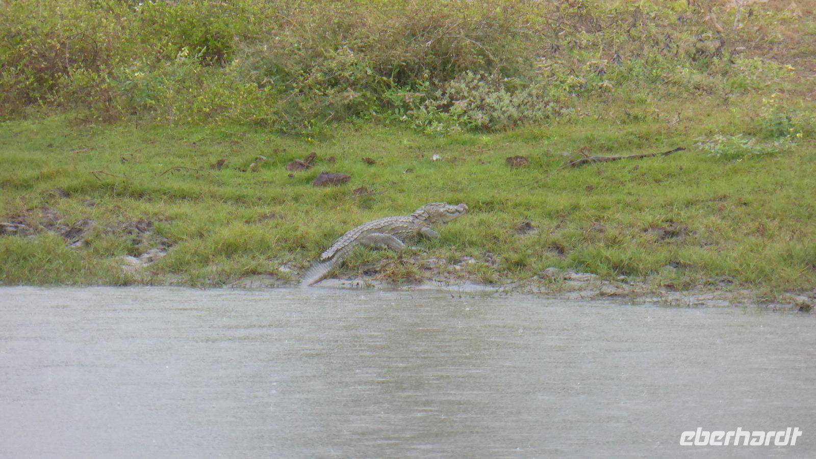 Nach etwas Wartezeit am Eingang des Nationalparks geht es los mit Tierbeobachtungen. Wir sehen viele verschieden Vögel, vom bunten Bienenfresser über Papageien bis zum Adler und verschieden Wasservögeln. Oft sind auch Pfaue zu beobachten. Es gibt auch Wildhühner, Wildschweine, Rehe, Wasserbüffel. Natürlich hoffen wir auch auf Elefant, Krokodil und Leopard. Letzterer wird uns nicht den Gefallen tun. Doch zwei Elefanten sehen wir aus größerer Entfernung im Lotusteich beim Fressen. Krokodile bekommen wir auch zu Gesicht, allerdings im Wasser, fast vollständig abgetaucht auf Beute lauernd.