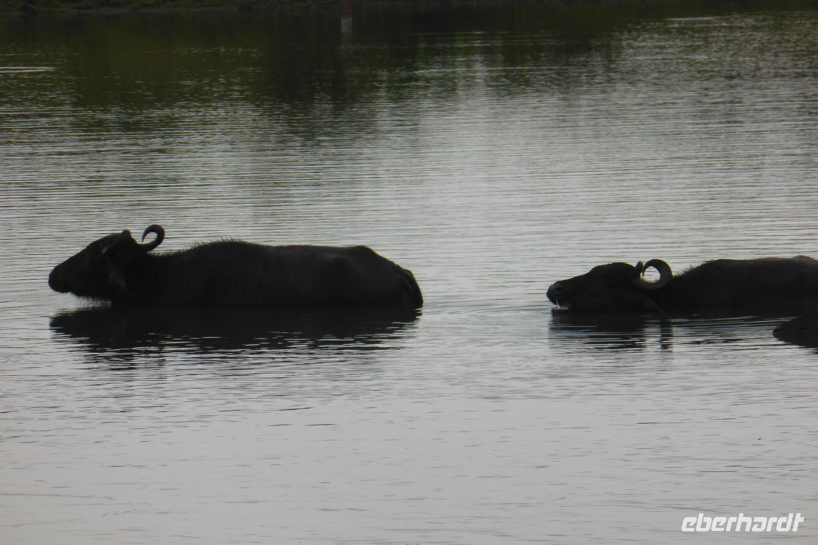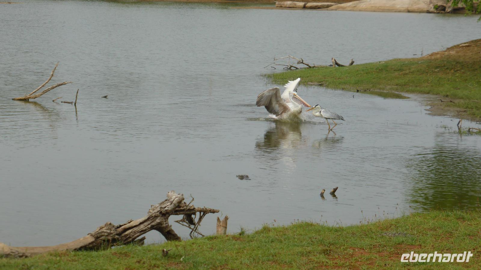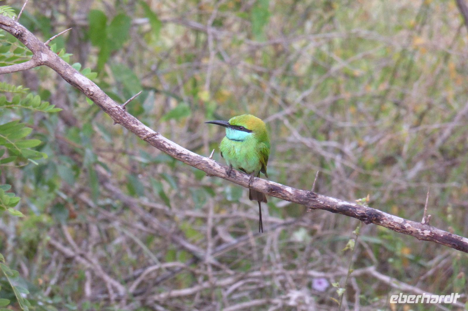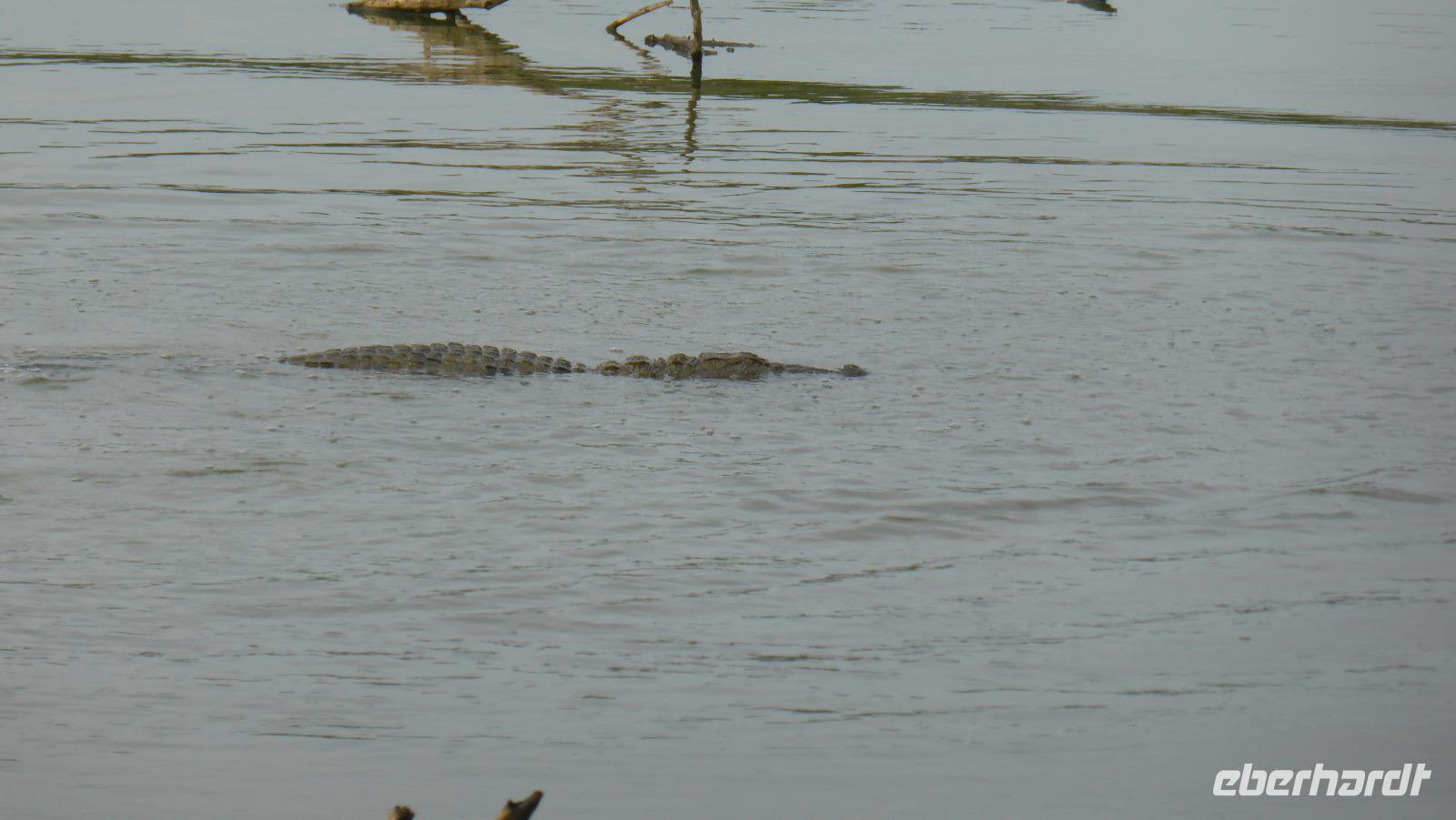 Nach etwas Wartezeit am Eingang des Nationalparks geht es los mit Tierbeobachtungen. Wir sehen viele verschieden Vögel, vom bunten Bienenfresser über Papageien bis zum Adler und verschieden Wasservögeln. Oft sind auch Pfaue zu beobachten. Es gibt auch Wildhühner, Wildschweine, Rehe, Wasserbüffel. Natürlich hoffen wir auch auf Elefant, Krokodil und Leopard. Letzterer wird uns nicht den Gefallen tun. Doch zwei Elefanten sehen wir aus größerer Entfernung im Lotusteich beim Fressen. Krokodile bekommen wir auch zu Gesicht, allerdings im Wasser, fast vollständig abgetaucht auf Beute lauernd.